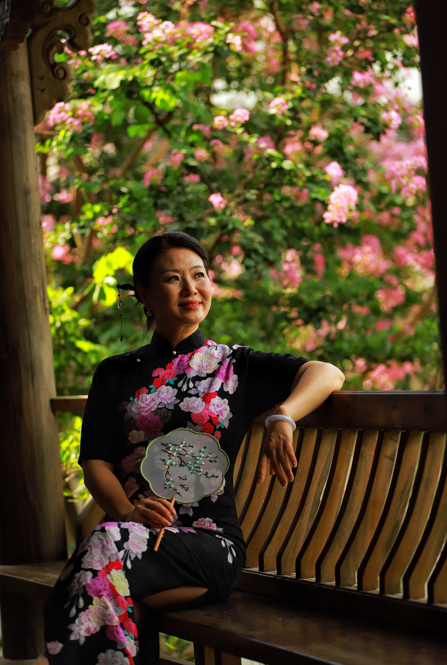 秋日里,旗袍佳人倚坐于中式园林木制长椅,黑底粉花刺绣映衬白墙灰瓦,团扇轻摇,手镯耳坠熠熠生辉。自然光下,一帧帧古典美人肖像,尽显江南风情,静谧中传承中式美学,艺术摄影定格春日美好