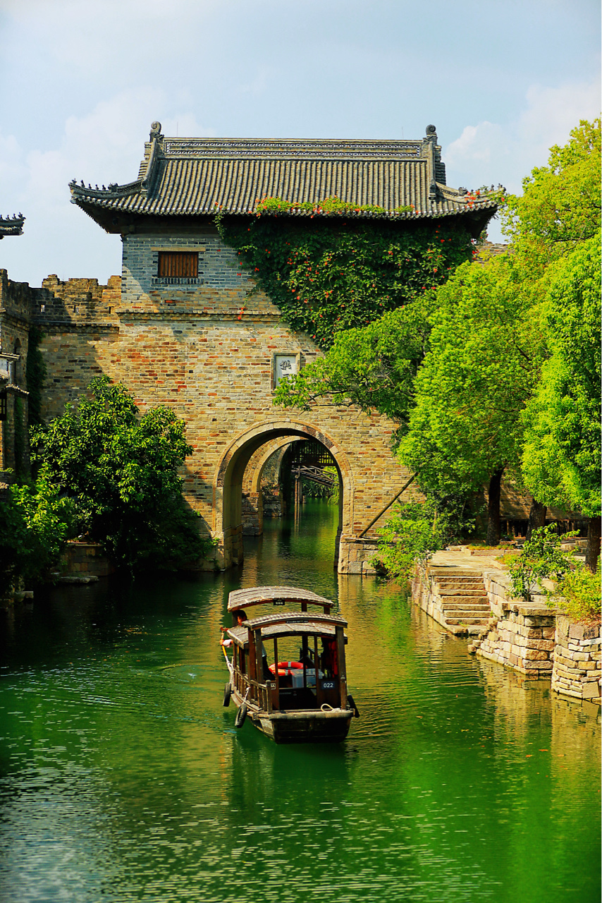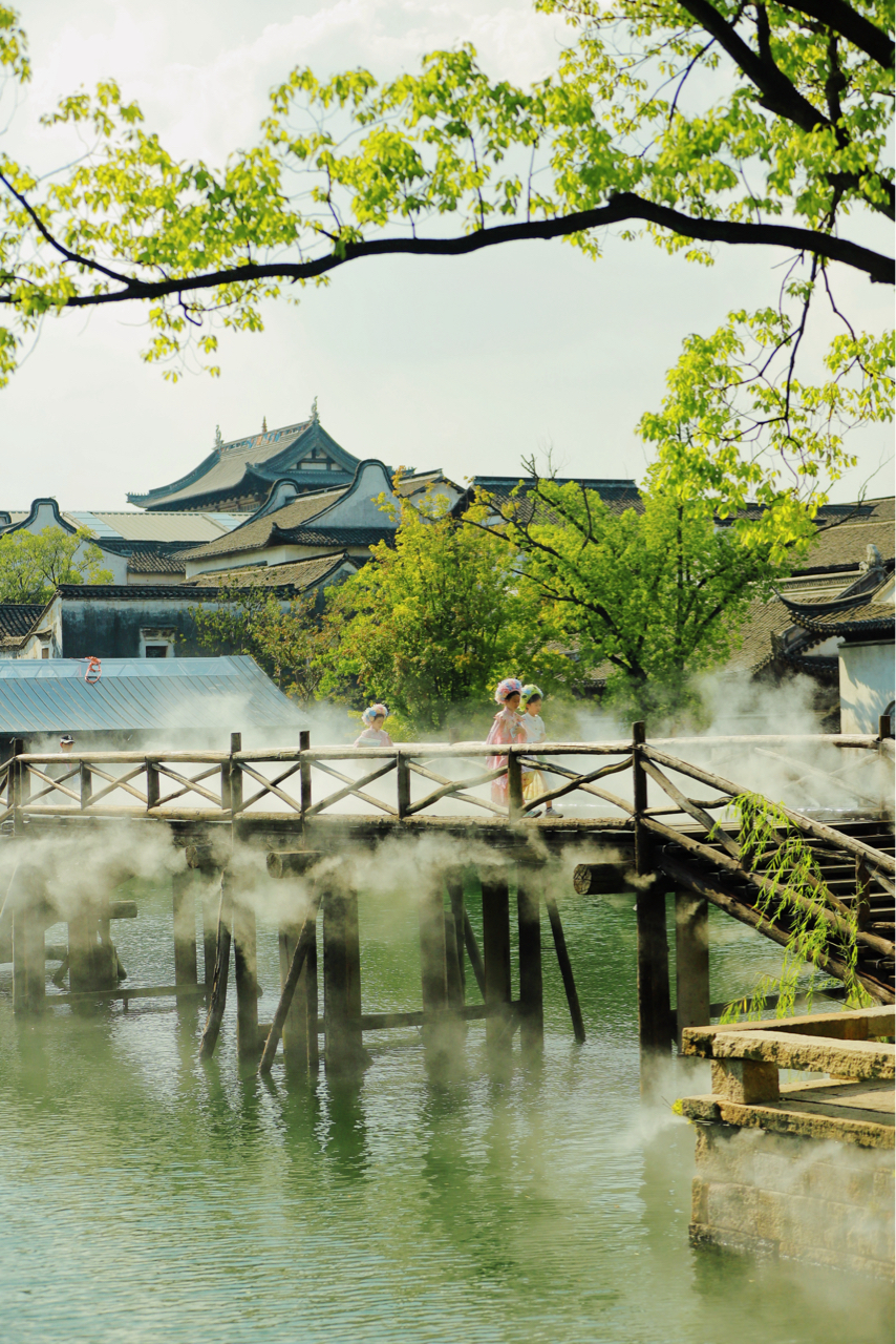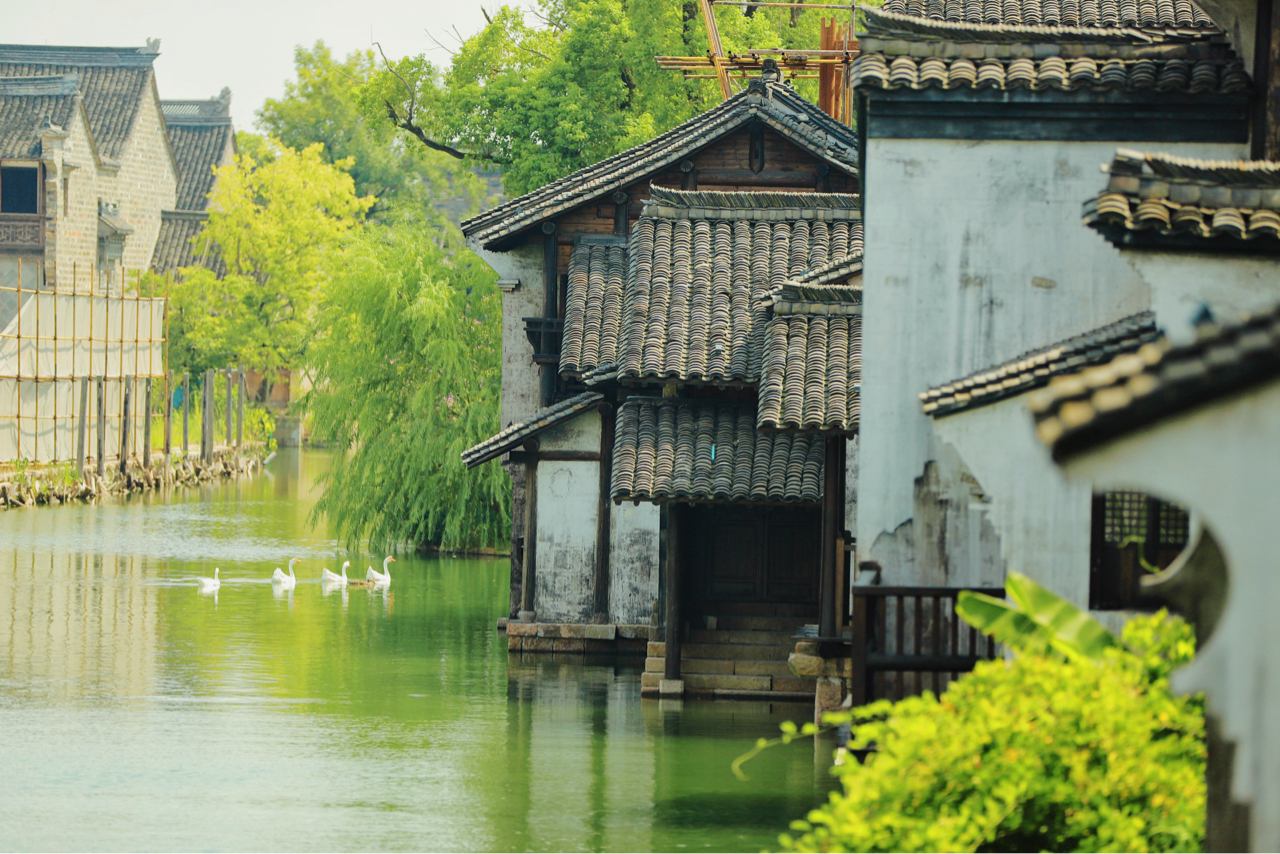盐官古城,古桥柳影,游船轻漾青瓦白墙间。白鹅戏水,木桥蒸汽绕,古城风貌醉人心。中式屋顶映砖石,绿植满庭,河塘景美如画,一步一景,不虚此行