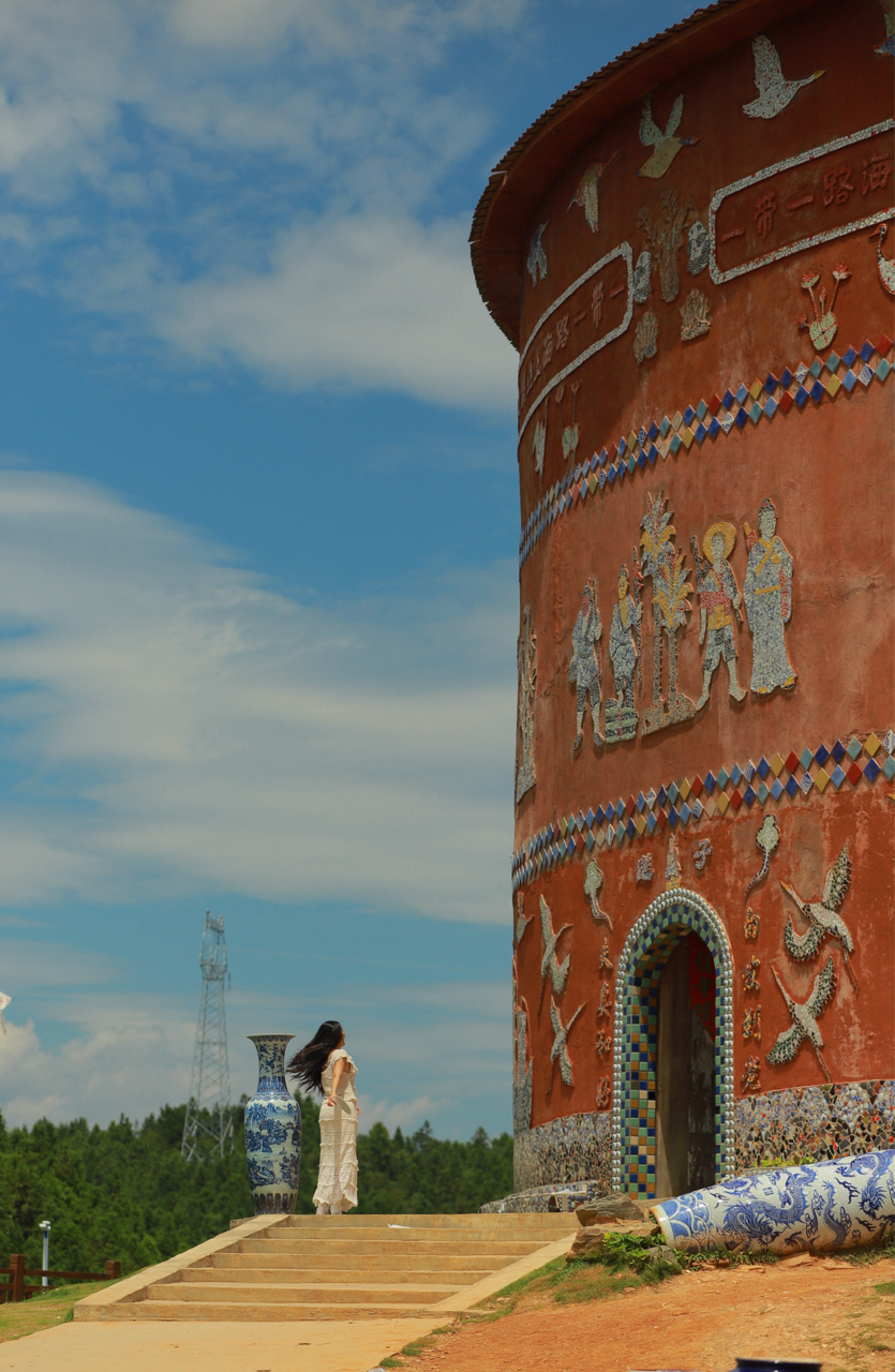景德镇陶艺博物馆里千年瓷宫超震撼!青花瓷美翻了,马赛克装饰超有创意。阶梯路径旁,古风小姐姐剪影与蓝天白云相映成趣,艺术与自然完美融合,这趟文化之旅值“瓷”一游