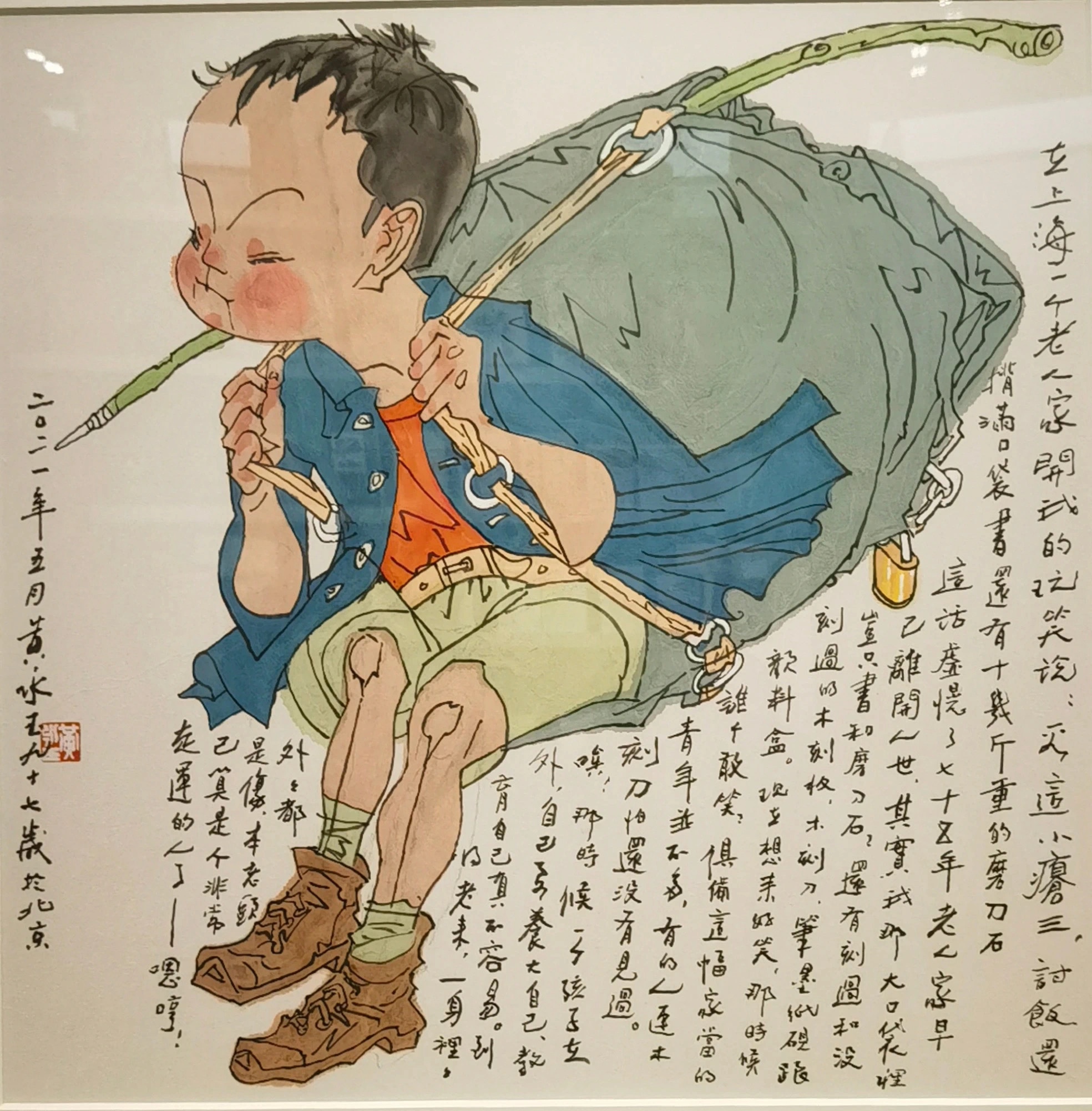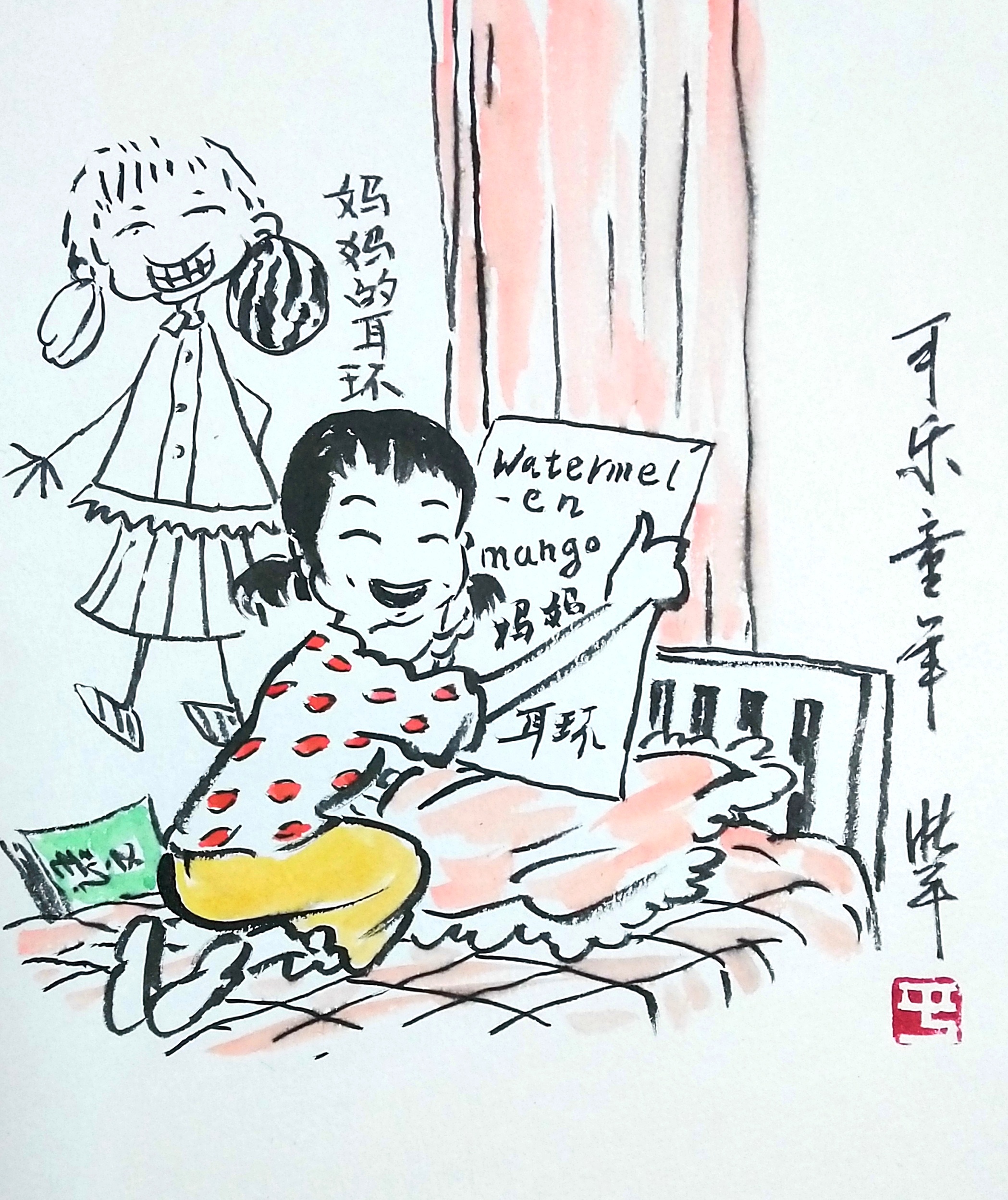 童言妙语3 妈妈的耳环与男人走 林娜 因为前几年快乐童年,据说输在起跑线上,那我这个小镇做题家出身的妈妈就开始行动了。小学二年级暑假,我开始抓孩子英语。 在住的小区报了英语剑桥少儿英语一级上册。她的小学有开英语课,所以我略过了剑桥少儿英语的预科。那个班利用暑假二十天一次上完上册,等开学再开周末班学下册。 一天一课,就跟我自己当初下决心每天背十个单词一样,看似简单,实则很难。进度太快了,每天一课,第一天十个单词不难,第二天加十个,第三天、第四天.......。为了避免枯燥,同时也巩固课文内容,我给孩子买了一套配套的练习册。每天我们先复习当天新学的,然后再预习第二天新课。但是刚接触英语背单词,而且我要求打牢基础,每个单词会背还会默写,单词量又这么大怎么办? 我向来主张愉快地学习。于是我绞尽脑汁把单词拟人化,例如芒果mango 我给拆分成man 和go 这样一个单词变成了三个词,男人、走和芒果,她一下子记住了三个单词。西瓜watermelon,我给说成了水water 瓜,铅笔是pen 笔加cil。而照片的单词photo,孩子默写时很容易丢最后一个字母O。于是我说:妈妈喜欢戴耳环,一边一个,对称,你可不能丢了妈妈的一个耳环,中间一个T两边都有O。从此,她默写再也没有写错过photo。 等到暑假结束,学完了一册。所谓良好的开端是成功的一半,开学每周末一次课就很轻松了。然后去参加剑桥少儿英语统一考试,笔试、口语和听力全部是五个星。名字写在大红纸上贴在英语学校的墙上。她是年龄是最小的学生。后来办班的老师说,再也不办暑假这种速成班了。因为一个班,真正学出来的只有两个学生,一个是我家孩子,另外一个是六年级的大孩子,其他孩子都必须重新回炉。看来妈妈的耳环果真有效,虽然现实中真实的我从不带耳环也没有打耳洞。 第一幅画是画家李浙平应我之邀特地画的。 第二幅照片我在路上见到有感随手拍的。 第三幅画是在黄永玉先生画展上所拍