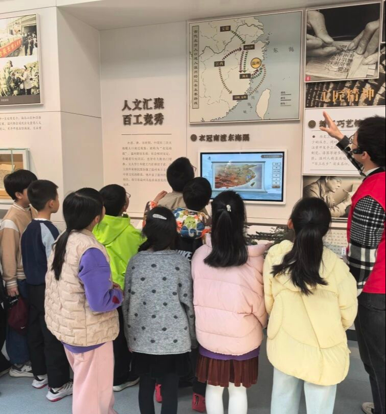 百人千场进万站丨杨府山社区新时代文明实践站:"走近温州先贤 传承浙商精神"实景赋能宣讲活动 为深入学习宣传贯彻党的二十届四中全会精神,弘扬优秀传统文化和新时代奋斗精神,杨府山社区新时代文明实践站组织温州大学附属第一实验小学的同学们走进位于会展路1288号的世界温州人博物馆开展百人千场进万站丨"走近温州先贤 传承浙商精神"实景赋能宣讲活动。以"行走的实景课堂"形式,将全会精神学习与地方历史文化教育有机结合,推动全会精神在青少年心中落地生根。 本次实景宣讲以博物馆“千年潮起”“百年潮涌”“时代潮头”三个单元为阵地,打造沉浸式体验。宣讲员循着温州商业发展脉络,从唐代海外贸易兴起、南宋海上丝绸之路繁荣,到明清跻身全国商业中心,再到近代先贤远渡重洋的谋生艰辛与实业救国的赤诚,结合现场淡黄色绒线衣、骨雕龙舟“一帆风顺”、新加坡温州会馆牌匾等展品背后的“世界故事”,溯源温州深厚文化底蕴与商业传承,生动诠释讲述了温州先贤在党的领导下,团结奋斗、开拓进取、回报家乡的感人故事,同学们纷纷表示,通过学习党的二十届四中全会精神,更加理解了温州人精神背后是中国特色社会主义制度的坚强支撑,将牢记奋斗初心,坚定制度自信,传承先贤薪火,在学习和生活中勇于创新、直面困难,争做担当民族复兴大任的时代新人。 此次宣讲活动,让同学们直观领略了温州深厚的历史文化和商业文明。孩子们在聆听展品背后的浙商故事后,深刻体会到幸福生活来之不易,纷纷表示要以先贤为榜样,传承吃苦耐劳、开拓创新的精神,努力成长为担当民族复兴大任的时代新人。