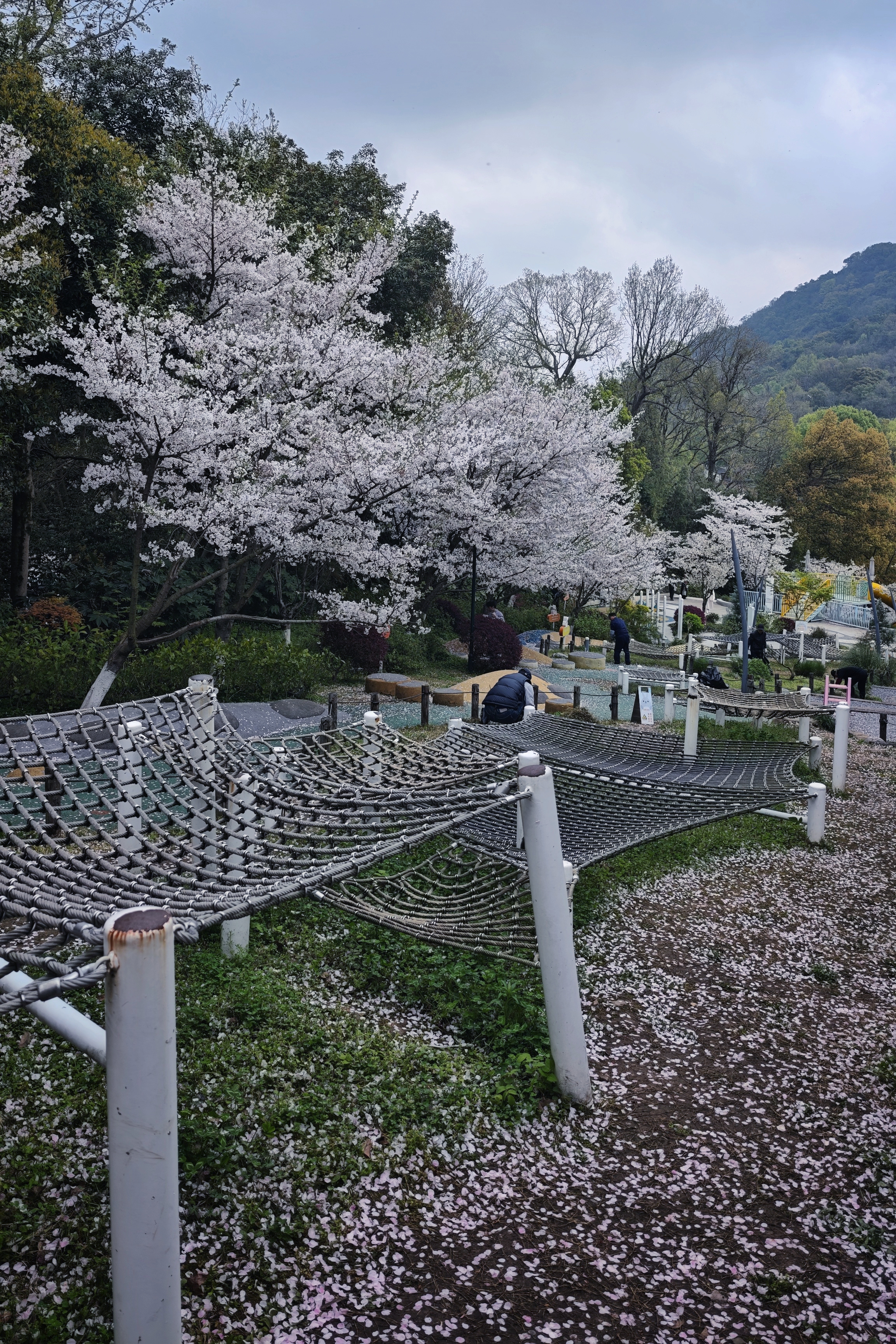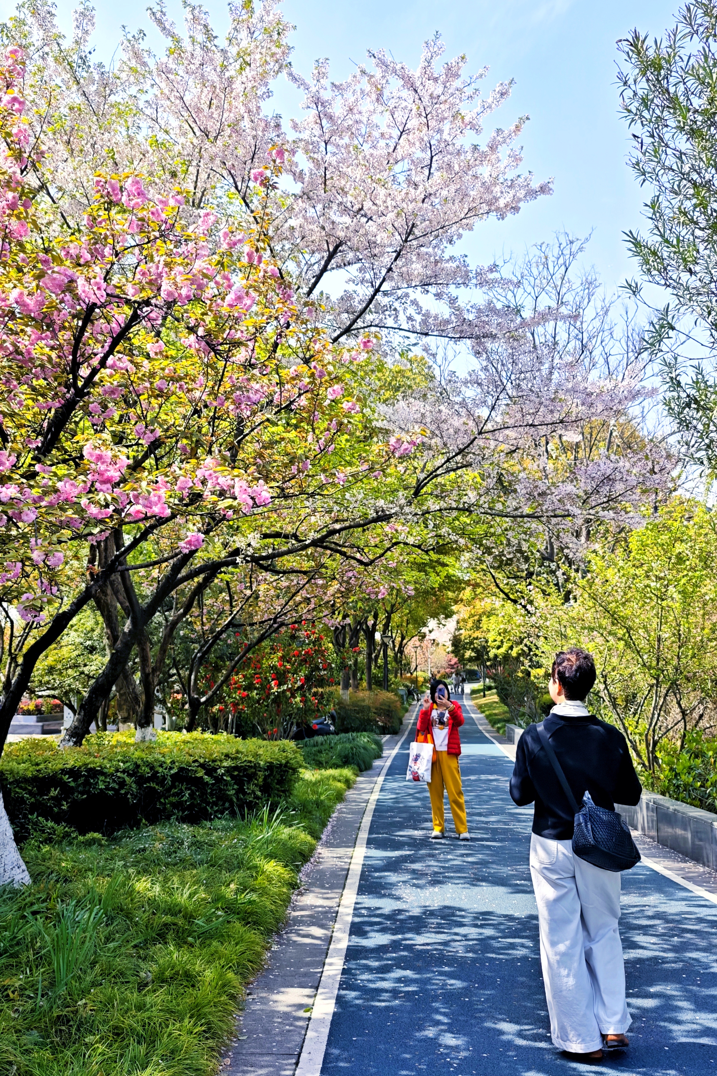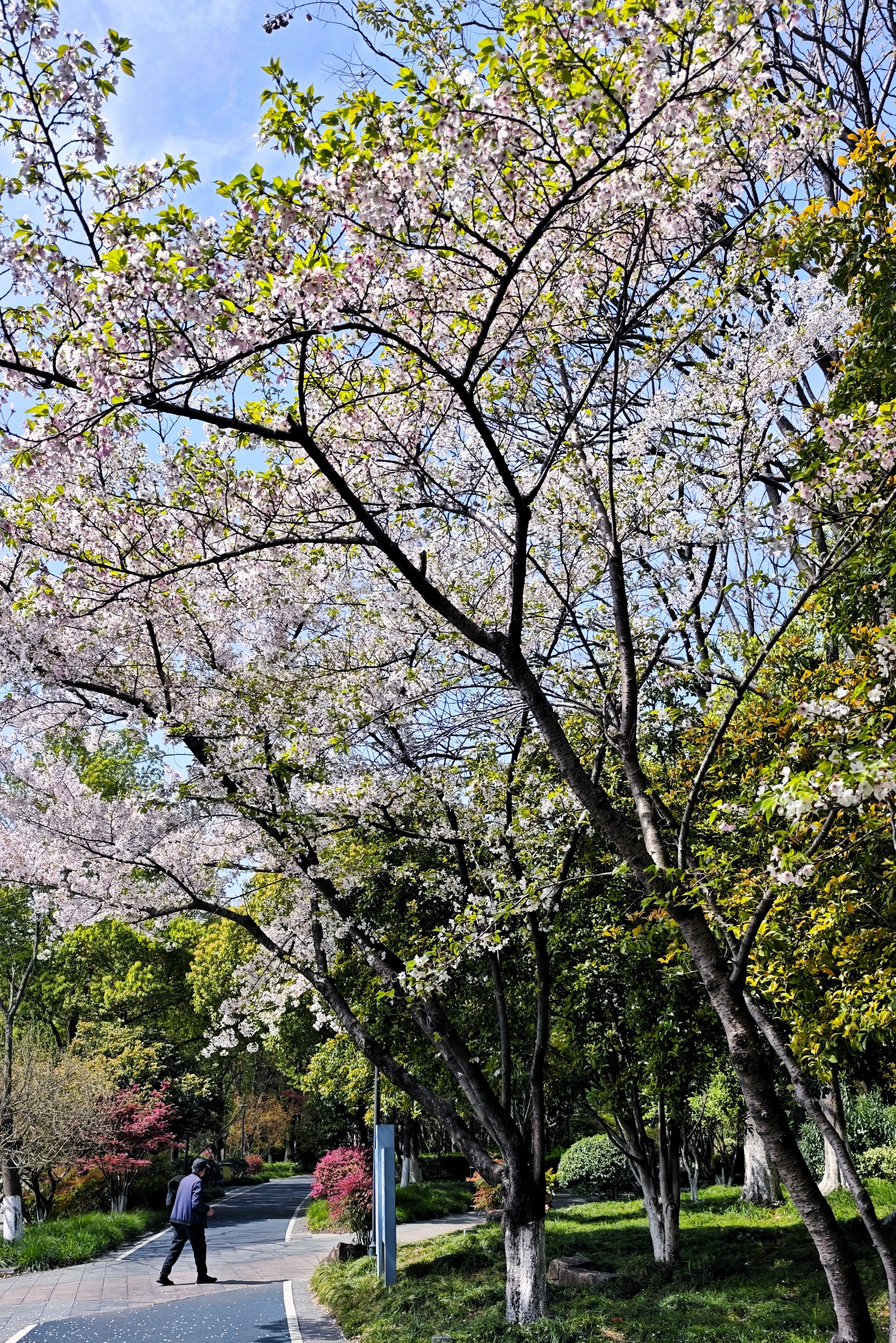 春日的阳光穿过层层叠叠的樱花,在步道上洒下斑驳的光影。风一吹,粉白的花瓣簌簌落下,像一场温柔的樱花雨,把整条路都裹进了春天的浪漫里。