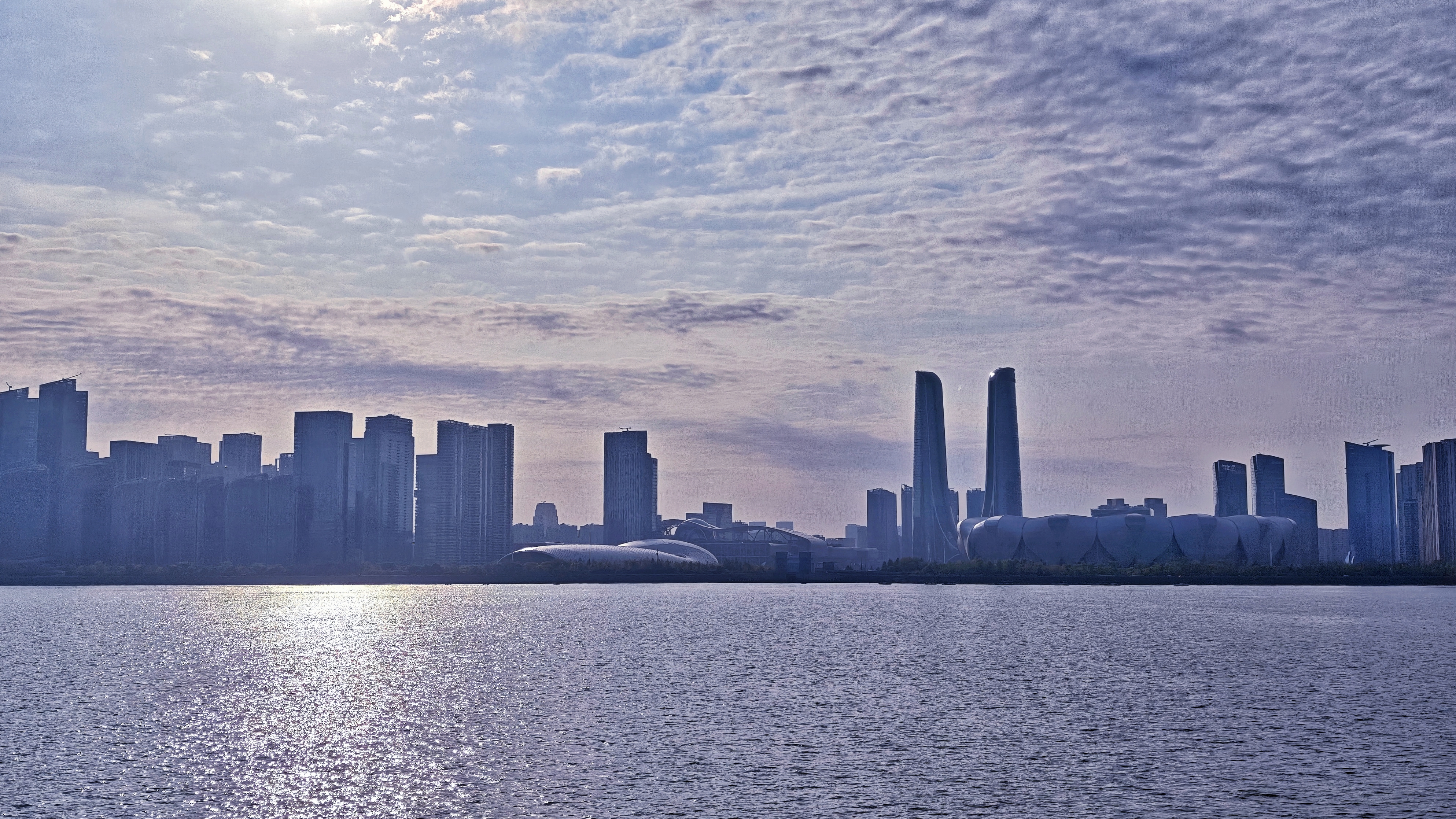 钱塘江上潮声起, 天际楼群入画来。 云漫长空,金波万顷, 一城风月,尽在眼前。