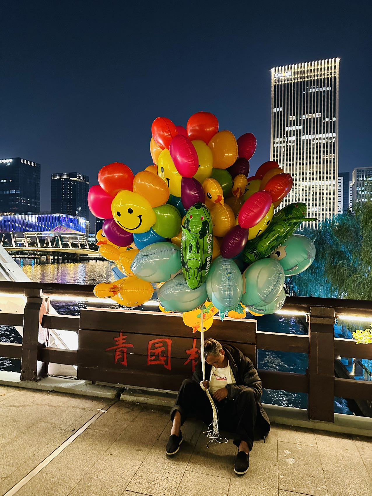 笑的,是气球;不笑的,是生活 文/蓝色咖喱粉 晚上8时半,我去西湖文化广场的超市,路过运河上的一座步行桥时,看见桥栏杆上漂浮着一大团五颜六色的氢气球,顺着氢气球往下看,一位老伯坐在地上,背靠着桥栏杆,大概太过疲惫,耷拉着脑袋打起了瞌睡。这几日虽略有降温,但毕竟已是五月,接近三十度的气温了,过往的行人大多都是短袖,最多也不过是一件薄外套,他却还穿着棉袄,敞着怀,手上密密匝匝地绕着氢气球的线头,再顺着那线头往上看,一个个饱满的气球挤挤挨挨,生气勃勃,那鲜亮的颜色,即便在夜色中也很醒目。坐在这人来人往的桥边打瞌睡,到底是睡不安稳,老伯大概是感觉到了什么,突然动了动,半睁开眼睛失焦地看了看对面,然后把头一歪,继续打起瞌睡来。 半个多小时后,我买好东西出来上了步行桥,一抬头,又看见一大团氢气球,不过这次的氢气球是在移动的,老伯正举着这么一大把氢气球,在桥上来回走着招徕生意,这时已经9时多了,工作日的晚上,在外面玩的孩子本来就不多,这个时间点了,连行人都慢慢寥落了,没有一个顾客来买气球,大爷就举着那一大把氢气球,默默地走来走去。 这时桥上出现了几位城管,客客气气地劝导一位乞讨者离开,这位乞讨者很年轻,身穿骑行服,脸上被大半面罩遮住,身边上还停放着辆公路自行车,看起来像位骑行客,据说是骑车旅行到杭州,途中丢了钱,希望能有好心人资助他回家的路费。细想一下,就会发现这说法漏洞百出,现在基本都是移动支付,出门在外很少会有人携带大量现金;城管又去劝说另一位带着年幼女儿在桥边弹吉他唱歌,据说募钱给太太治病的男子离开,男子不肯,城管劝:“你想想你女儿,这么小的小孩,晚这么晚了还在外面,对孩子不好。”…… 桥上的人越来越少,老伯举着气球拖着迟缓的脚步,慢慢地下了桥,我走在他后面,有几个气球上印着大大的笑脸图案,搭配那明艳的鲜黄色,那笑脸越发显得肆意而张扬。 笑的,是气球;不笑的,是生活。