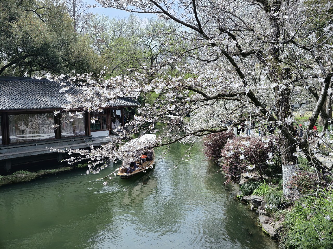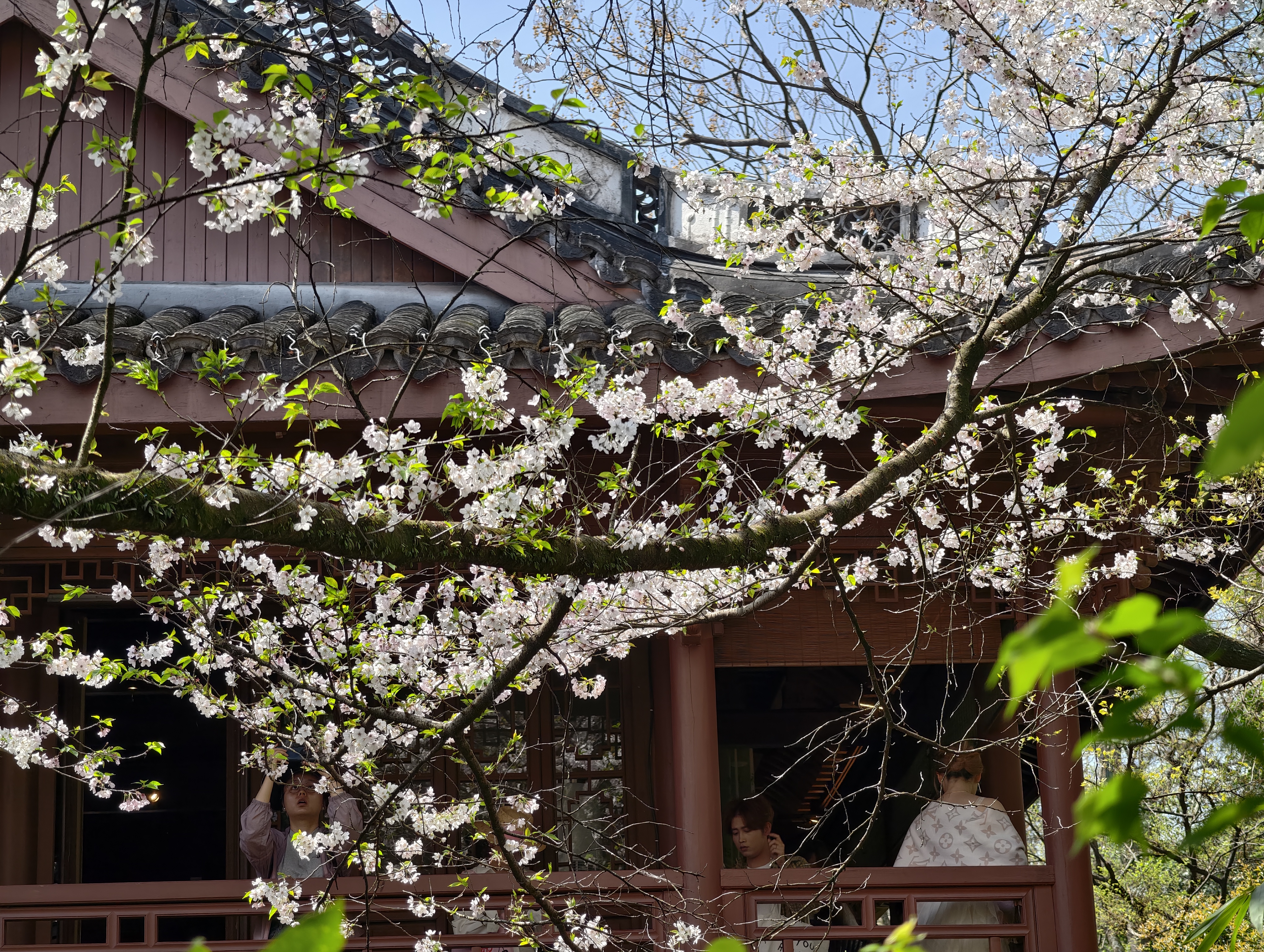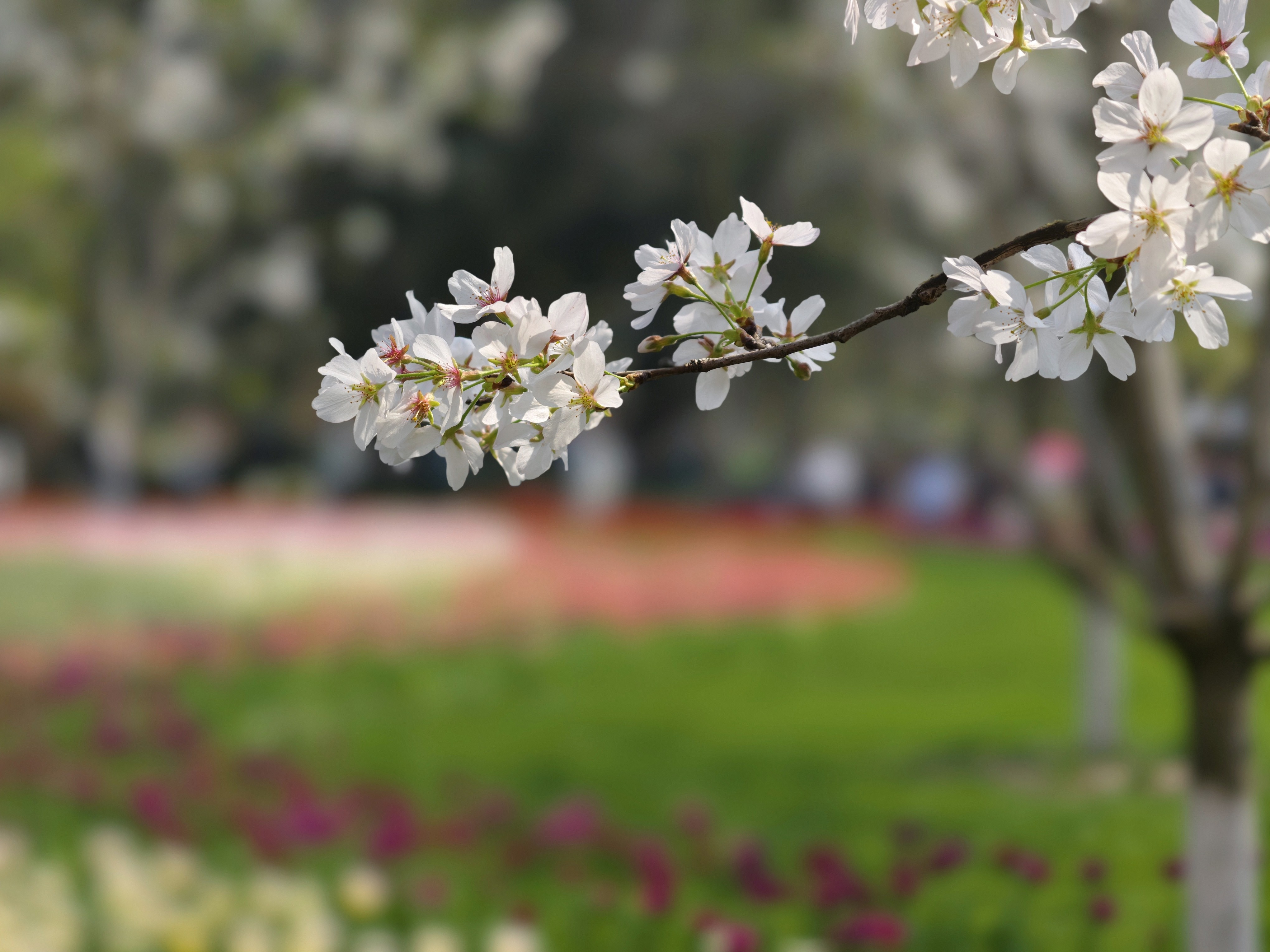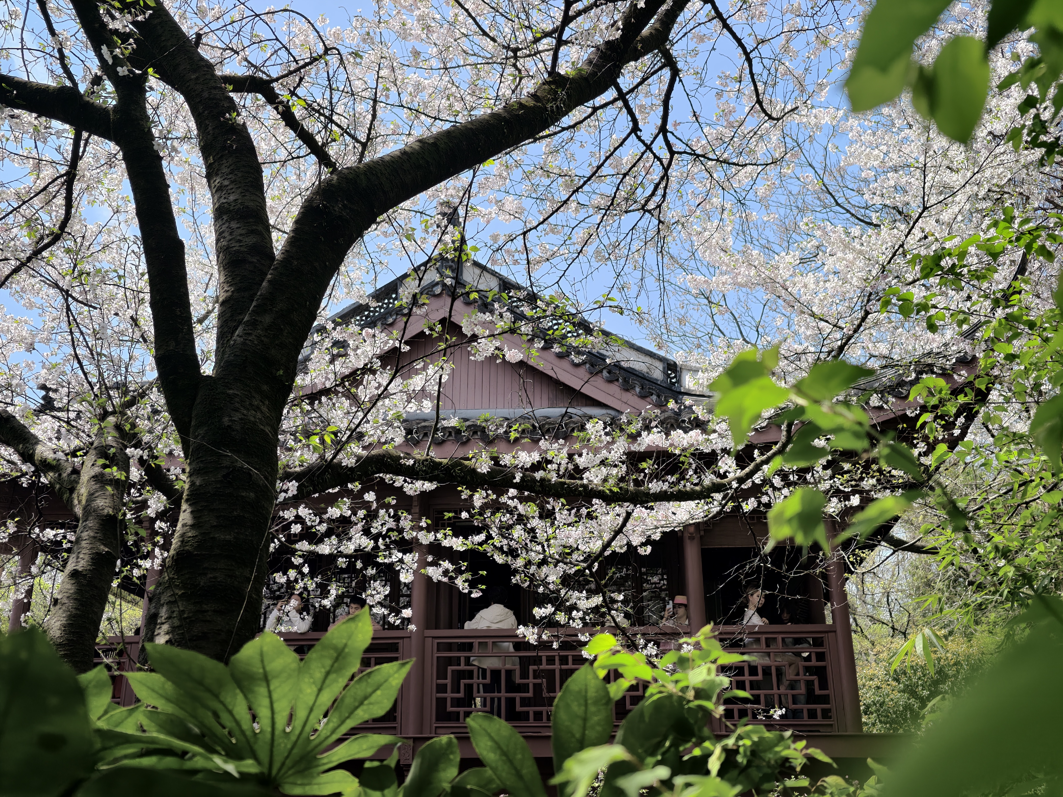 樱花绽放的季节,坐在樱花树下,赏花、喝茶、看风景,心情很好啊!