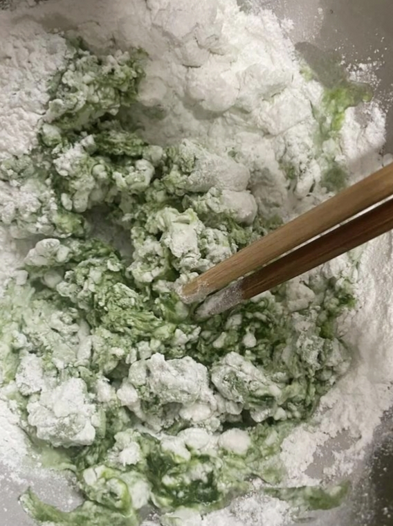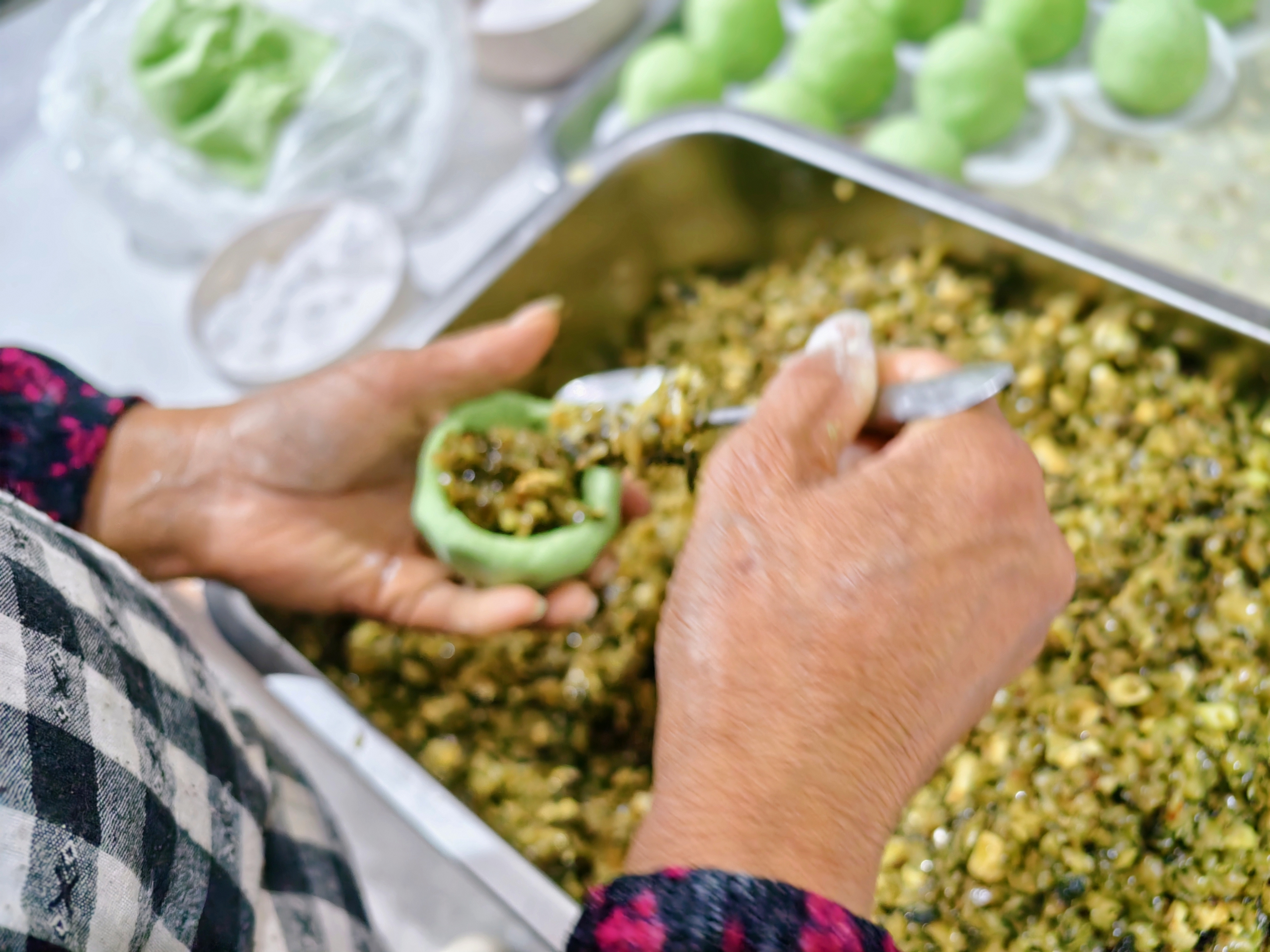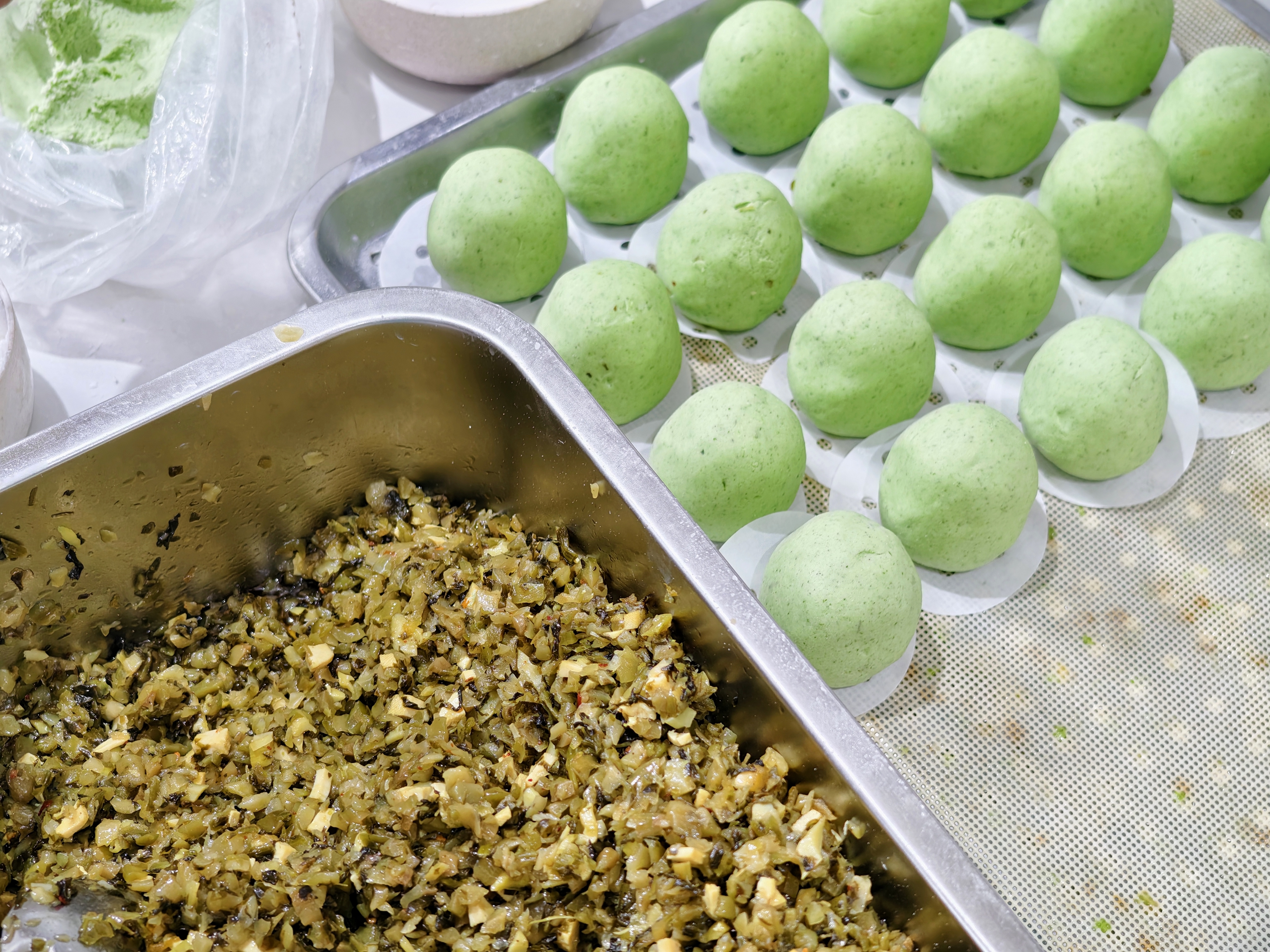 这样的清明团子,其实是老底子农村里最常见的那种,里面馅子很简单,有笋丁、咸菜、放点肉丁,(放肥肉的居多),喜欢吃辣的再放点儿。辣椒🌶,吃的就是春天的味道。那天去乡村玩,看小店里有人在包团子,是现包现卖的那种,我随手拍下照片。