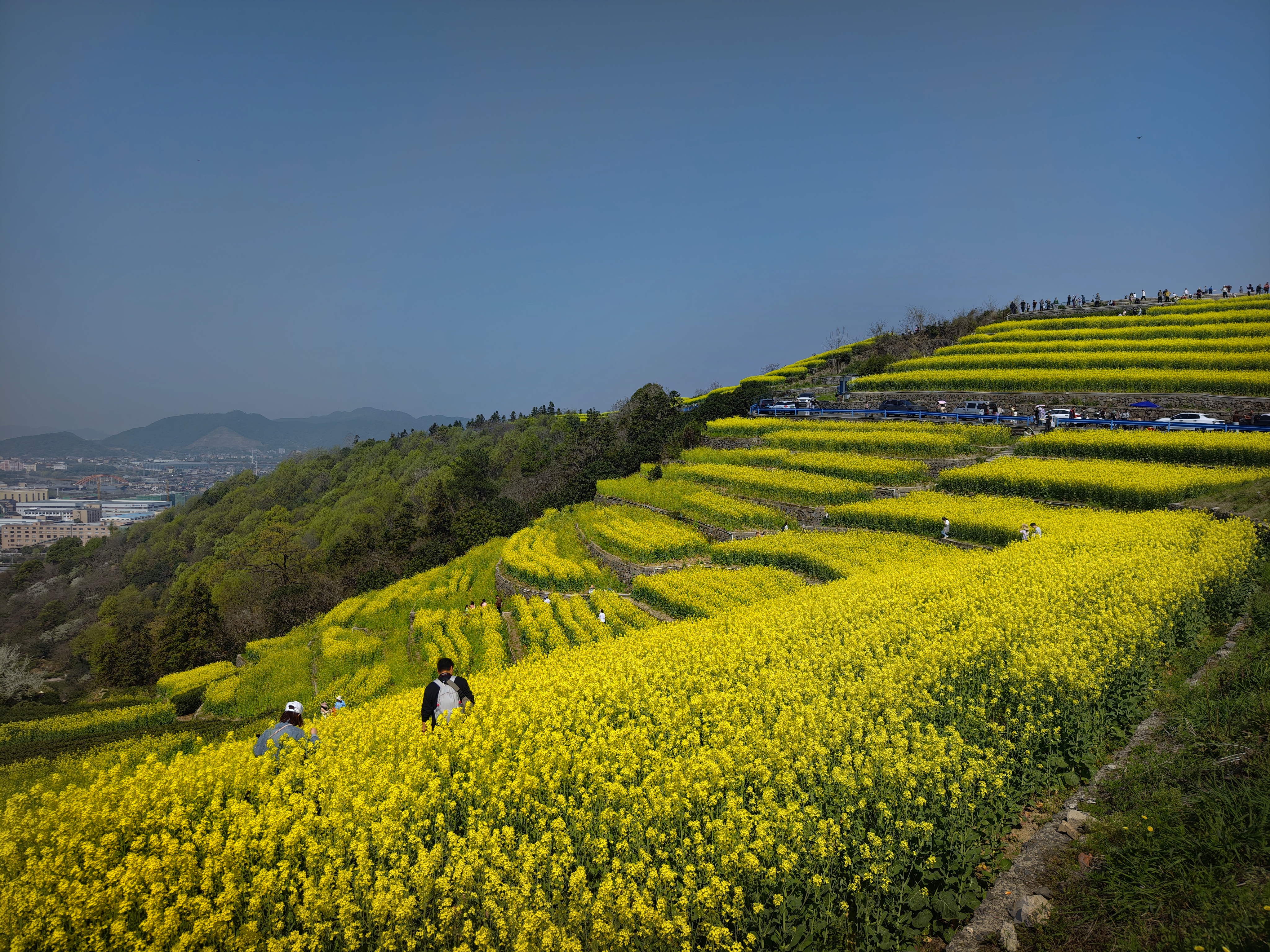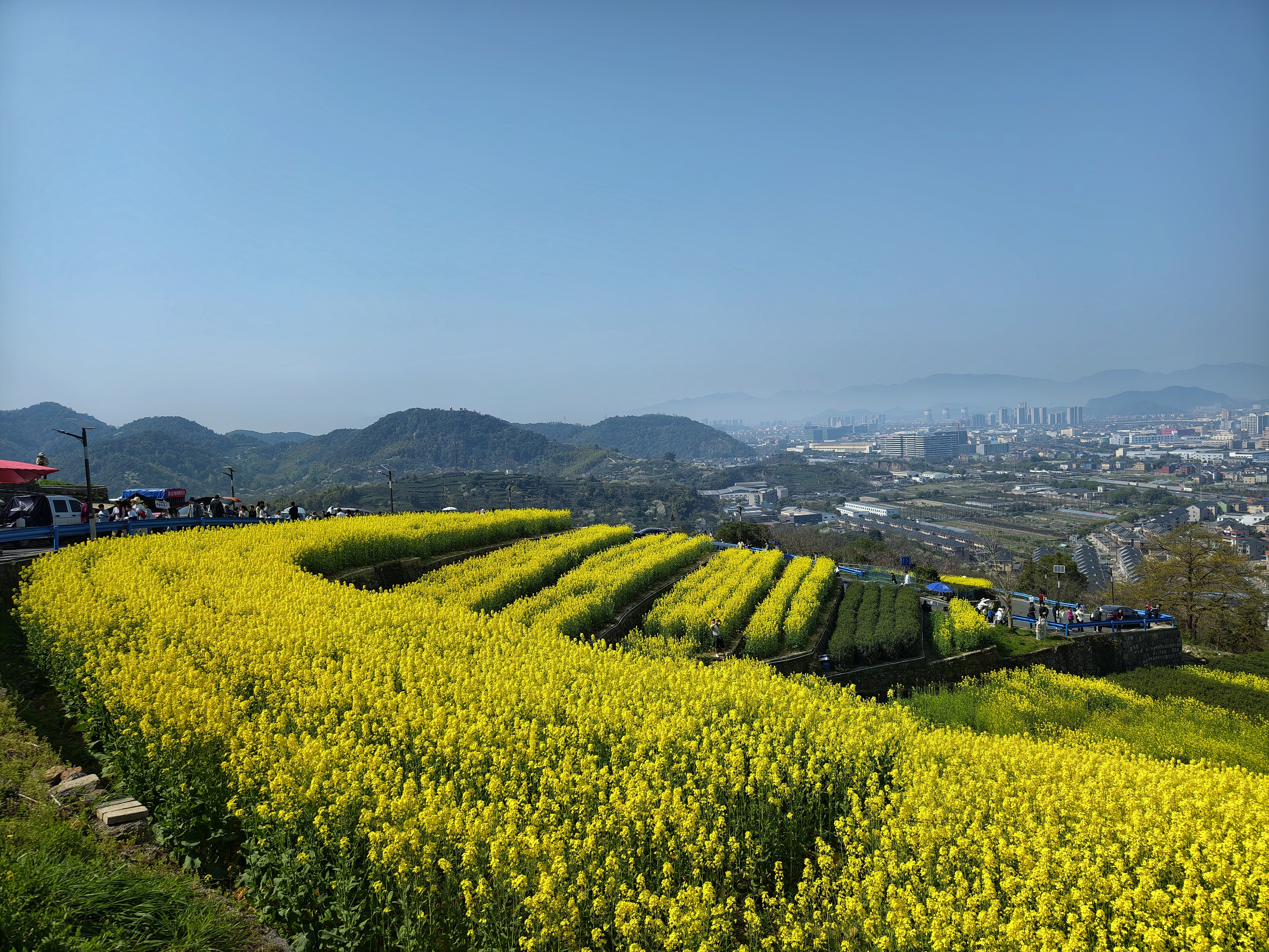 萧山里王的梯田油菜花,顺着山势层层叠叠地递进铺展。从山脚看,一整座山的金色漫山遍野,从山顶看,金色的梯田、灰白的山路、零星的村落,还有远处有点朦胧的城市轮廓美成一幅画!站在山顶的现景台放眼望去,犹如画家一笔一笔把春天描在天上,风一吹,整片山都在轻轻“晃动”,带着一泥土味和花香,这是近几年声名鹊起的,观赏油菜花的好去处!