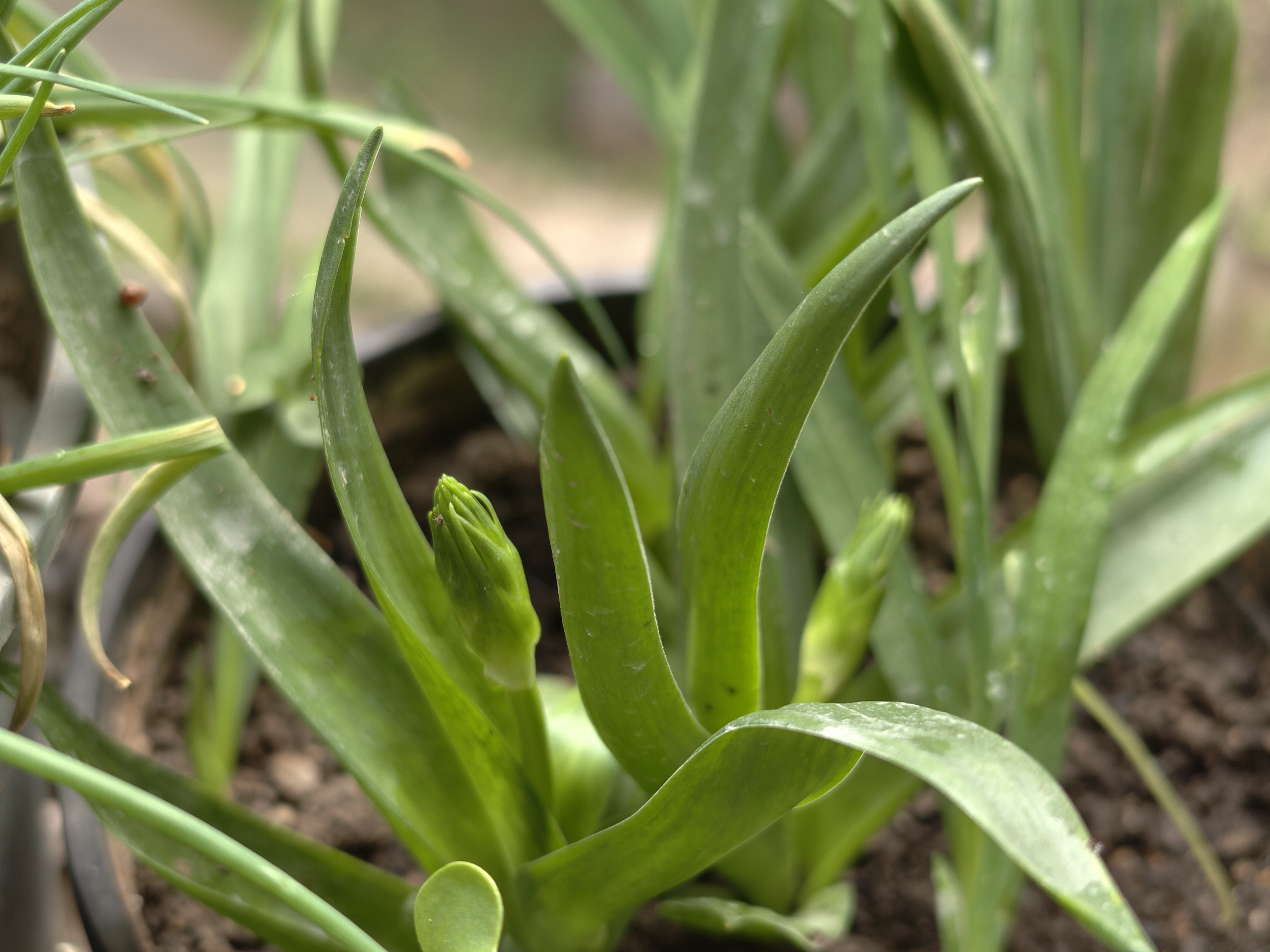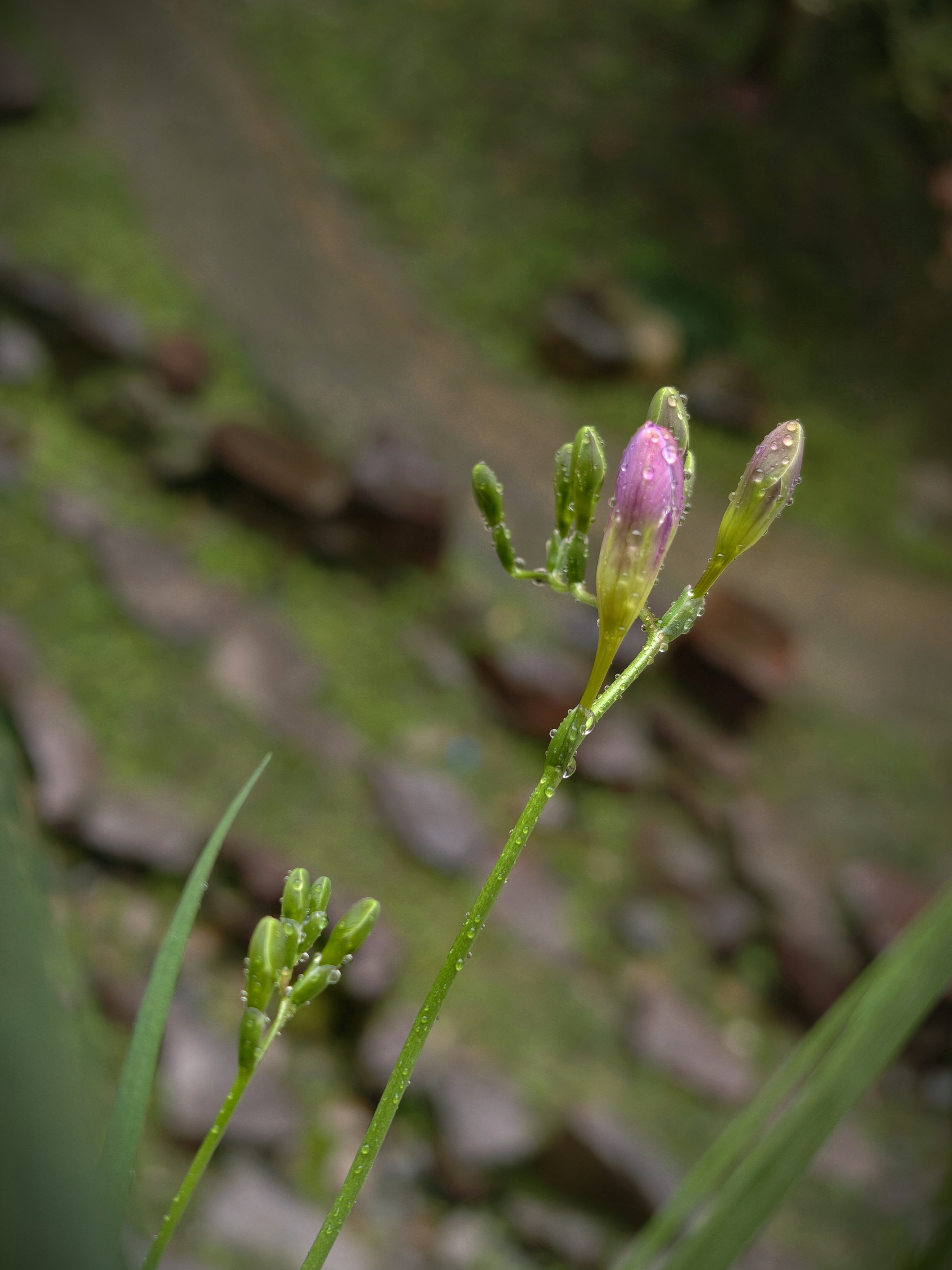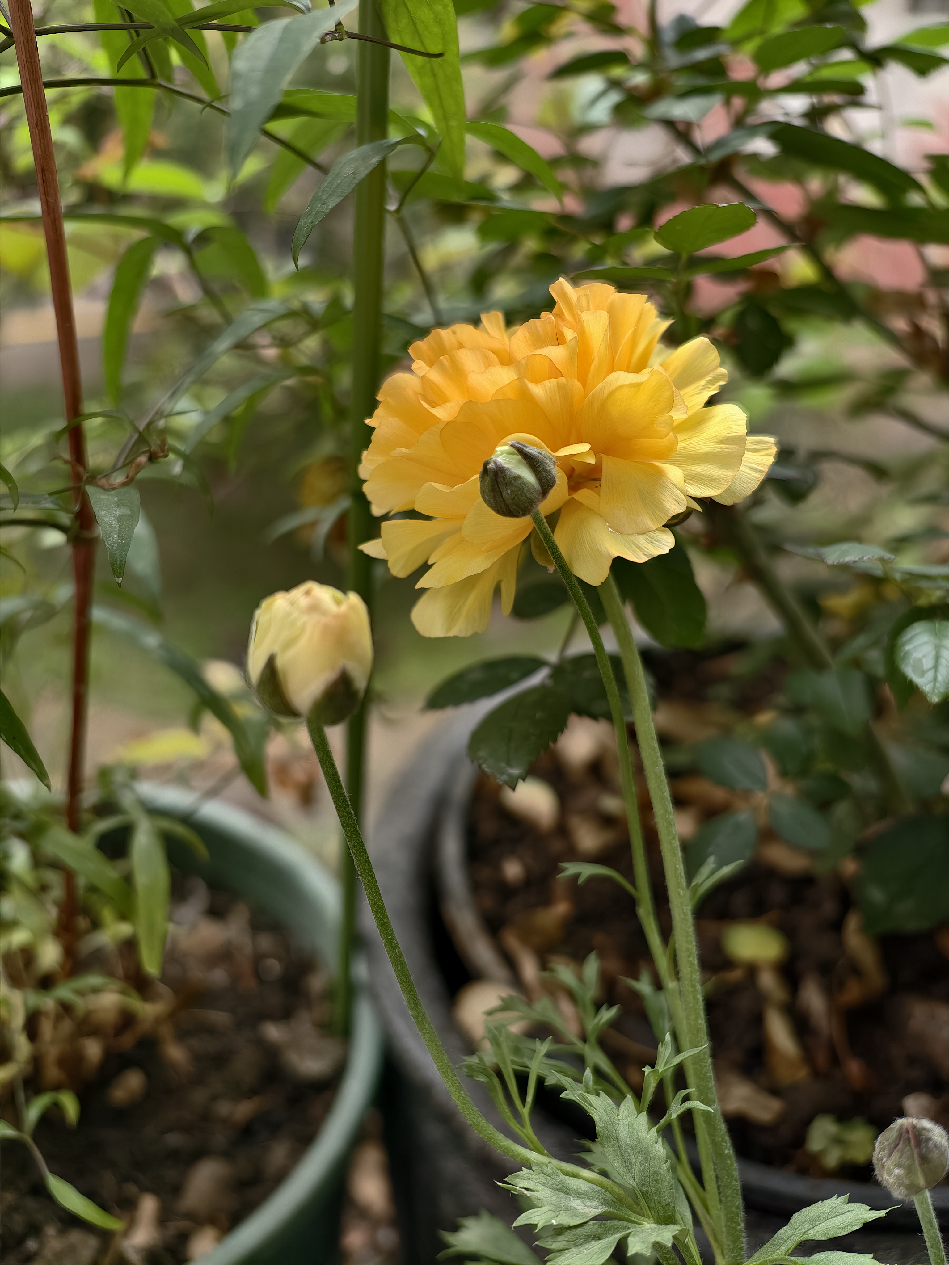 今天是个下雨天,阳台上经过雨水滋润的花花草草的,生动又水灵。黄色的重瓣花等开的很好看,月季花、圣心百合与与铁线莲花等花,正待静静地酝酿着即将绽放,番茄苗与番薯藤又茁壮了许多……