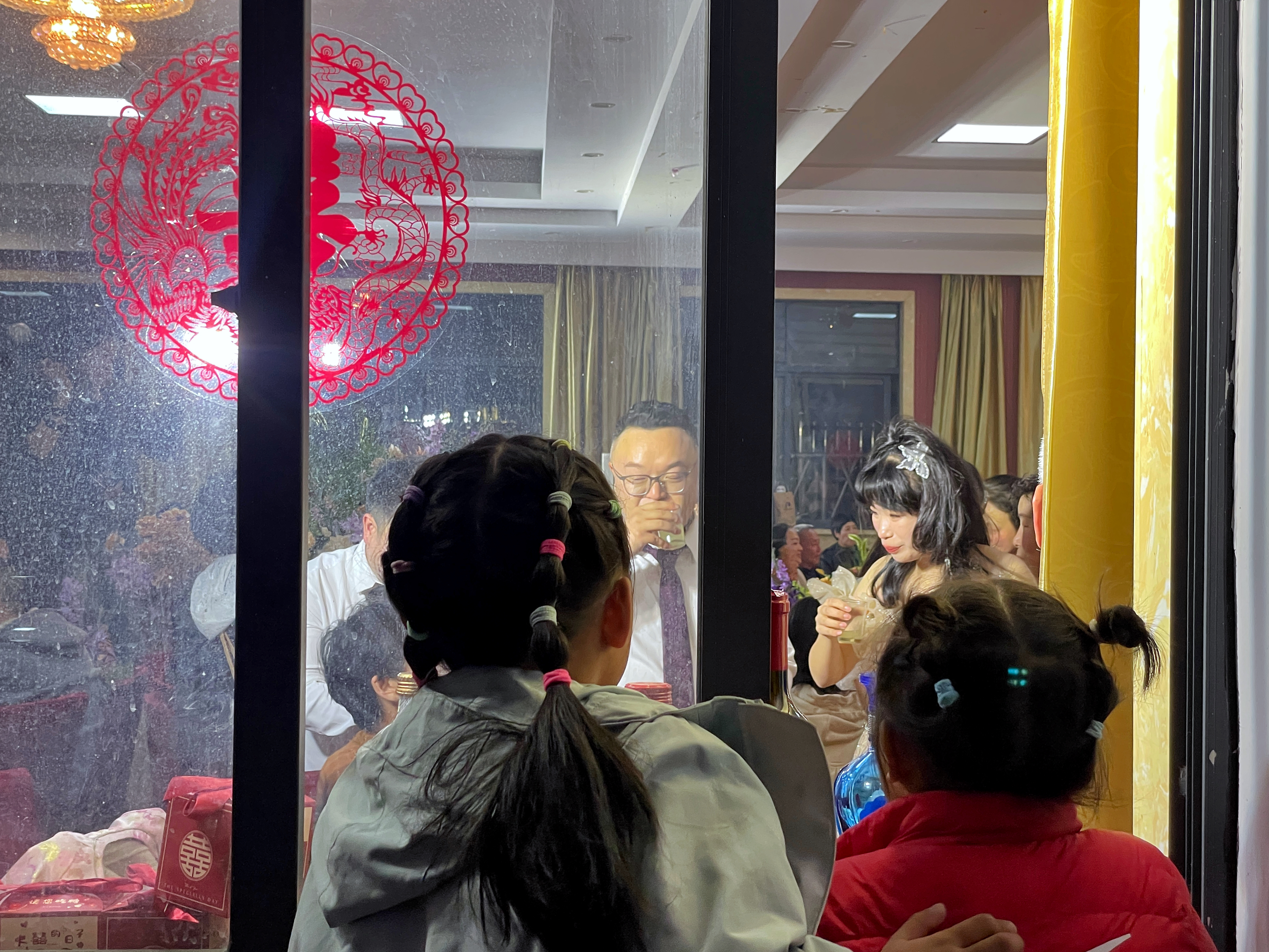 《窗里的喜宴,窗外的凝望》玻璃上的龙凤双囍剪纸红得热烈,两个小小的身影趴在窗前,鼻尖几乎贴住微凉的窗面,目光追随着屋里那对正在敬酒的新人。我拍下了的这张照片,就像亨利·卡蒂埃·布列松所说的“决定性瞬间”——在有限的光影里,藏着最动人的人间烟火与情感褶皱。 屋里的新郎穿着洁白的衬衫扎着领带,举杯时镜片后的眼神温柔而郑重,身边的新娘鬓边别着银饰,指尖轻捏着酒杯,笑意里藏着初为人妻的羞涩与溫柔。他们穿梭在宾客之间,每一次碰杯都是对过往的致谢,每一句问候都是对未来的期许。“感谢各位长辈拨冗赴宴,见证我们从相识到相守的时光;感谢朋友们一路相伴,在我们迷茫时托举彼此;更要感谢双方父母,用半生的爱为我们铺就今天的路。”新郎的声音透过玻璃隐约传来,带着微颤的真诚,“往后余生,我们会像今天这样,握紧彼此的手,把柴米油盐过成诗,把风雨坎坷走成坦途。” 窗外的孩子仰着小脸,眼里盛满了对这场热闹的好奇,也藏着对“幸福”最懵懂的感知。她们或许不懂敬酒词里的深意,却能从满室的灯光与笑声里,触摸到这场仪式的温度——那是两个家庭的融合,是一段新旅程的启航,也是无数人用爱编织的祝福。而这扇窗,恰好成了最好的画框,将屋内的喧嚣与窗外的宁静、成人的郑重与孩童的纯粹,框成一幅流动的生活图景。 布列松说,好照片是绘画、构图、造型与几何的融合。我拍的这张照片里,窗棂的竖线分割出虚实空间,剪纸的红与新人的白纯形成鲜明对比,孩子的背影与新人的侧影构成微妙的呼应,灯光在玻璃上晕开的光斑则为画面添了几分朦胧暖意。没有刻意的摆拍,没有华丽的滤镜,却在不经意间捕捉到了婚宴最本质的内核:幸福从来不是舞台上的表演,而是藏在每一个凝望的眼神、每一次碰杯的声响、每一句朴素的致谢里,在有限的瞬间里,绽放出无限的温柔与力量。 当新人的酒杯再次举起,当窗外的孩子轻轻踮起脚尖,这场喜宴便不止是两个人的庆典,更是一场关于爱与传承的温柔叙事,在光影里缓缓流淌,成为岁月里最珍贵的印记。#婚宴纪实 #布列松式瞬间#婚礼宾客互动#镜头里的故事#