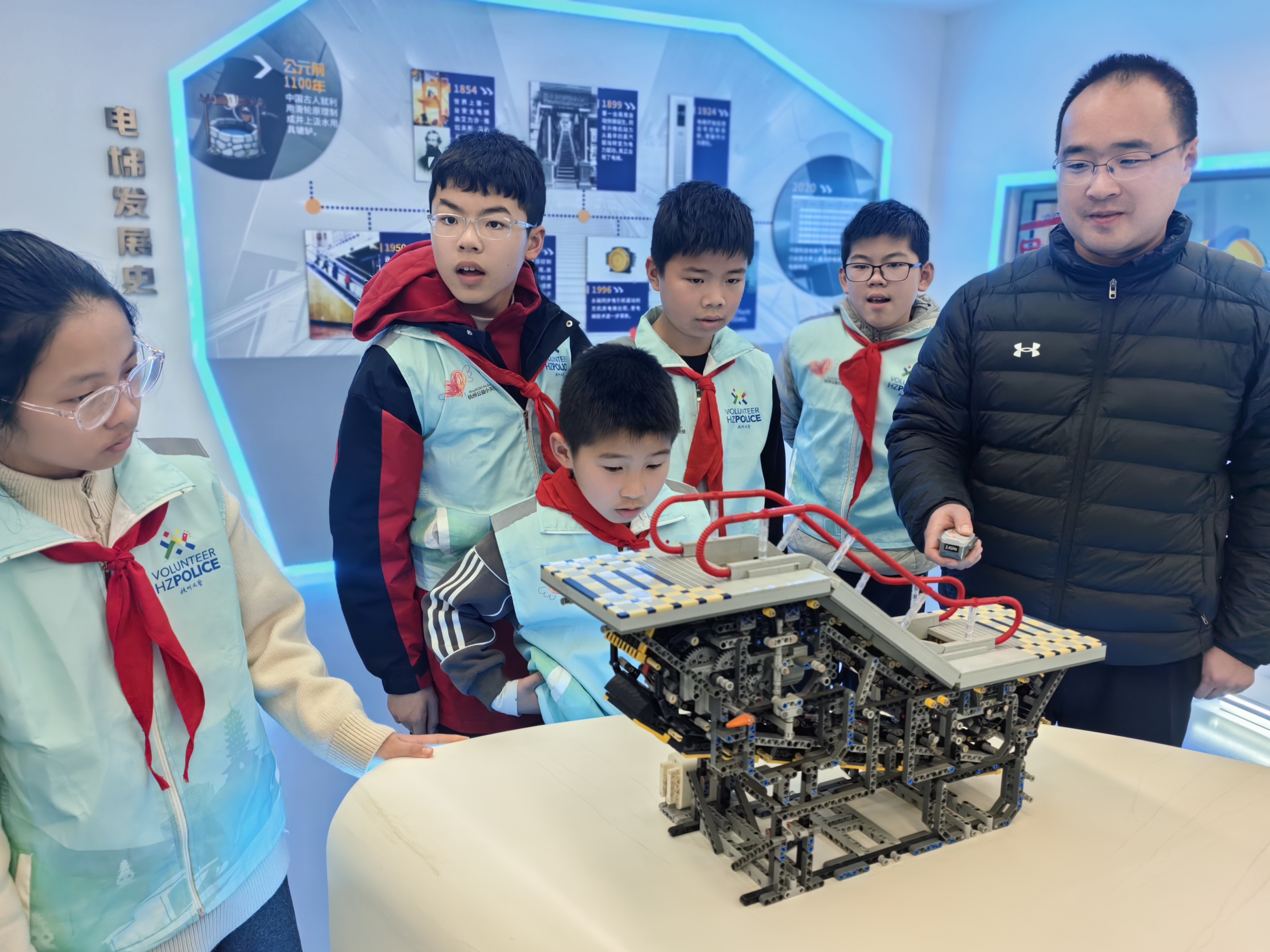 今天,我很高兴参加了杭州市特种设备检验科学研究院公益活动。我们先乘坐电梯来到会议厅,由老师为我们讲解乘坐直梯和扶梯的正确方法。老师告诉我们,在乘坐扶梯时不能打闹,也不要把扶手当作滑梯,以免发生坠落危险;手不能放在门缝处,以防夹伤。遇到紧急情况时,要先按下黄色的急停按钮,再拨打96333求助。如果有携带大件行李或是推婴儿车,一定要乘坐直梯。 接着,老师带我们来到参观厅,那里摆放着一组遥控电梯的乐高模型。通过模型,老师为我们讲解了电梯轿厢门和厅门之间的联动关系。随后,我们还戴上3D眼镜,仔细观察了电梯的各个部件,了解了为什么即使六根钢丝绳全部断裂,电梯也不会坠落的原因。 科技的力量真是魅力无穷啊! 杭州公益小天使 ——李琰