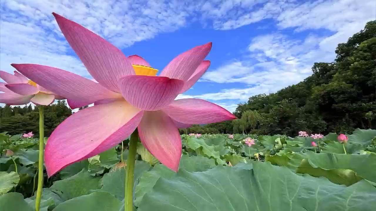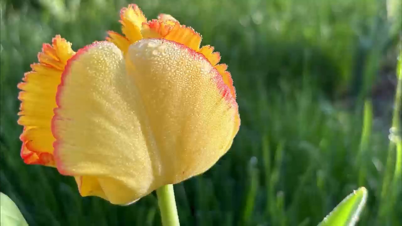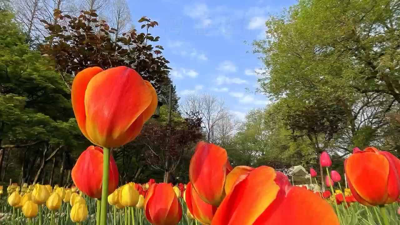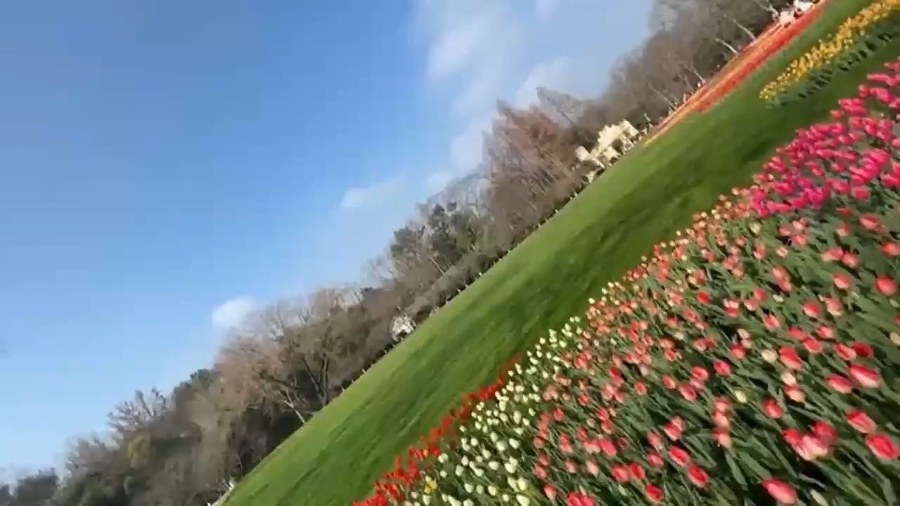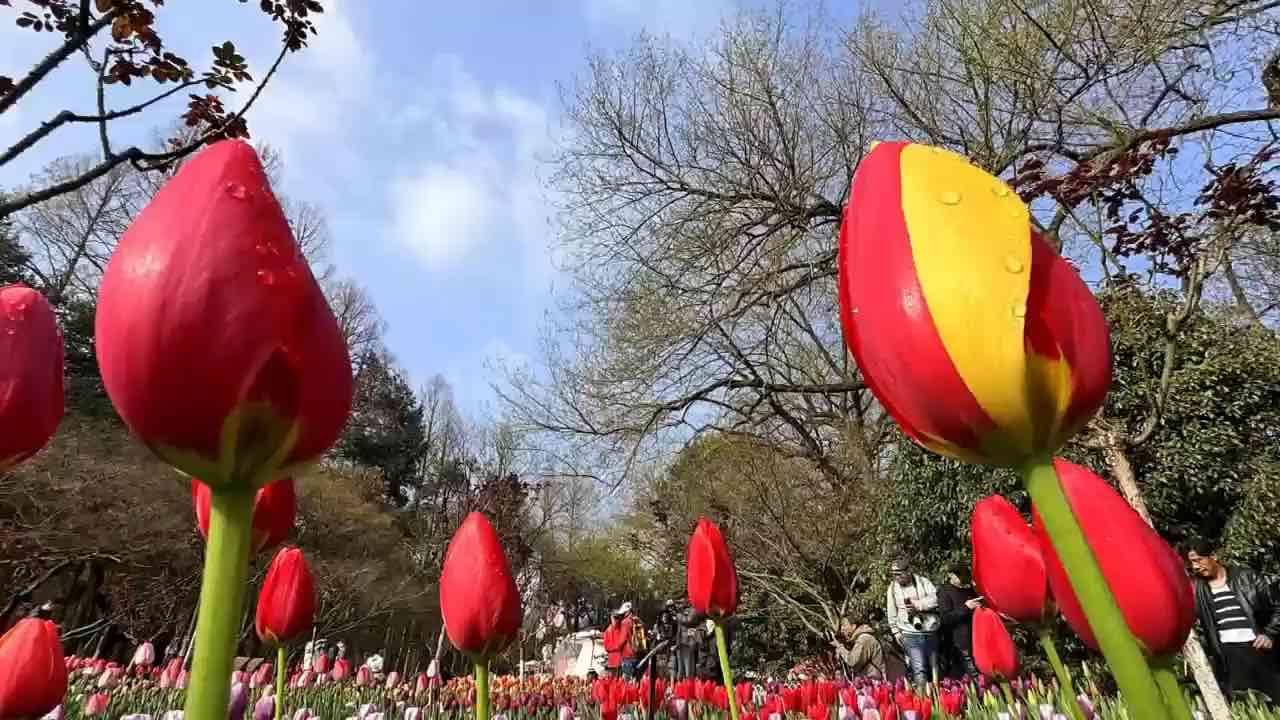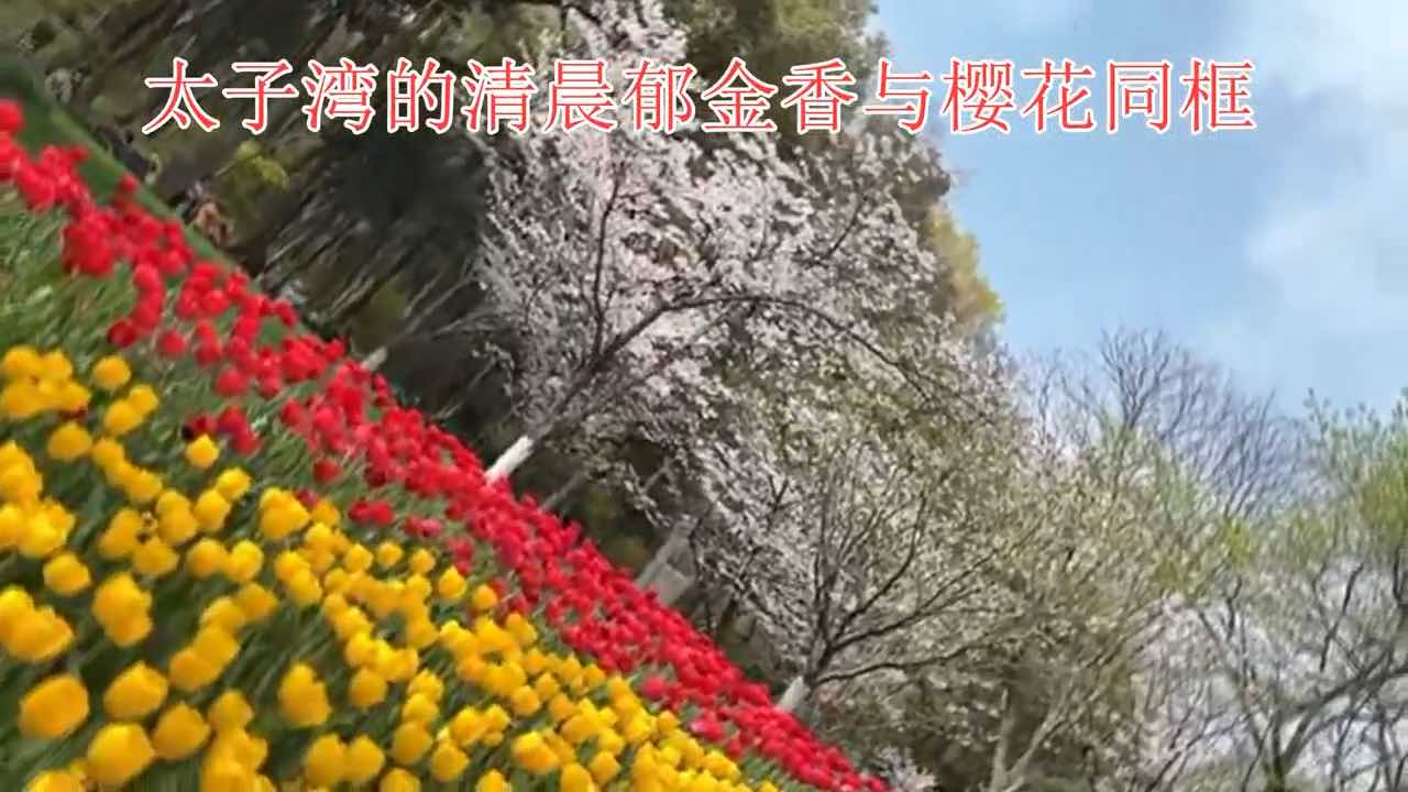 太子湾清晨郁金香与樱花同框 360°转动凝住光斑跃动瞬间