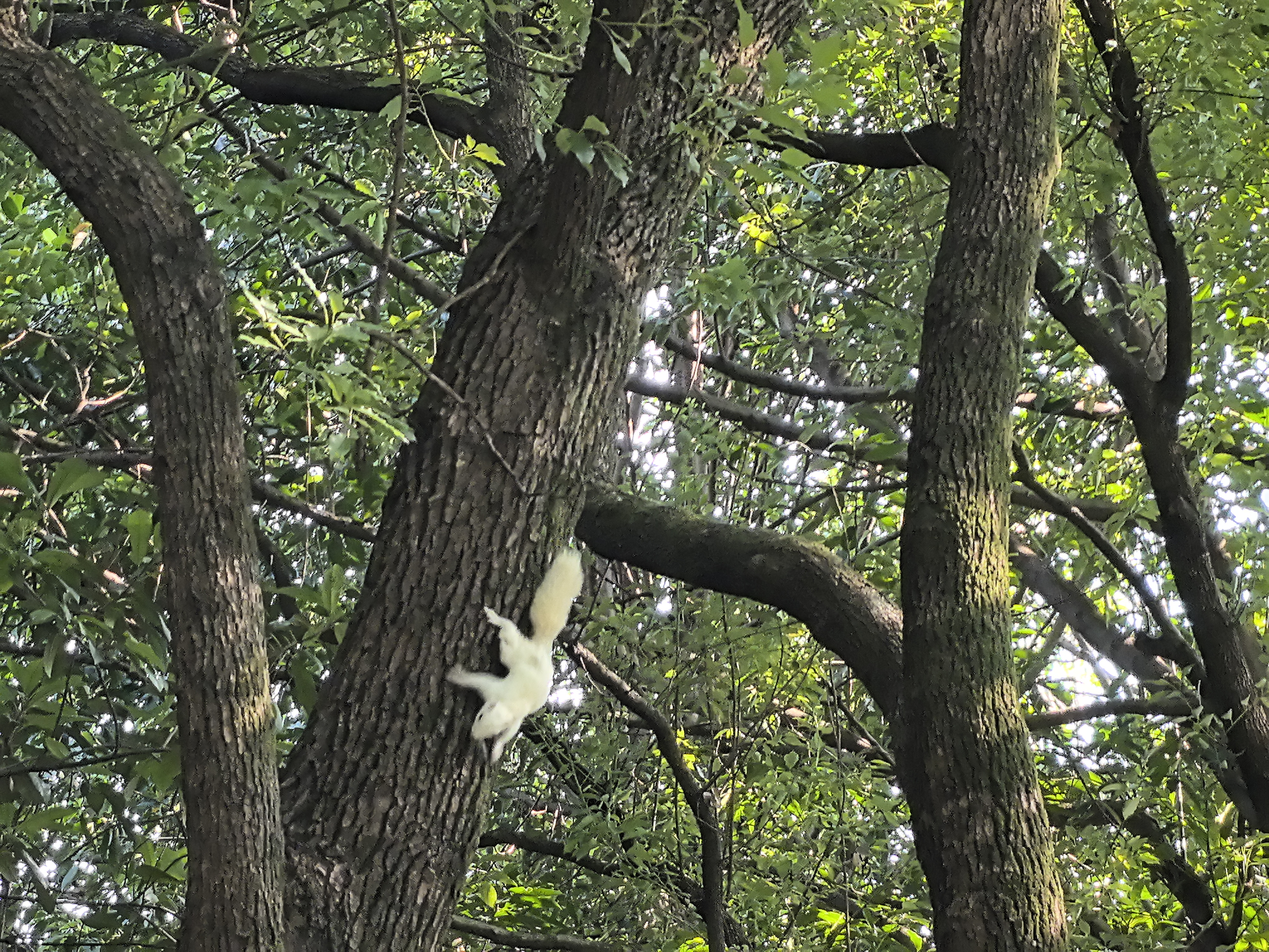 今天上午散步时有幸拍到一只白松鼠,网上查询说是基因突变造成的,非常少见,好像浙江还没有人拍到过。