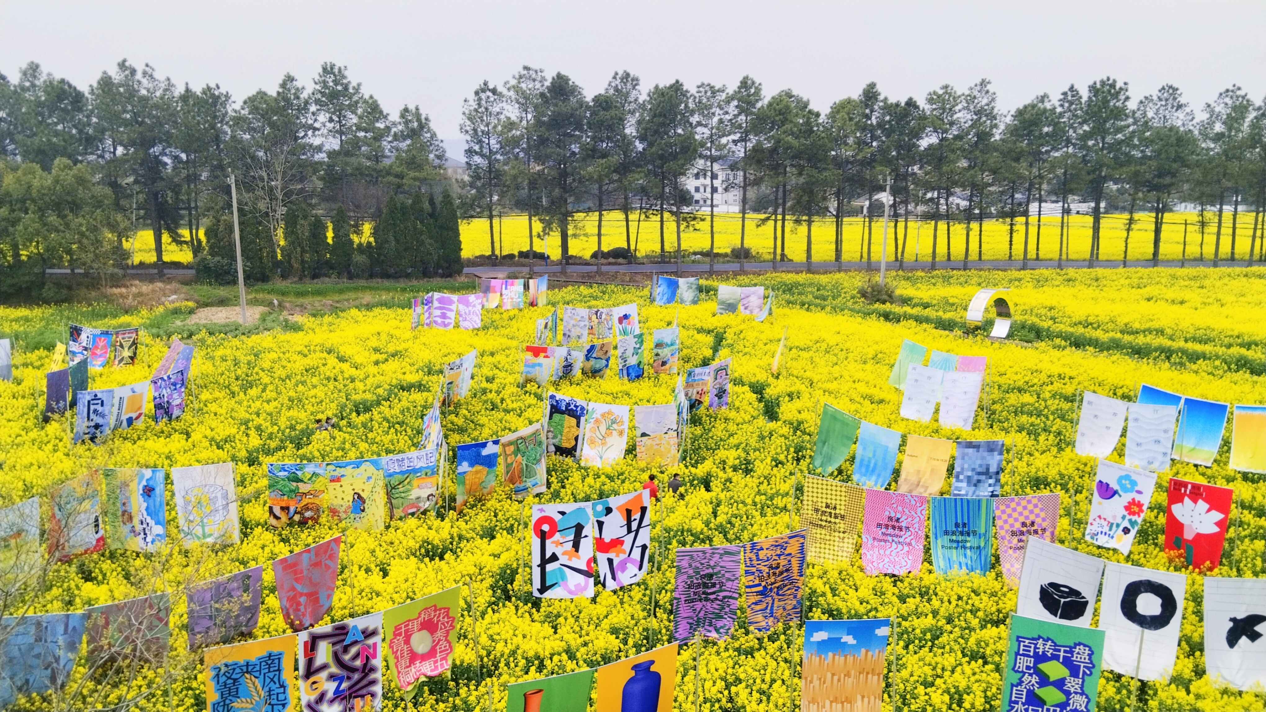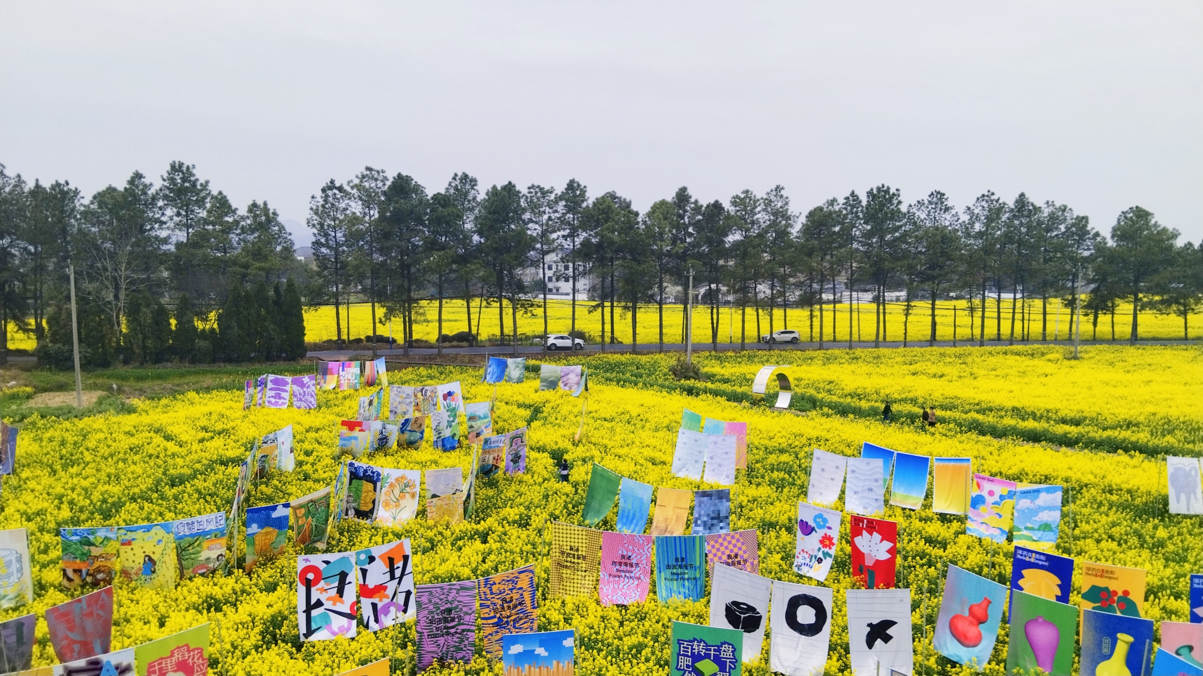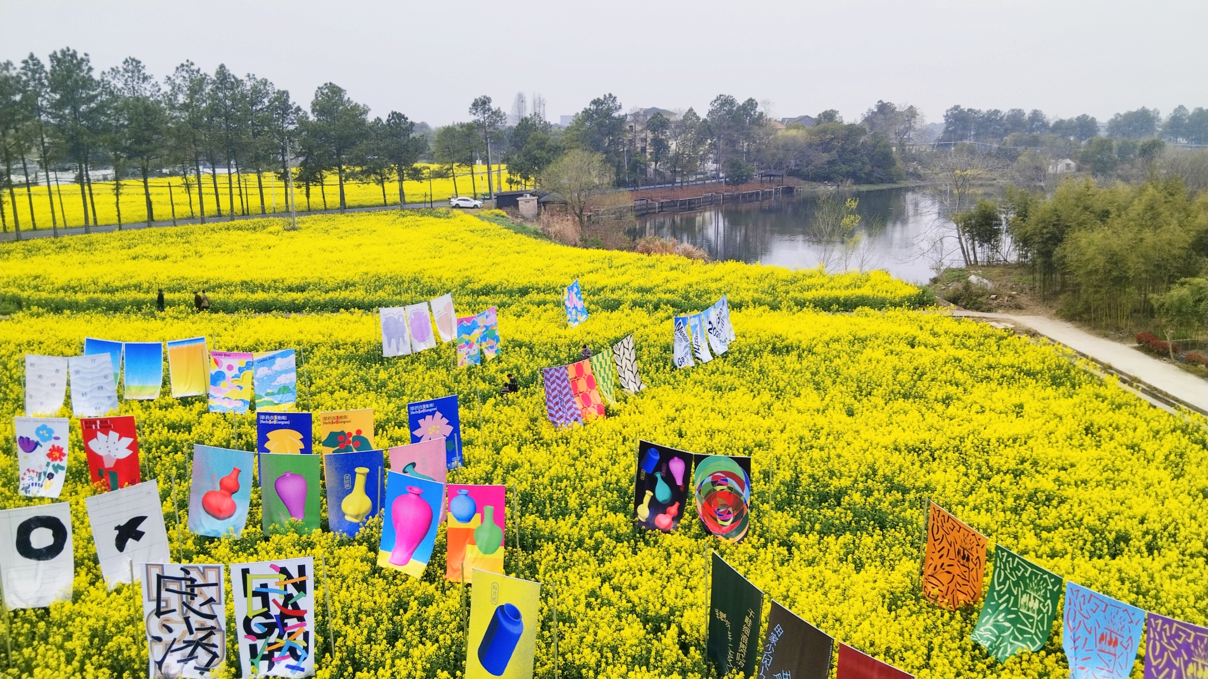 良渚春野,油菜花田作画布,彩旗轻扬,风车旋舞,艺术与自然在湖畔小径间低语。
