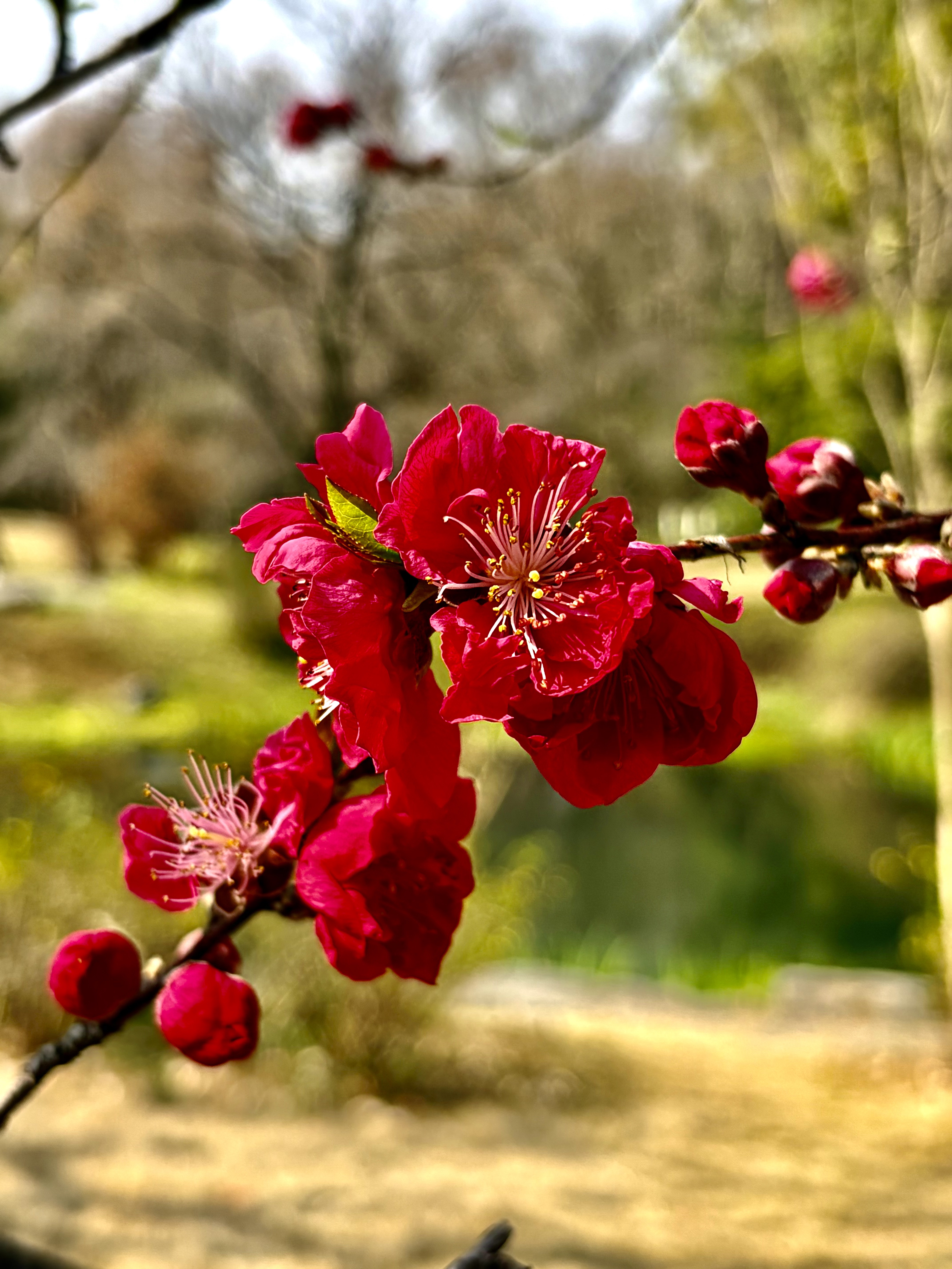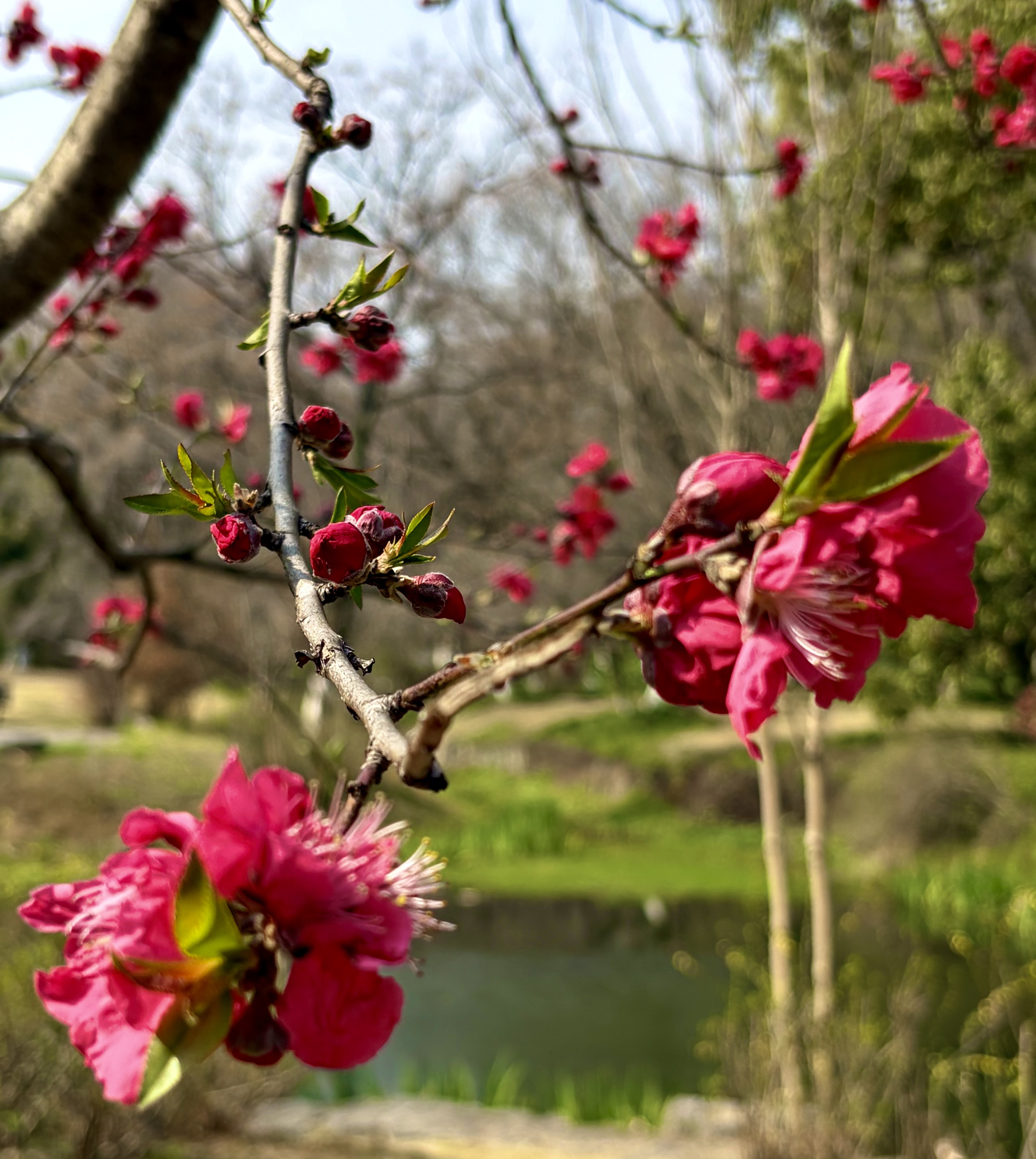 春日的红、透着粉、显着浓,游春的人、沐着风、扮着萌,情景交融。