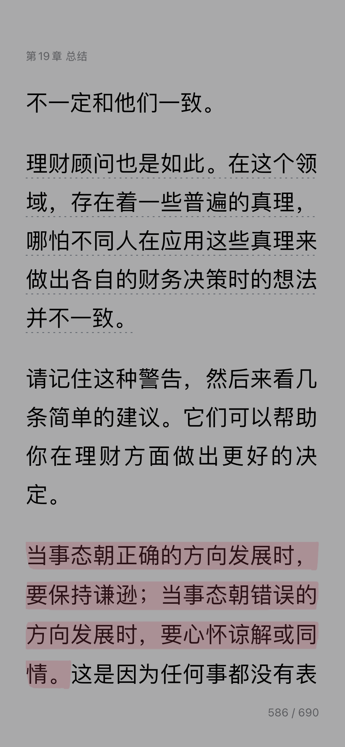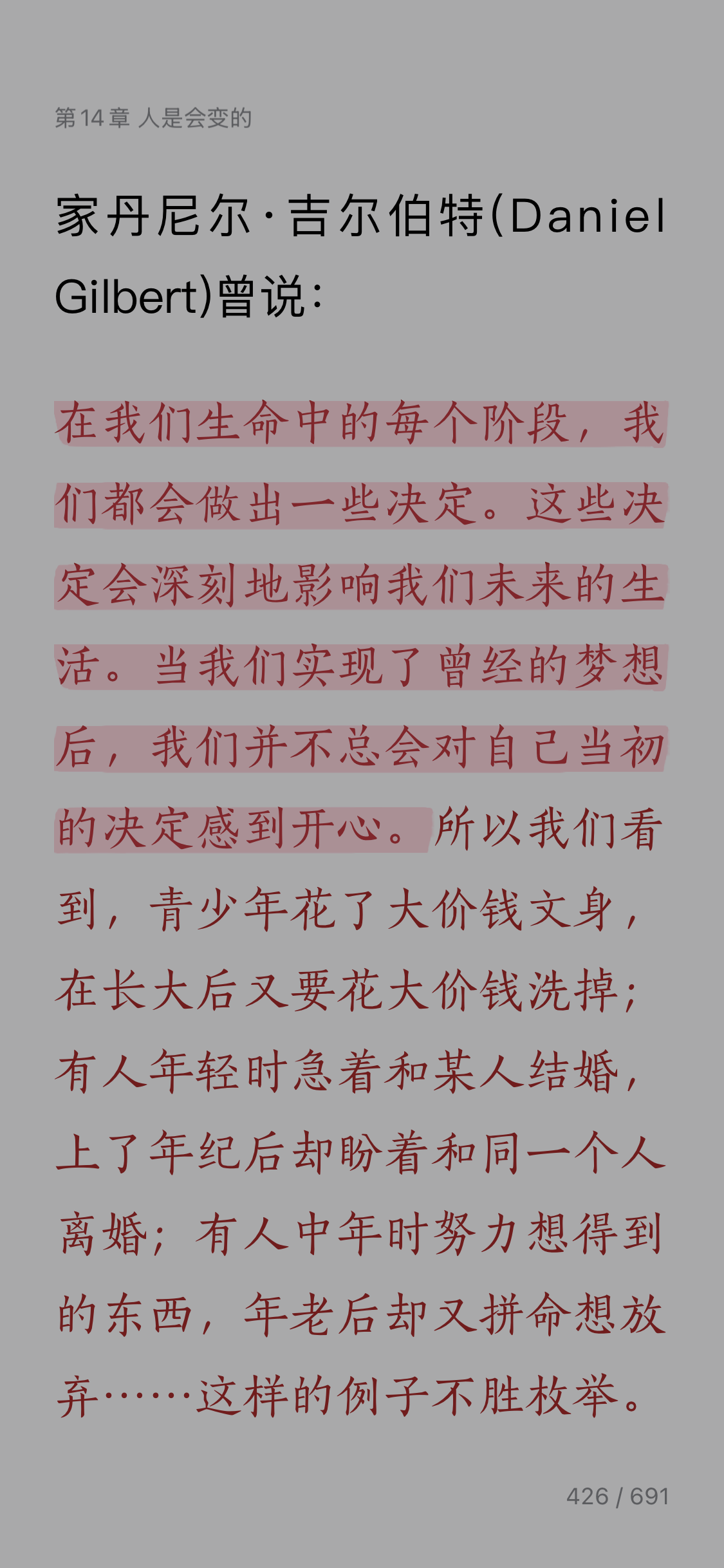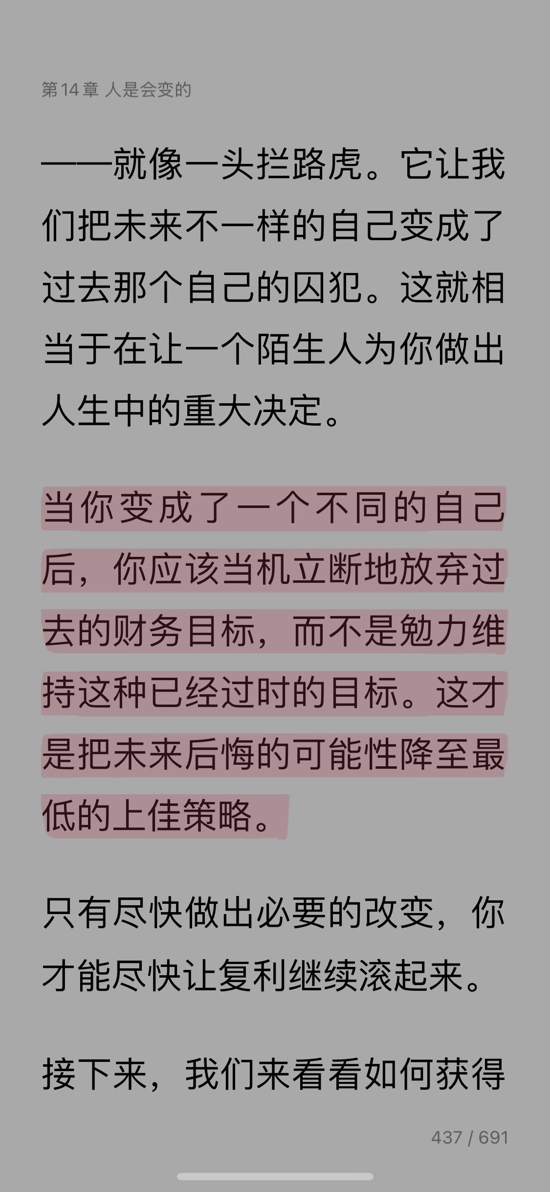 Day19: 今天继续阅读:《金钱心理学》。第十四章非常诚恳地讲了一个很现实的现象,就是人是会变的,其实没有什么是永恒的。刚从读书会听到一个观点就是一个人每隔几年就会死一次,这个死其实就是想法、喜好、目标等等都有了改变,和这本书这章的观点不谋而合。我也是花了好久才接纳这个观点,看看自己就是书本上讲的那个人,一开始就想不刻意追求挣钱,而是享受生活,所以找比较宽松的工作,业余时间到处去玩,但等到年过中年,又后悔岁月蹉跎了,工作没能好好投入,实现更大的自我价值,会形成内耗。所以这章中有一句话特别触动我,“当你变成了一个不同的自己后,你应该当机立断地放弃过去的财务目标,而不是勉力维持这种已经过时的目标。这才是把未来后悔的可能性降至最低的上佳策略。”也就是不要再去追悔那些沉没成本,应该聚焦到改变后的行动上,别到下一次又有遗憾和后悔,其实又说回了活在当下,任何时候都是开干的好时机。