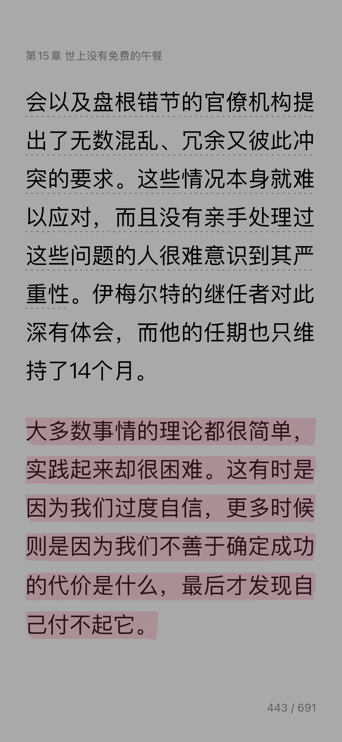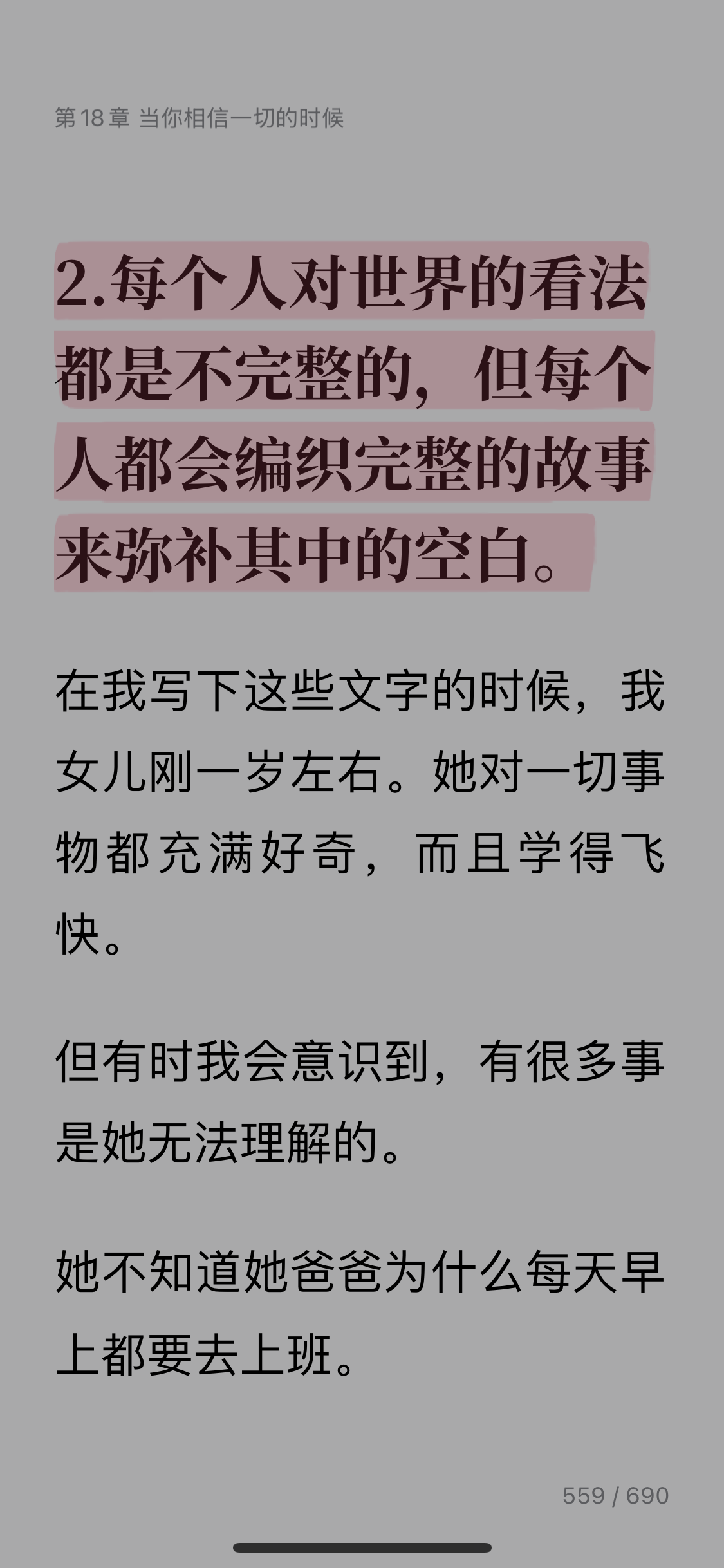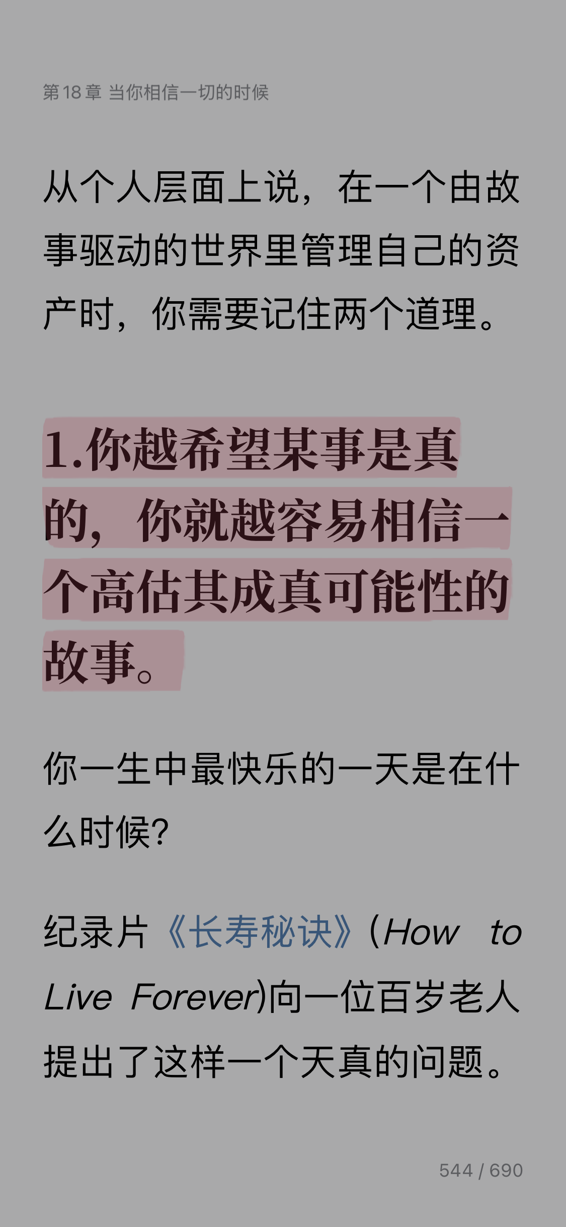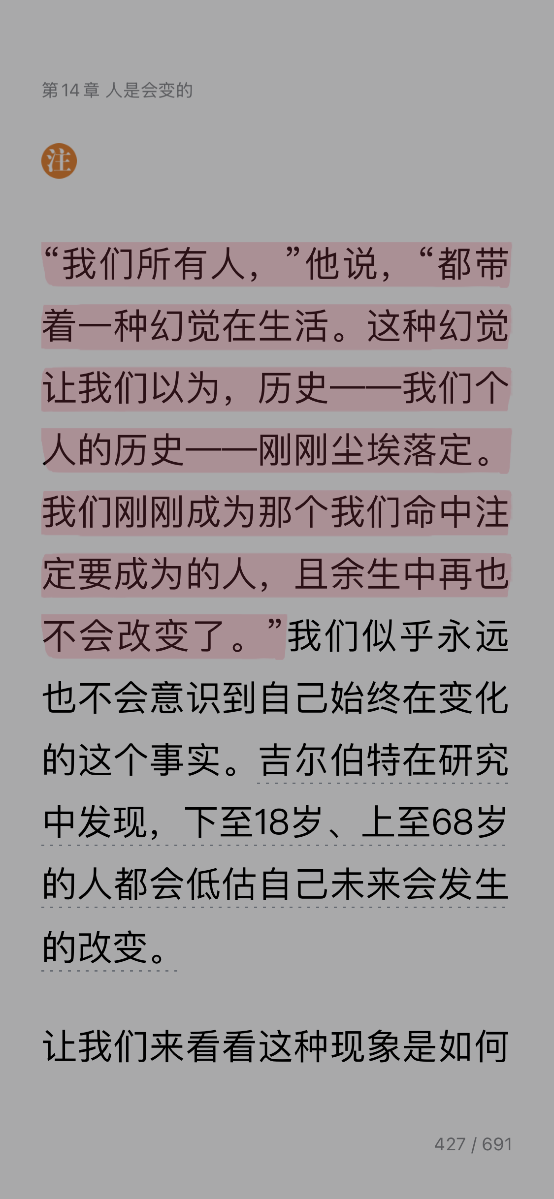 Day19: 今天继续阅读:《金钱心理学》。第十四章非常诚恳地讲了一个很现实的现象,就是人是会变的,其实没有什么是永恒的。刚从读书会听到一个观点就是一个人每隔几年就会死一次,这个死其实就是想法、喜好、目标等等都有了改变,和这本书这章的观点不谋而合。我也是花了好久才接纳这个观点,看看自己就是书本上讲的那个人,一开始就想不刻意追求挣钱,而是享受生活,所以找比较宽松的工作,业余时间到处去玩,但等到年过中年,又后悔岁月蹉跎了,工作没能好好投入,实现更大的自我价值,会形成内耗。所以这章中有一句话特别触动我,“当你变成了一个不同的自己后,你应该当机立断地放弃过去的财务目标,而不是勉力维持这种已经过时的目标。这才是把未来后悔的可能性降至最低的上佳策略。”也就是不要再去追悔那些沉没成本,应该聚焦到改变后的行动上,别到下一次又有遗憾和后悔,其实又说回了活在当下,任何时候都是开干的好时机。