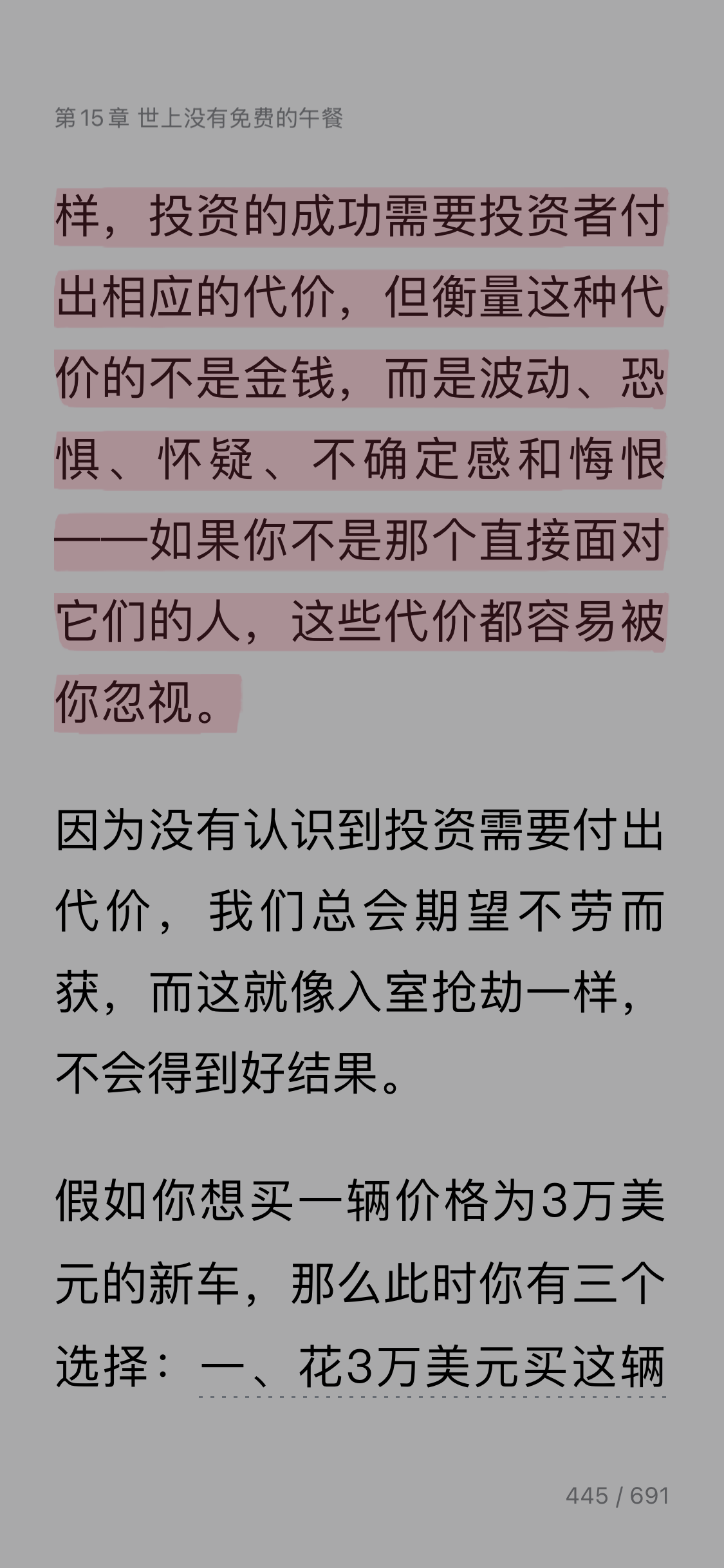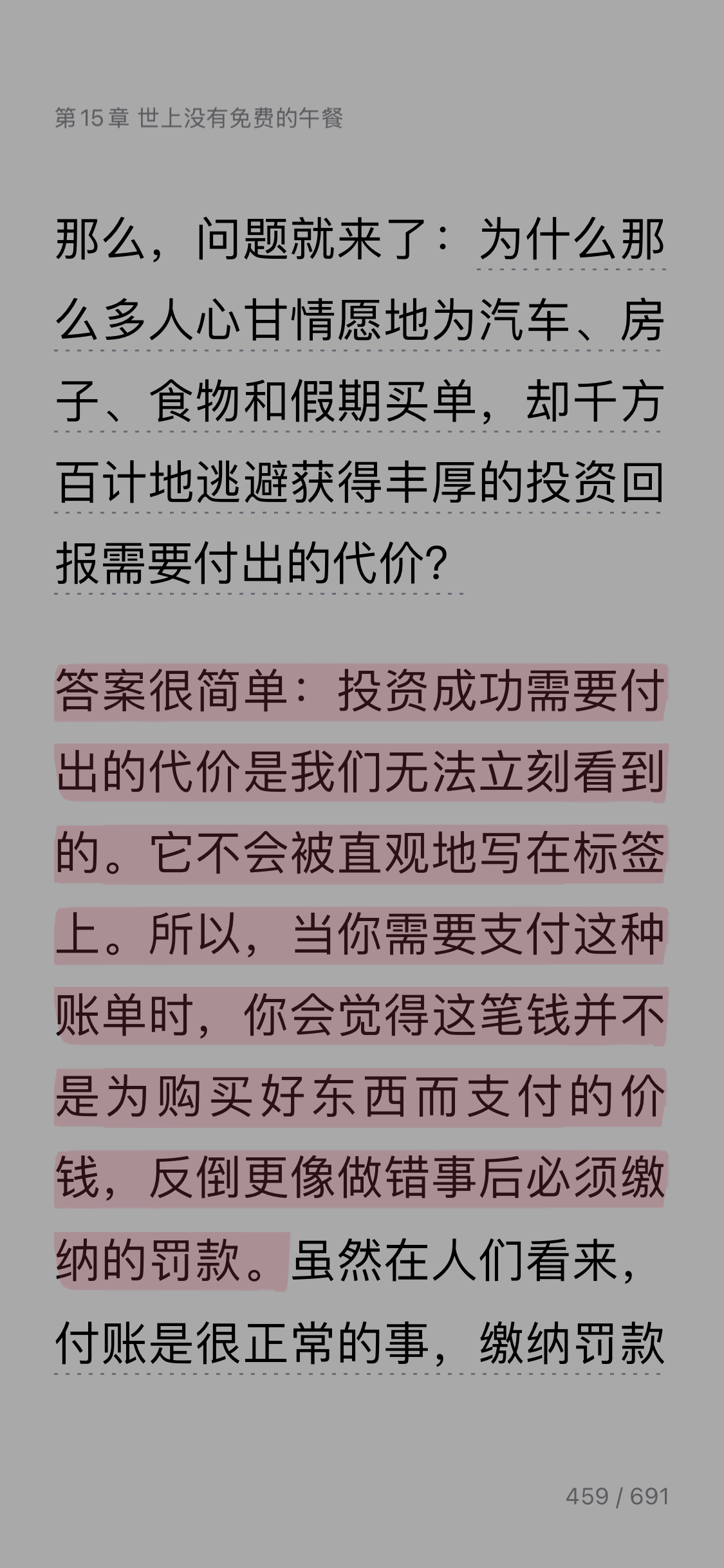 Day20: 今天继续阅读:《金钱心理学》。 第十五章讲到高回报就有高风险,天下没有免费的午餐。其实这些风险代价不仅仅是金钱,还有很多其他代价,比如时间、情绪(担心、怀疑、悔恨等等),讲到这儿让我也意识到以前我算投资回报率时只考虑了金钱费用和时间精力投入,没有考虑到情绪价值,如果一件事总容易给出负面情绪,其实投入度还要比想象的要大不少。而作者又从另一个角度来解读投资代价,也解开了我心中的一个自我困惑。很多人乐意买新衣服,买护肤品,花钱去旅游等等,但对可以获得高回报的投资不敢付出代价,那是因为我们无法直观或短时间内看到代价带来的益处,所以感觉像是做错事而付出的罚款,而不是消费好东西。我有时对自己困惑的是我会很开心地花大钱旅游,时间也不长,但我挺吝啬或非常谨慎花大钱进行学习,今天看来就是这个道理,因为我无法短时间看到学习带来的效果,想到的就是可能学不会,不值得,没效果,白花时间等等不好的一面,所以无形中认为学费是罚款而不是消费了,有点恍然大悟的感觉。