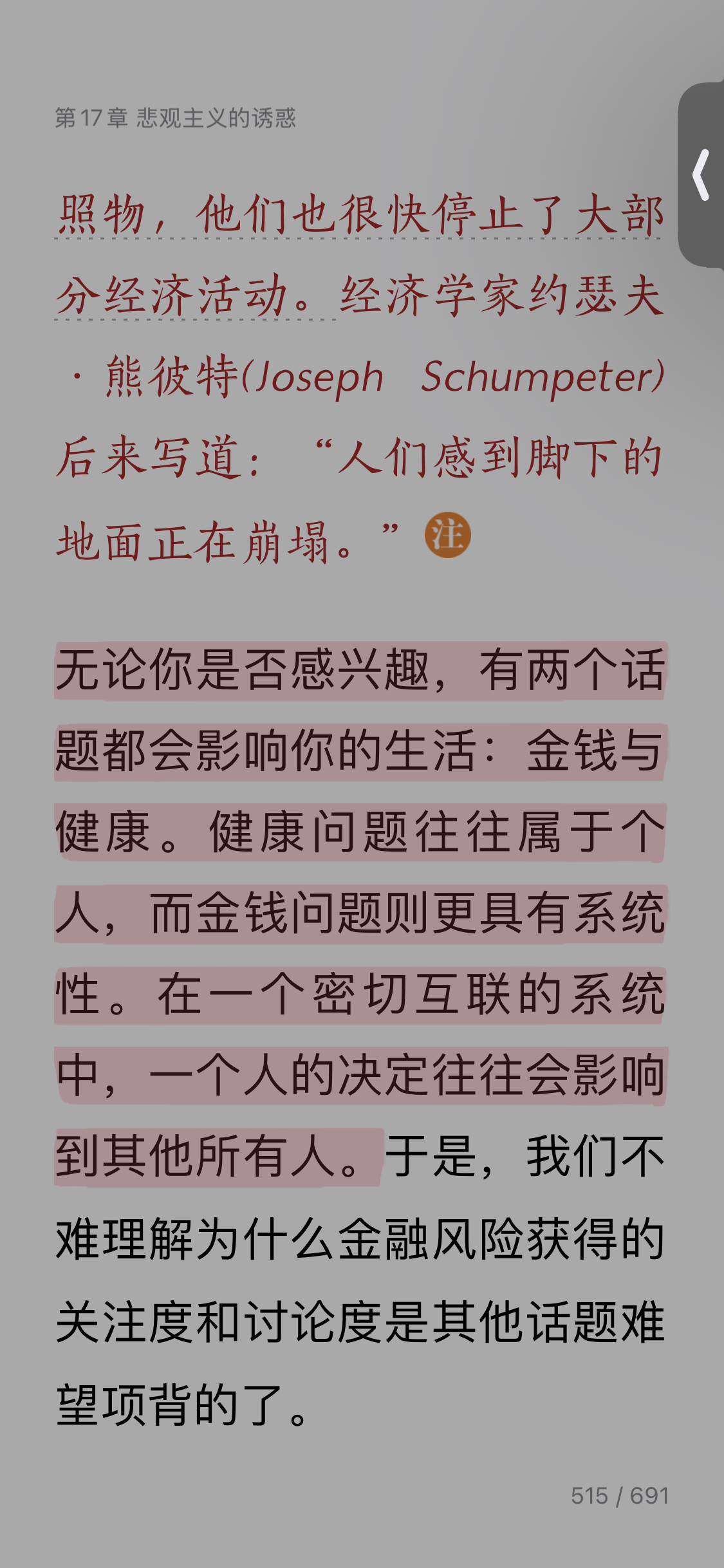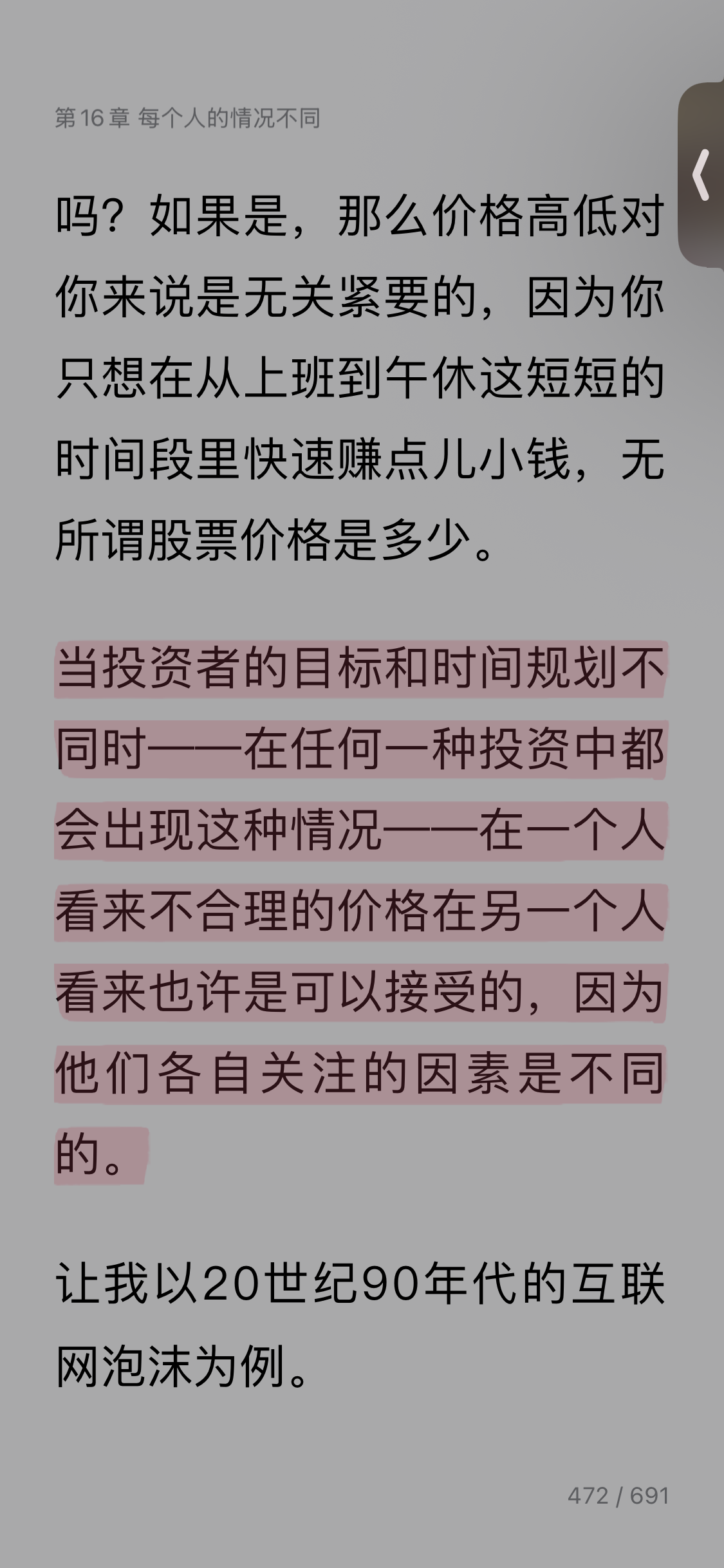 Day21: 今天继续阅读:《金钱心理学》。 今天读了第十六章和第十七章,我觉得讲得很透彻,它让我真正理解了泡沫经济是怎么形成的,也想起亲身经历过的疯狂房产市场,连我这样对理财这么白痴的人都感到人人抢房的可怕之处。也明白了在理财方面原来投资目标不是赚多少,而是长期还是短期,这背后的区别到底什么,所以学习别人一定要搞清楚别人玩的是什么游戏,不要盲目跟风,现在回想还好当时买房没有跟风,否则在当年被骗之上再砍自己一刀,那基本上可以去跳楼了。第十七章介绍了悲观主义的诱惑,这章节内容挺有意思,我自己是一位悲观主义者,但我很敬仰苏东坡这位乐观主义者,还想学习,而在这章中提到乐观主义者往往不被人看好,尤其是在对大众事件上的乐观,想想也是,当年华为老大说华为的冬天来了,大家都很关注,到现在越活越宽泛了,而外企老大总是说市场潜力大,稳中有升,哪儿哪儿有机会,结果总被员工骂是空画蛋糕。所以对自己的人生长远要乐观,对具体的事件或决策要悲观点,尤其是预期要降低,这样即考虑了风险,又不至于最后结果落差太大,这在旅游方面体会最深,所以我觉得旅游前期准备才是最开心最充满乐趣的阶段。