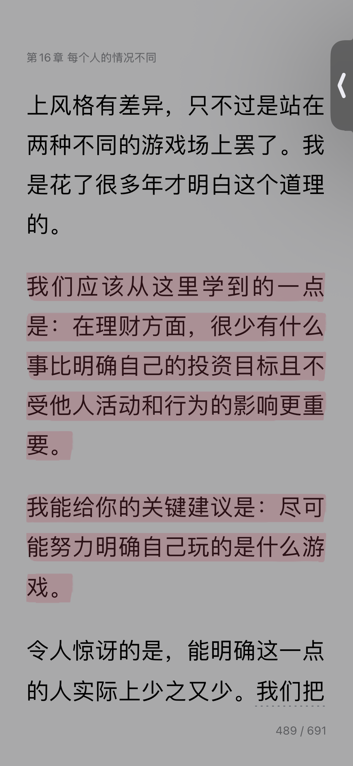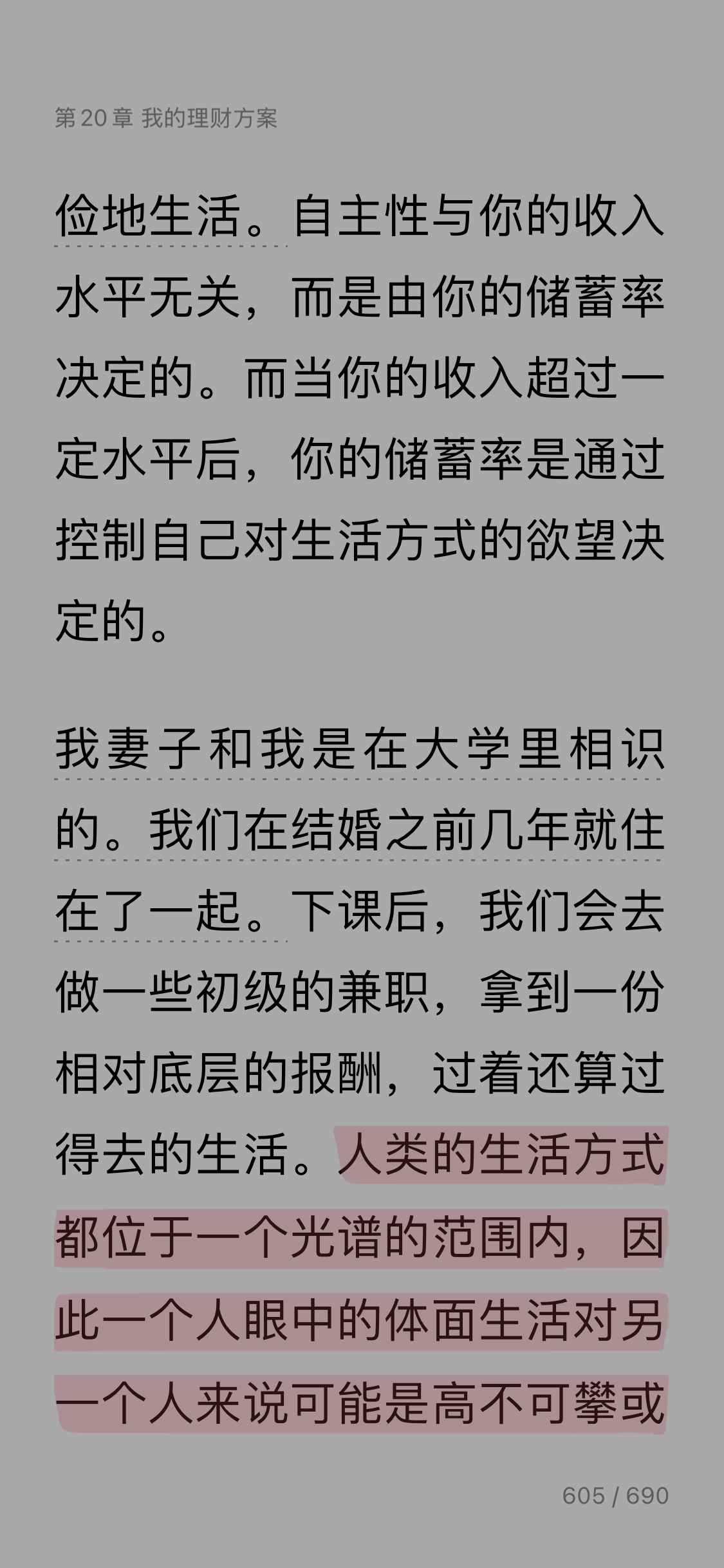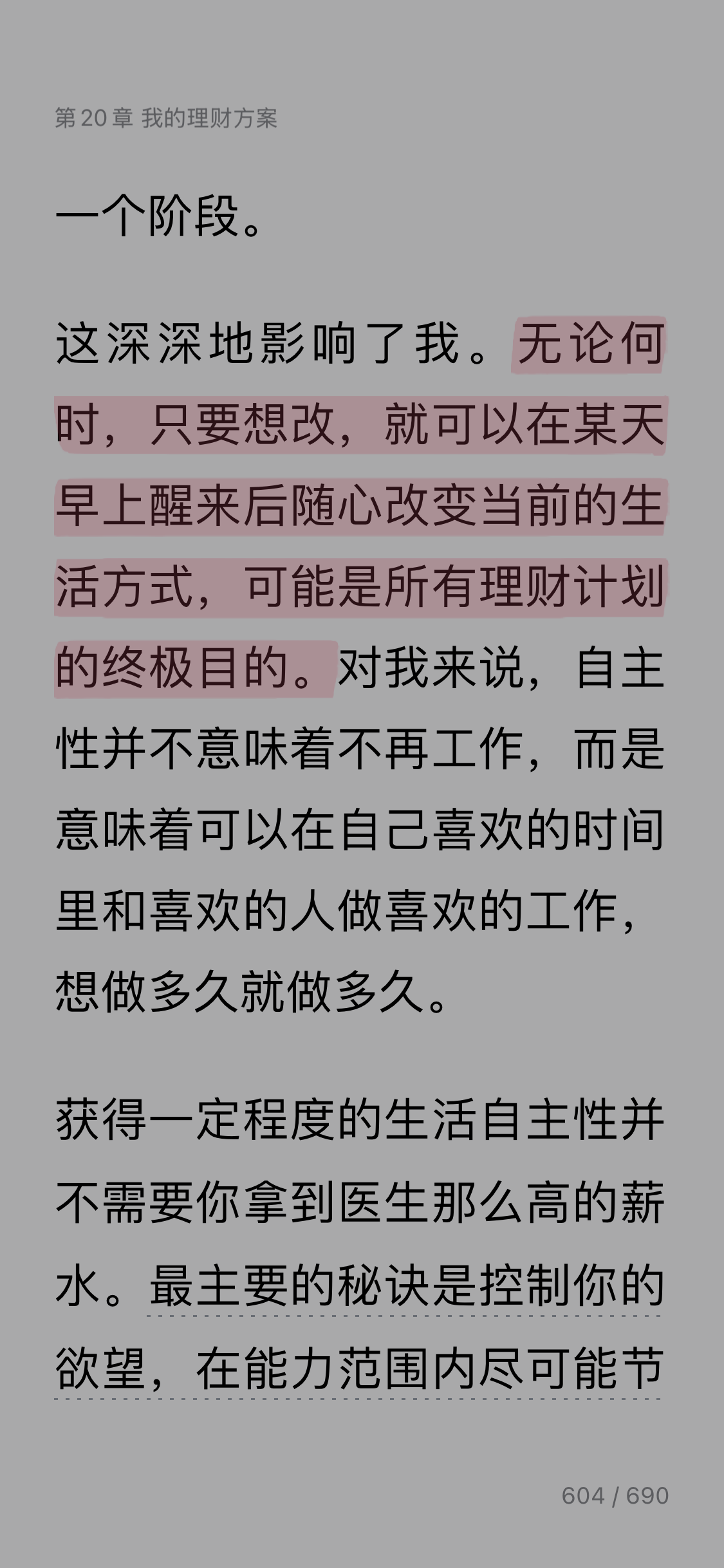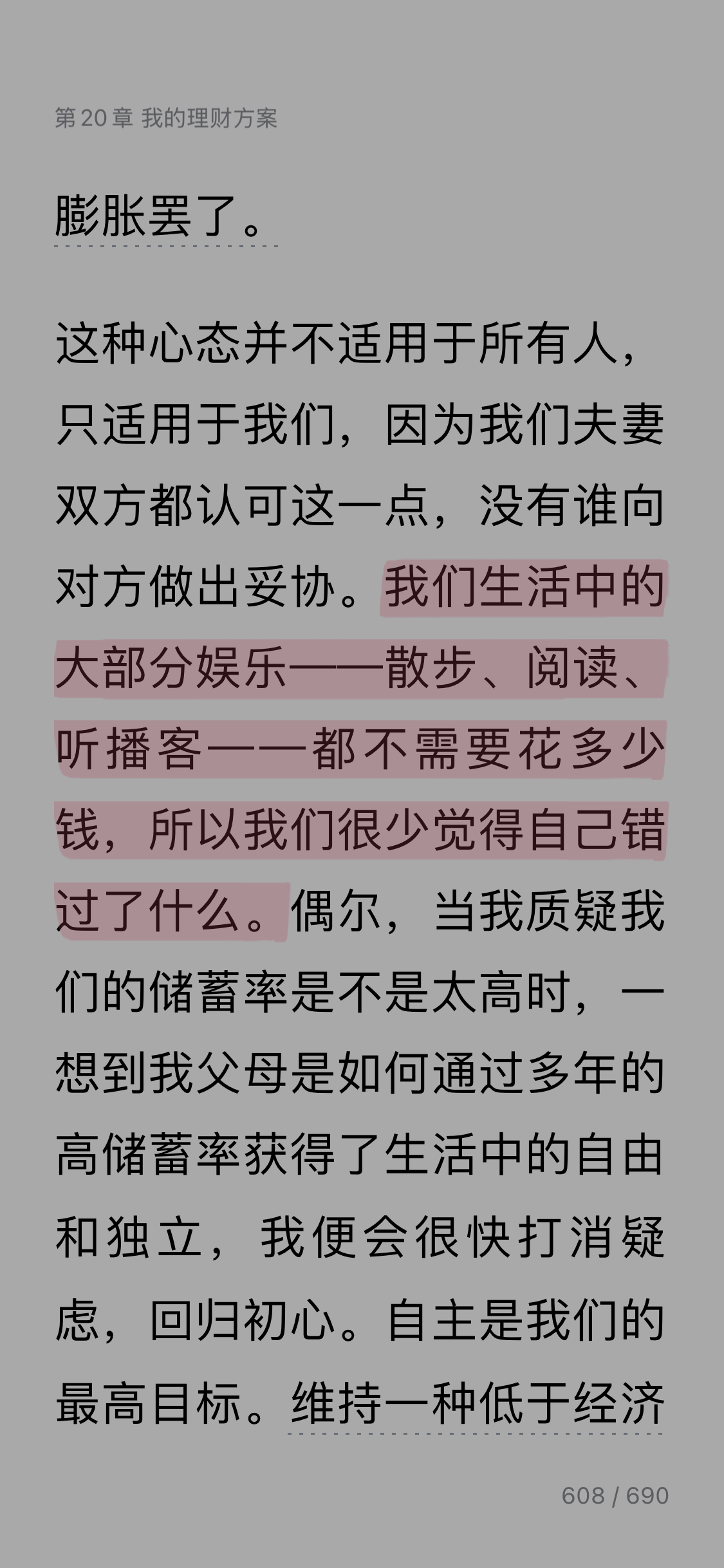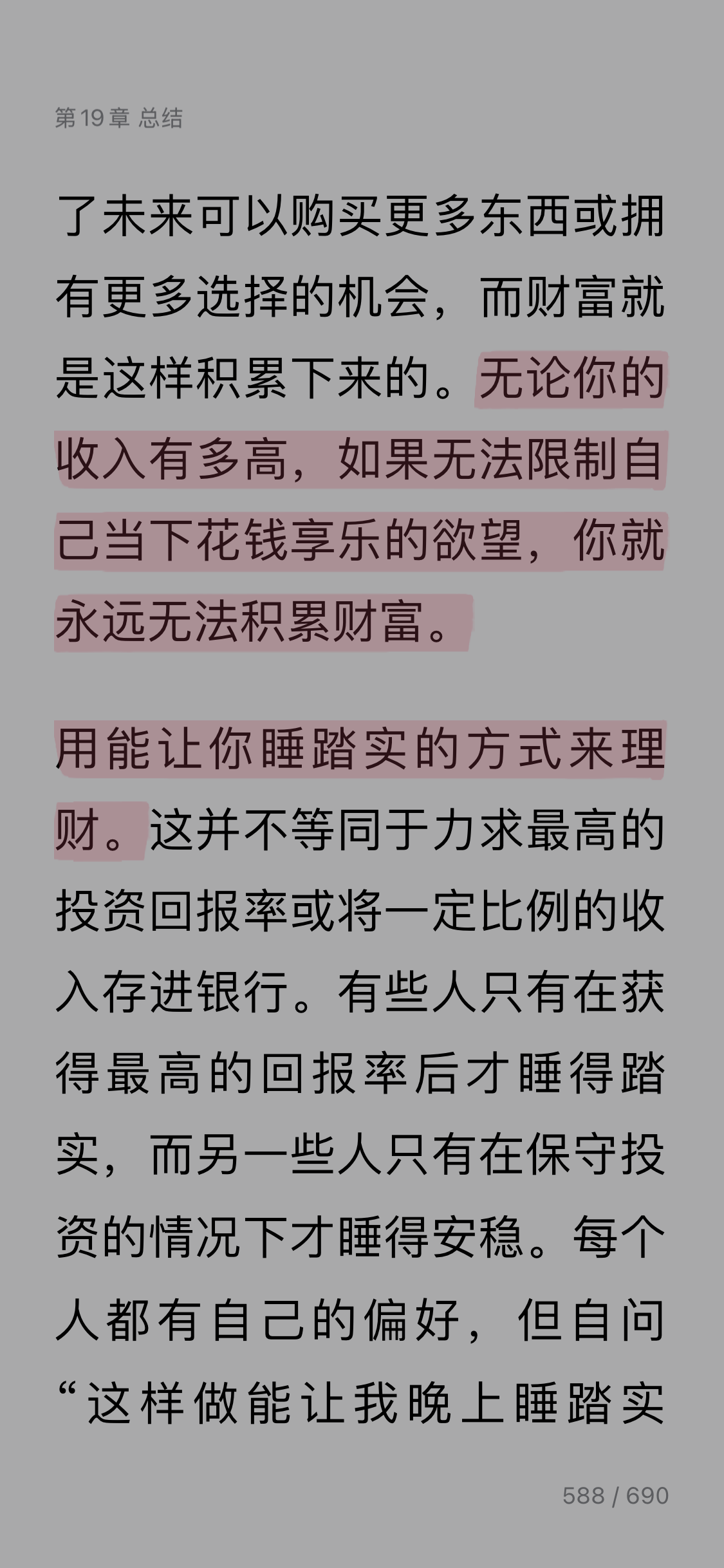 Day24: 今天继续阅读:《金钱心理学》。 今天看完整本书的最后一章节及附录。最后作者介绍了自己的理财方案,感受到作者为什么能写出如此透彻的文字,他是一位重精神轻物质的人,非常理性,清醒,目标明确。他的理财目标是受他父母影响,这个很关键,他看到父亲可以在有了财富后改变当前的生活方式,去做自己喜欢的事情,这也成为了作者的理财目标,即生活自主性,这让我想起我妈妈的一个观念,她说女人一定要工作赚钱,这样有了经济独立性才有地位独立性,想想她虽然赚得不多,但也践行着作者的一些理念,不贪多,只求长期稳定地复利效果,结果比我能存下钱。我妈妈很能满足,也活得很开心。可惜我没有被影响到,反而不容易满足这点就是我最大的问题所在,我容易去攀比。在这本书最后的附录里谈到了美国消费者心态发展史,其中他们有一个观念是不管从事什么行业,大家的生活方式是差不多的,所以会形成效仿生活方式,我也有这样的观念,尤其和周边同学、同事和朋友去看齐,房子、车子,穿什么水平的衣服鞋子,出去旅游等等,我应该和他们一样水平地活,落后了就会沮丧、生自己气,这么没用,要努力赶上,直到被骗损失惨重后,无法追赶才只能接受现实,放下攀比,转而追求精神,其实是逃避物质无法满足的欲望。看这位作者一直过着自己的节奏,不追求高回报的股票期货,多存储,再买点可以长期持有的指数基金,照样节俭地生活,散步、阅读、听播客是他和伴侣一起的娱乐,也不觉得错过什么,很满足自在地生活。他虽然看透很多道理,但依然相信这个世界。我现在最大的开销估计是出去旅游的欲望和花钱学习的欲望,如果不去担心错过了什么,我可能就能打理好财富了。这本心理学书籍,我觉得写得很朴素,但又很坦诚,直面了我们其实忽视或逃避的很多现实,道理都很简单,就看我们能否真正坚持执行,看完我觉得我要重新开始提高一下我的存储率,重新审视我的欲望,需要放下一些,找回自己的节奏,这才是财富理财的本质目的。