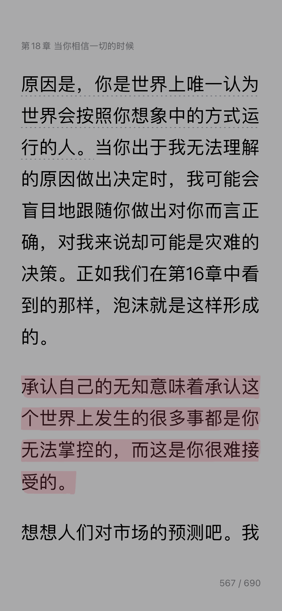 Day22: 今天继续阅读:《金钱心理学》。第十八章讲述了人类和一般哺乳类动物不一样的一点,人有想象力,会编故事,而这点也容易让人在投资上遇到麻烦,首先容易去相信高回报高风险的低概率投资建议,因为你越希望结果如期所致,就越容易相信促成这个结果的故事。这点我发现自己在买保健品时很容易发生,如果卖家说到能治疗我的血糖血脂,我都会相信地去花钱试试,因为太希望自己健康了,失去了应有的理智,居然相信概率事件成为了必然事件。而且除了这点,人还喜欢编故事,将不清楚的信息部分靠自己的想象编完整整个故事,而不敢承认自己只有片面的信息来源,就怕失控,这点我最近发现所有人都在寻求安全感,所以多少都有强迫偏好,追溯到自己内心都是因为害怕失控,所以作者再次强调容错空间,如果空间越大,那么就不容易失控,不容易失控,就不会因为紧张害怕而失去理智。所以突然明白了,控制好风险,增大容错空间,才能从容进行合理理财。