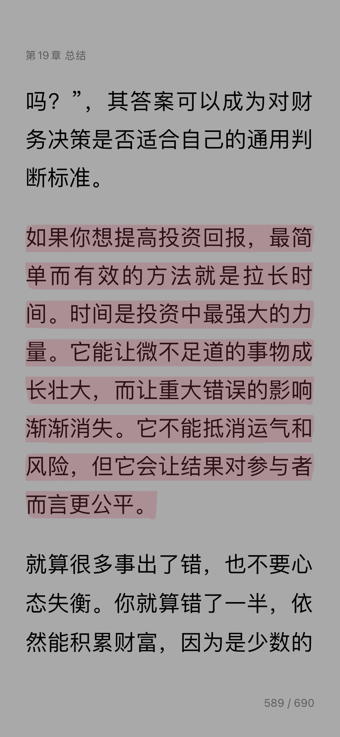 Day23: 今天继续阅读:《金钱心理学》。第十九章总结全书的心理学,首先就是心态平衡,好的时候要有坏的打算,坏的时候要接纳并乐观,其次就是明确自己的理财目标,作者建议用能让你睡踏实的方式来理财,其实也是平和,不激进,也不保守,因为财富的最大红利是掌控感,尤其是对时间的掌控感。另外,限制欲望,提高存储率,用拉长时间,依靠复利来积累财富。心态、目标、方法都讲透了,很不错的一本财富心理学,提醒了很多坑,受益匪浅。