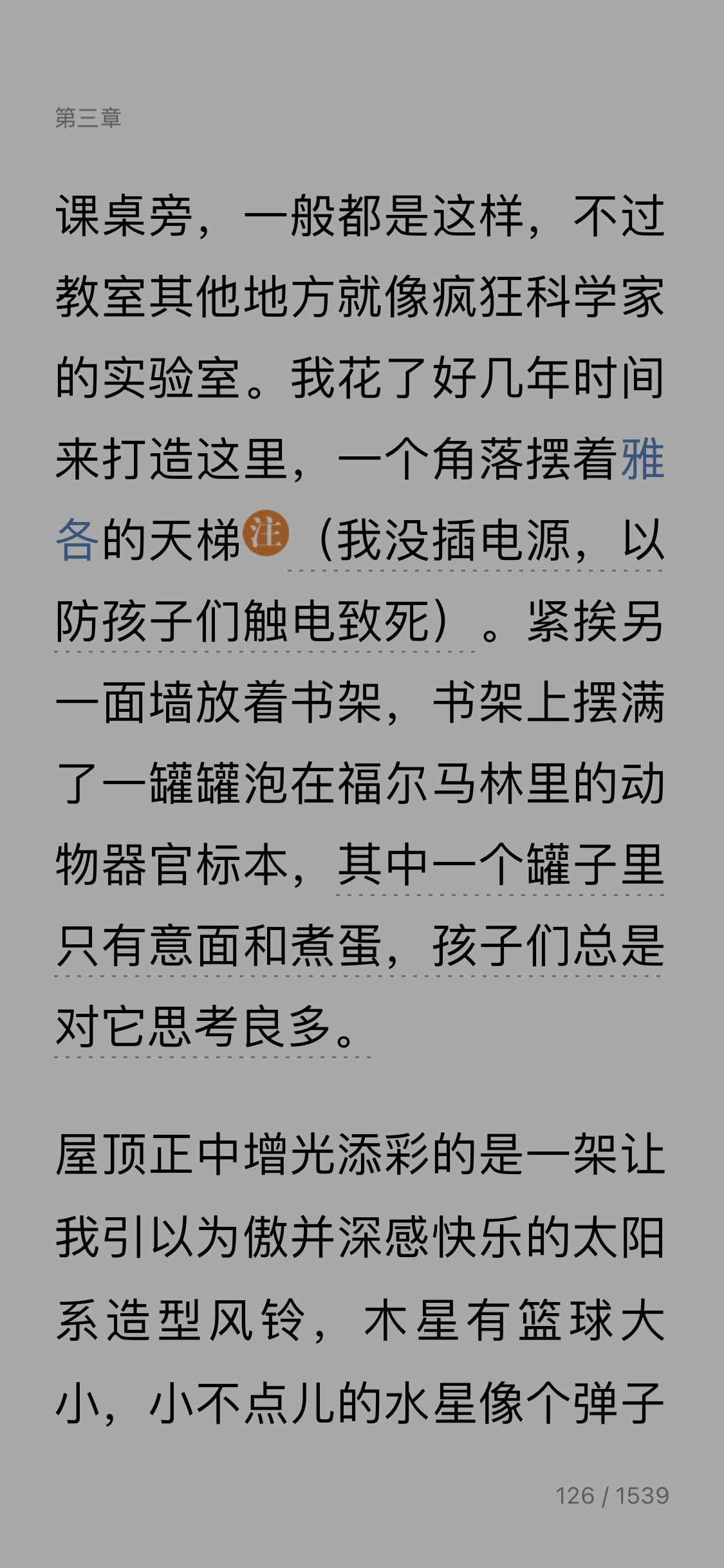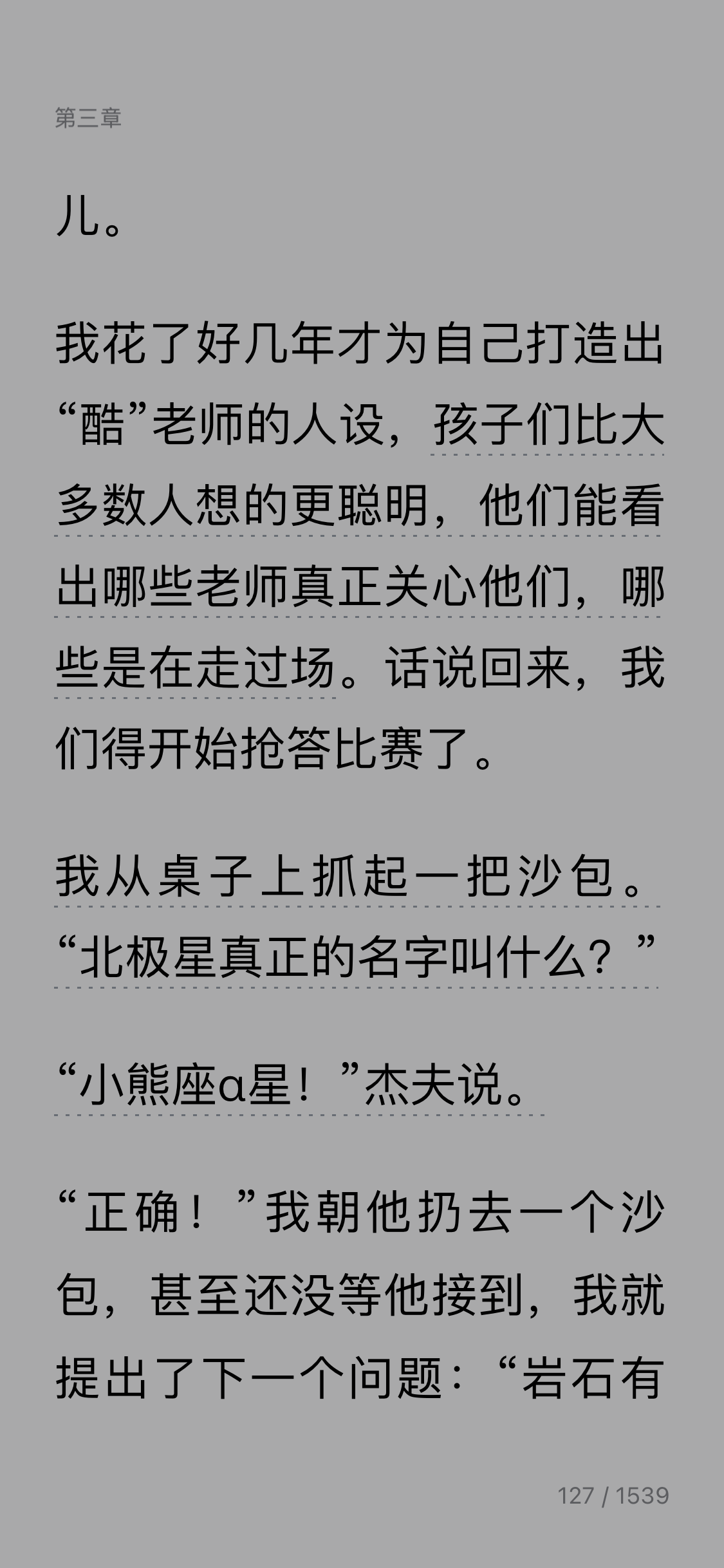 Day26: 今天继续阅读:《挽救计划》。 第三章,主人翁终于想起了自己的身份,原来是博士生,当了一名中学教师,很感兴趣他设置的下课前的抢答环节,当然提的问题我都不会,这些孩子好厉害,但觉得这个环节很有趣,孩子们会比较喜欢的。其中有一句,“孩子们比大多数人想的更聪明,他们能看出哪些老师真正关心他们,哪些是在走过场”,我非常认可,对家长而言也是如此,很多夫妻不和,在孩子面前还要演戏,其实孩子都是心知肚明,甚至陪着大人演戏,所以真心对待和爱孩子,孩子都可以健康成长的。