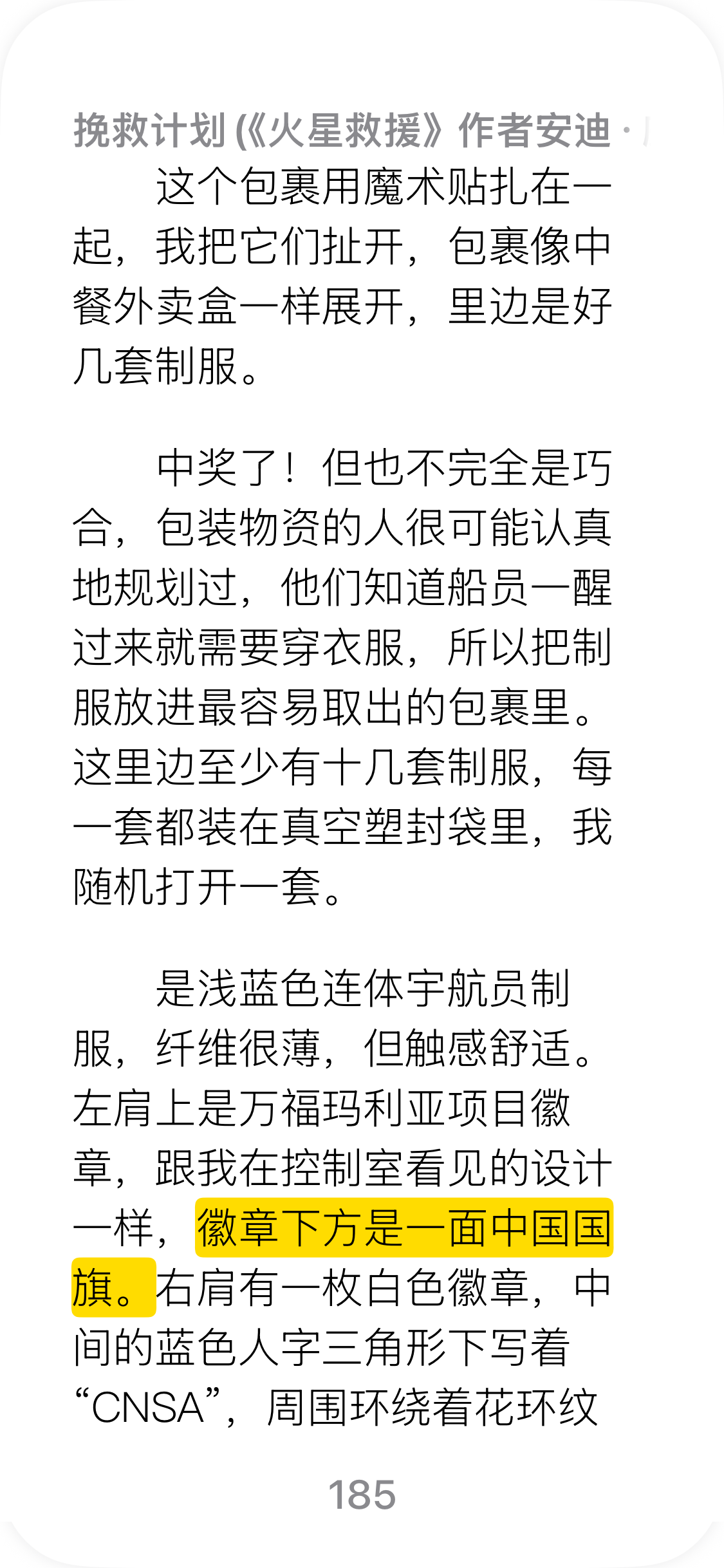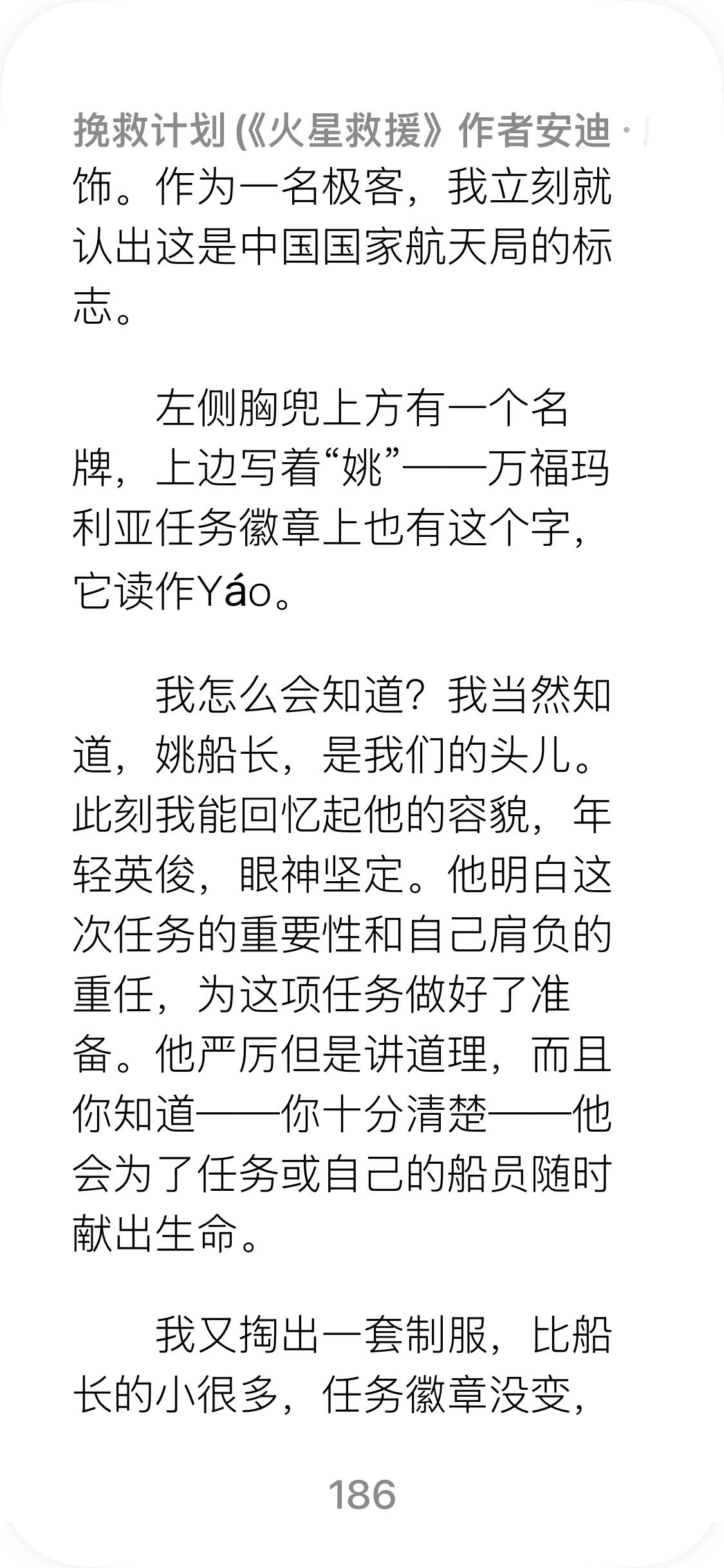 Day27: 今天继续阅读:《挽救计划》。 第四章小说情节继续在现实与回忆中交错推进。很有意思的是当主人翁在宇宙飞船中孤独地活着,身边有已经死去的同伴,当他要给他们下葬换衣时,找到一套连体宇航员制服上有着一面中国国旗,这是他们船长的制服,船长是位姚姓中国人,是他们的头,年轻英俊,眼神坚定。真没想到美国科幻小说中出现中国人物,还是个头,可见我们的科技实力给美国人的印象应该真的有超越性,很牛逼,地位很重要,已经达到探索领航者级别了,值得自豪一下😄但愿不要成为这样已经离开的中国人,离开了参与行列,那就遗憾了