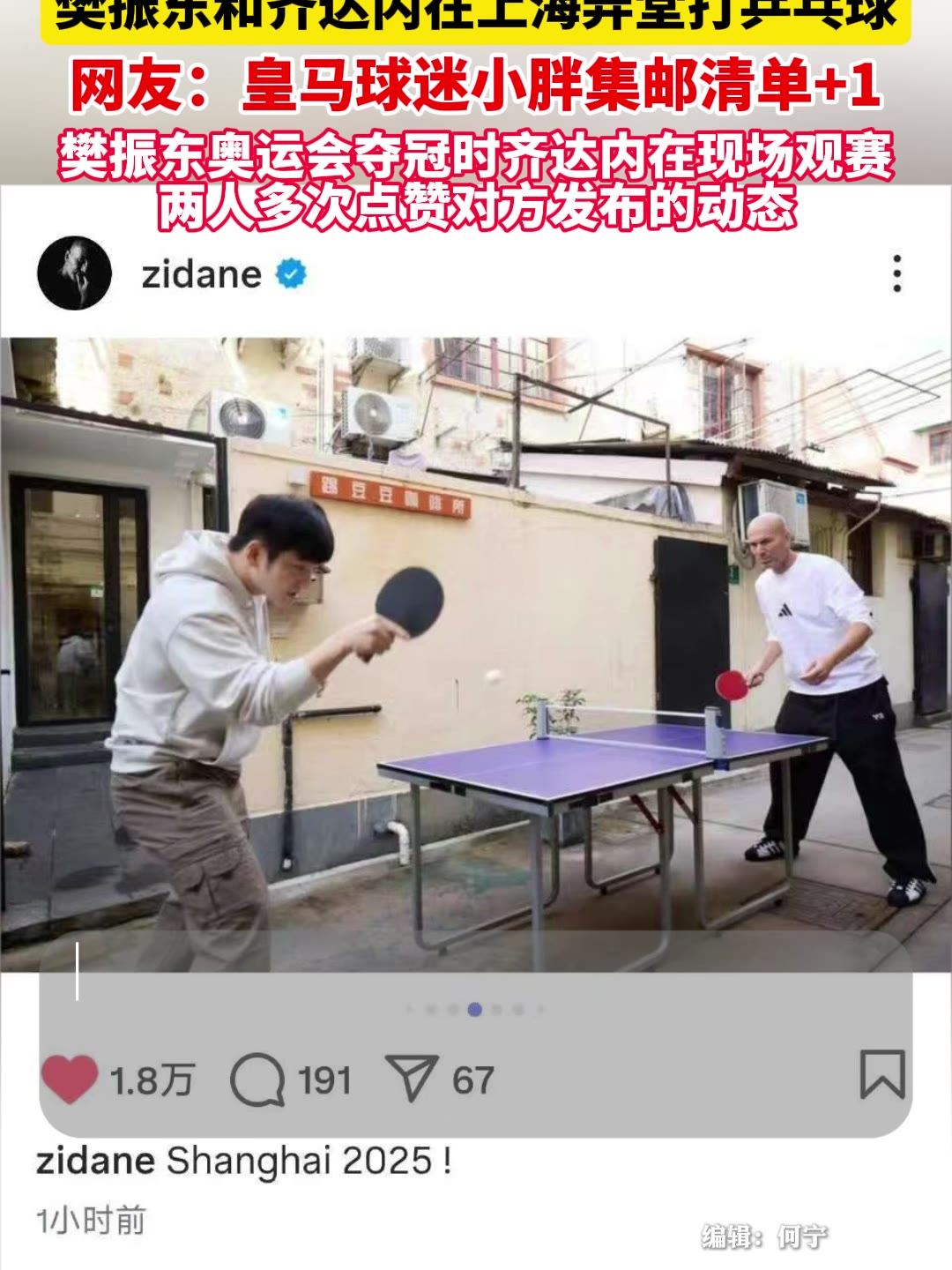 齐达内晒和樊振东打球照,足球界和乒乓球界梦幻联动上了!网友:皇马球迷樊振东追星成功!