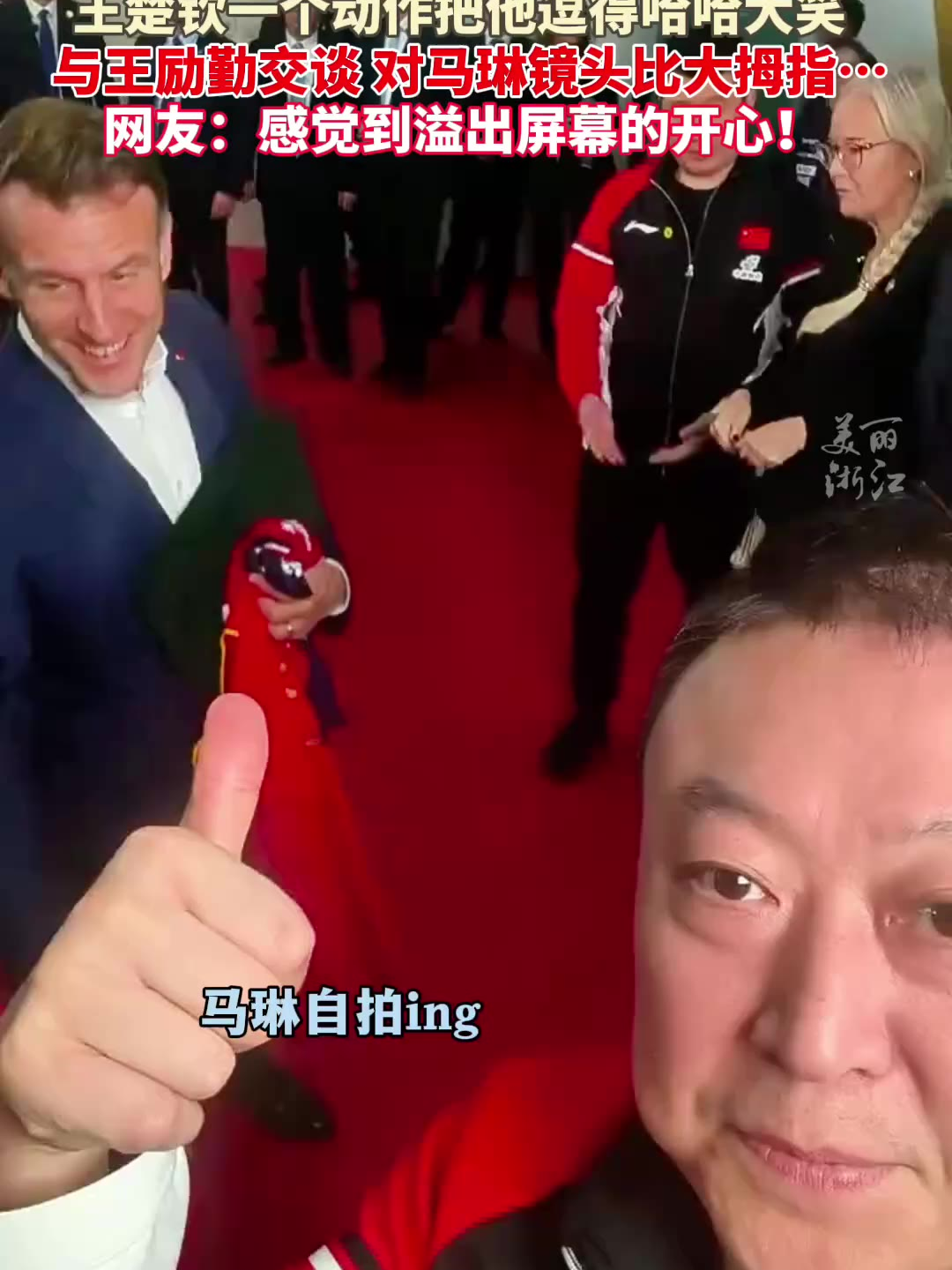 溢出屏幕的开心!法国总统马克龙与国乒切磋球技 ,他被王楚钦逗笑、与马琳合影还和王励勤交谈