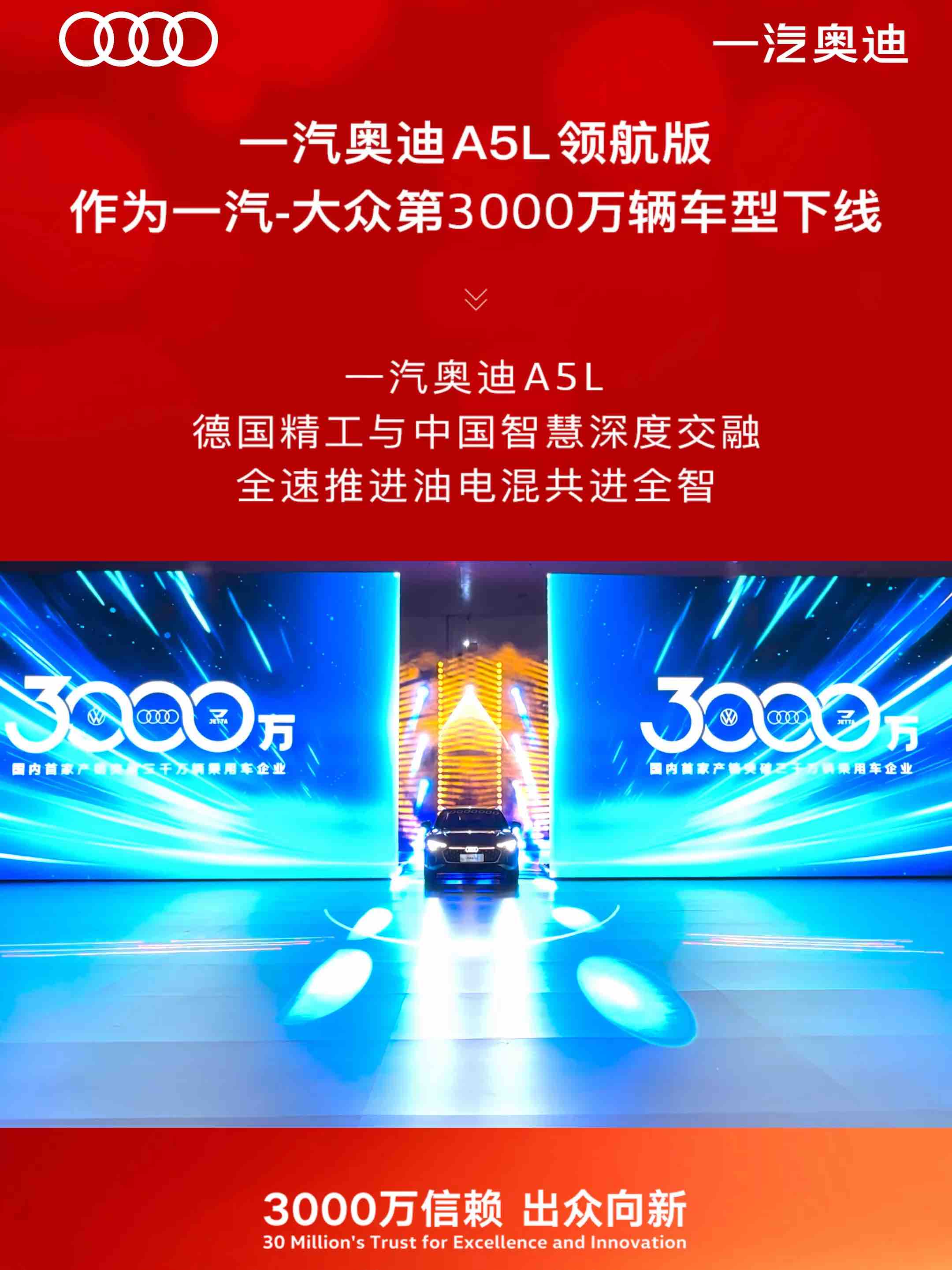 荣耀时刻:一汽-大众3000万辆里程碑,一汽奥迪A5L领航版下线,开启豪华燃油智能出行时代!