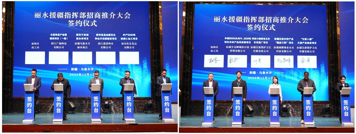 凝聚乡情 共谋发展——新疆丽水商会会员大会暨招商引资推介大会隆重举行 12月4日,新疆乌鲁木齐市丽水商会大会暨丽水市援疆指挥部招商引资推介大会在乌鲁木齐市隆重举行。乌鲁木齐市委统战部副部长、市工商业联合会党组书记、常务副主席肖建利,新和县政协党组书记、副主席田向奎,第一师十三团党委副书记、副政委张建军分别为大会致辞;新疆浙江商会和兵团浙江商会的负责人也受邀参会并致辞;浙江省援疆指挥部副指挥长、阿克苏地区行署副专员、丽水市副市长朱磊出席会议并讲话,新和县委副书记、丽水市援疆指挥部指挥长王乐主持会议。 朱磊代表丽水市人民政府、阿克苏地区行署、浙江省援疆指挥部,向本次大会的胜利召开表示热烈的祝贺。他表示,长期以来,广大浙商和丽商赓续“四千”精神,积极投身产业援疆,一家家企业相继落户,一个个项目相继投产,有力增强了新疆内生发展动力,提高了各族群众收入水平,也实现了浙新两地优势互补、共赢发展,在天山大地谱写了“地瓜经济”的新篇章,擦亮了浙商和丽商的“金名片”。他希望各级商会和广大企业家到阿克苏、新和及十三团“大展宏图”,帮助受援地“牵线搭桥”,将创业脚步留在受援地、投资重心放在受援地、优质项目落在受援地,做阿克苏、新和及十三团的最燃投资人、最铁合伙人、最美代言人。浙江省援疆指挥部将以产业援疆三个“十百千”专项行动为总抓手,全力护航项目建设落地,与广大企业家携手同行、共向未来。 在招商引资大会上,丽水市援疆指挥部向全体成员推介了丽水市、新和县及十三团的投资优势、发展前景、营商环境。作为在疆丽商的“娘家人”,指挥部会一如既往地引领好、团结好、服务好广大企业家,为大家牵线搭桥,推动彼此合作共赢。也希望企业家能常回家看看,常联系走动,借新疆高质量发展之东风,充分发挥群英荟萃、人脉广泛的优势,架起桥梁纽带,为家乡丽水、新和县及兵团发展谋良策、聚资源,牵红线、引项目,争做丽水、新和、十三团的招商大使、形象大使,致力于招商引资、项目建设、公益慈善,让个人事业与三地发展同频共振,携手助力家乡和受援地高质量发展。 会上,新疆乌鲁木齐市丽水商会会长杨孔仪作商会换届以来的工作报告;各地州市成立分会,增补了常务副会长、副会长、副秘书长,聘请了商会顾问,并举行了授牌仪式;丽水莲都农商银行为商会授信20亿元,浙江稠州商业银行青田支行为商会授信小微贷款2亿元。现场,新和县还与8家优秀企业代表签订投资意向协议。 记 者 李宏杰 孙 胜
