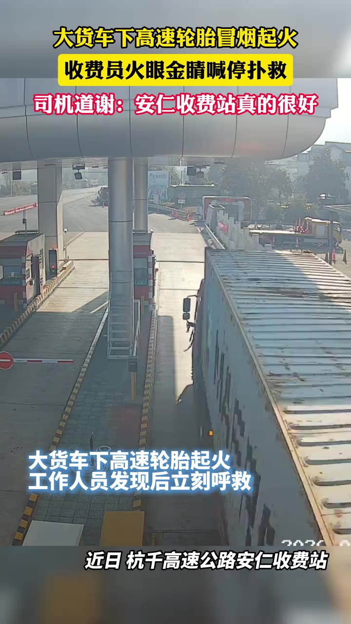 大货车下高速轮胎冒烟起火,收费员火眼金睛喊停扑救,司机道谢:安仁收费站真的很好!