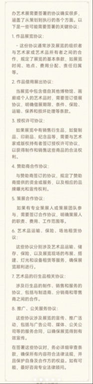 📜 艺术家与策展人必看的办展法律指南! (附协议清单) 🎨 艺术的世界,法律的边界。无论是艺术家还是策展人,在举办艺术展时,除了追求艺术的美感,更不能忽视法律的重要性。因为我本人担任了美术家协会的法律顾问以及一些独立艺术家的私人法律顾问,所以在给他们提供法律服务时就发现,艺术家和策展人在办艺术展时,也存在不少法律问题。今天,就让我们一起来探讨一下,办艺术展需要注意的事项吧。 首先,主办方应尽早明确参与的主体及其各自的权利、义务和责任。在此基础上,签署展览协议及其配套协议至关重要。 ⚠️这些协议通常包括展览协议、借展协议、商品授权许可协议、赞助协议、策展合作协议等。 🖼️ 在展览协议及其配套协议中,各方需要对各参与主体的角色,其各自的权利、义务、责任,成本分摊、权益分享等做出具体而明确的约定。比如,展览协议通常由美术馆与艺术家和画廊签署,借展协议则涉及画廊与借展作品所有权人。 🌟 案例分析1:在2019年的某艺术展中,由于借展协议中的权责界定不清,导致一幅作品在运输过程中受损,责任归属和赔偿问题引起了长达数月的法律纠纷。这个案例凸显了明确法律协议的重要性。 🌟 案例分析2:2020年,一家美术馆在未获得艺术家授权的情况下,将其作品用于商业宣传,引发了版权争议。这一案例强调了商品授权许可协议的重要性。 🌟 此外,还有物流、仓储、保险、布展、搭建、灯光及其他设备服务协议,衍生品制作和/或服务协议,宣发、推广、媒体、公关服务协议等,都需要美术馆与服务方分别签署。 📋 艺术与法律的结合,才能确保艺术展的顺利进行。希望这份艺术展法律清单,能帮助你在策展的道路上无忧前行。