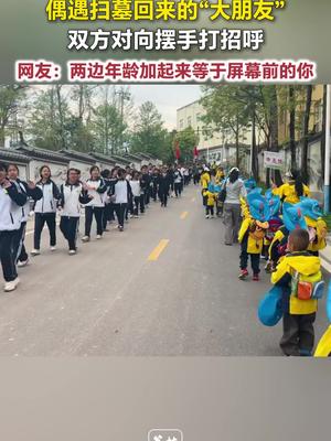 春游路上的幼儿园小朋友,偶遇扫墓回来的“大朋友”,双方对向摆手打招呼。网友:两边年龄加起来等于屏幕前的你