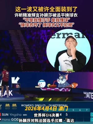 【这一波又被许全面装到了,许昕精准预言孙颖莎被追平换球衣“不是我懂莎莎,是我懂球”“换球衣咋了,换球衣又不犯规”】4日,澳门世界杯女单1/4决赛,孙颖莎对阵法国选手汉娜·高达。孙颖莎在2-0领先的情况下被对手连追两局扳平比分。第四局结束后孙颖莎选择更换球衣。许昕在直播看球中精准预言,表示不是自己懂莎莎,是懂球。