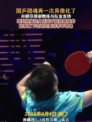 【国乒团魂再一次具像化了,孙颖莎感谢教练与队友支持 想到他们在身后就不能轻易放弃能够赢下这场比赛非常不容易】4日,澳门世界杯女单1/4决赛,孙颖莎苦战七局最终在决胜局一度落后的情况下战胜法国选手汉娜·高达,晋级半决赛。赛后采访中孙颖莎感谢教练与队友支持,想到想到他们在身后就不能轻易放弃,自己能够赢下这场比赛非常不容易。孙颖莎将在半决赛对阵德国选手莎宾·温特。