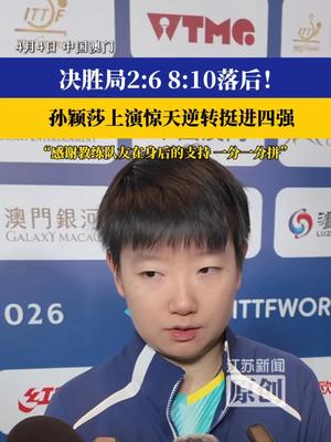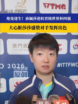 惊天逆转!孙颖莎晋级世界杯四强,孙颖莎说落后也不放弃,孙颖莎感谢教练队友支持。4月4日,2026澳门国际乒联世界杯比赛继续进行,女单1/4决赛中,中国选手孙颖莎对阵埃及小将汉娜·高达,在先赢两局的情况下,孙颖莎被对手连扳三局。此后,双方一路缠斗,进入决胜局,在2:6、8:10落后的不利局面下,孙颖莎沉稳应对,最终逆转取胜,晋级四强。