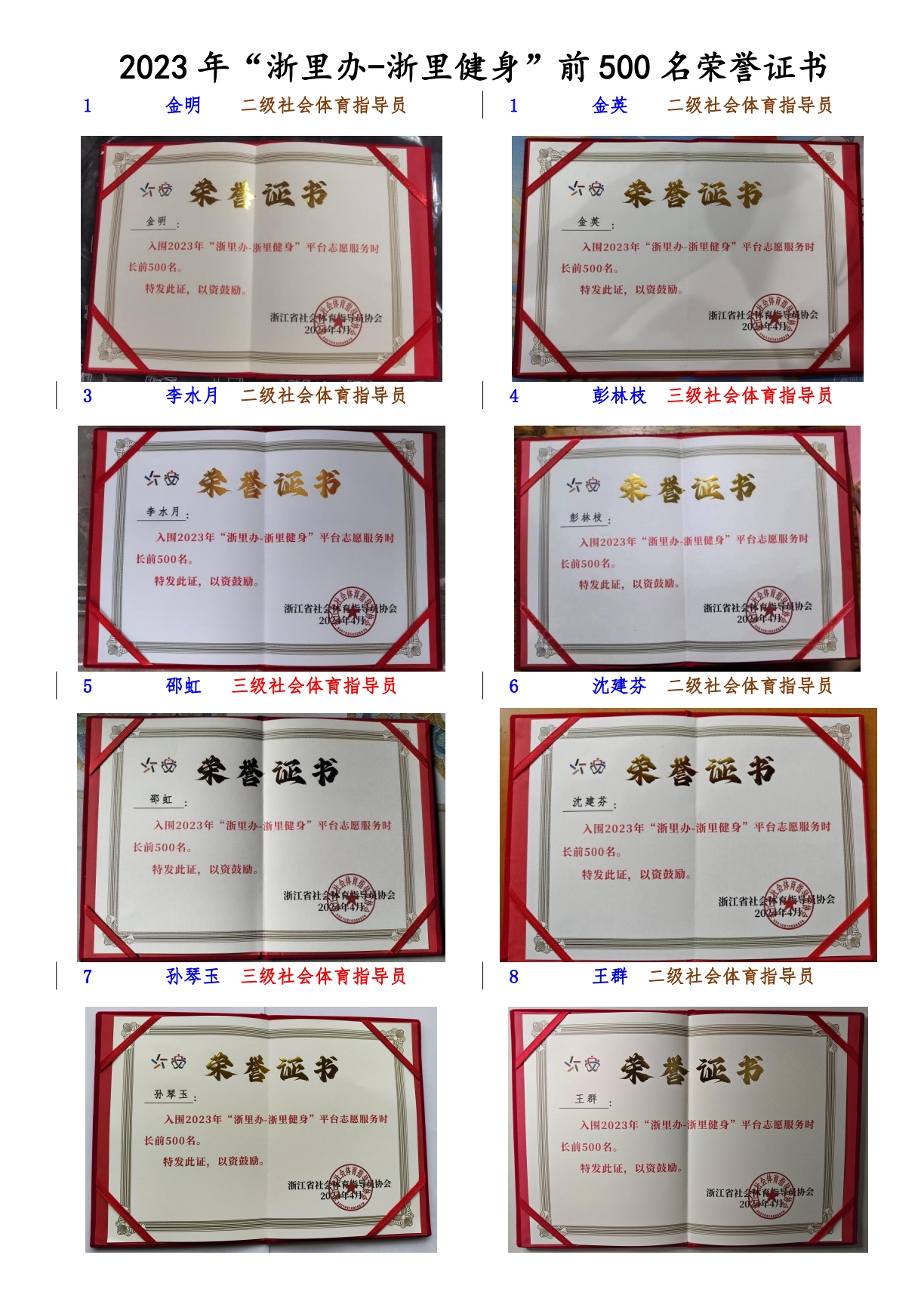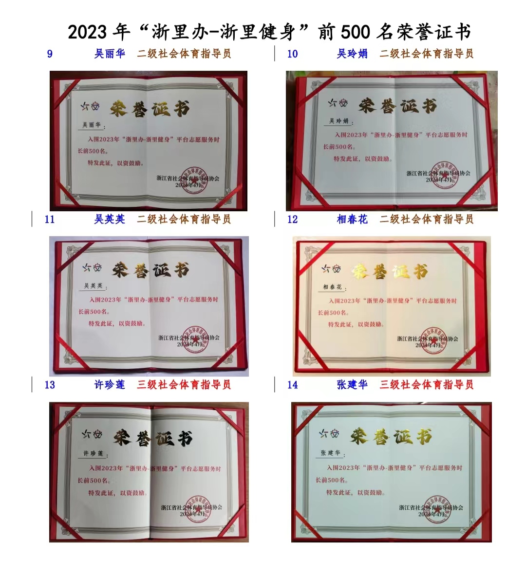 通过荣誉看成效,拱墅户外体协全民健身工作喜讯频传 近几日,杭州市拱墅区户外体育协会会员陆续收到荣誉证书和奖品。协会内的15名会员,凭借她们在全民健身事业中的卓越贡献和无私奉献,成功入围了2023年“浙里办-浙里健身”平台志愿服务时长前500名的光荣榜单,并收到了浙江省社会体育指导员协会寄来的荣誉证书和奖品。 这15位优秀的会员他们是:协会副秘书长兼湖墅街道长乐苑社区体育健身队队长、二级社会体育指导员李水月,协会副秘书长兼东新街道德胜东村社区体育健身队队长、二级社会体育指导员金明,协会副秘书长兼区登山队队长、小河街道紫荆家园社区体育健身队队长、二级社会体育指导员相春花,协会支部委员、大关街道西二社区体育健身队队长、二级社会体育指导员金英,协会支部委员、三级社会体育指导员张建华,协会监事长、二级社会体育指导员吴丽华,协会监事、三级社会体育指导员许珍莲,协会会员、区登山队副队长、二级社会体育指导员王群,协会会员、东新街道沁苑社区体育健身队队长、二级社会体育指导员吴玲娟,协会会员、湖墅街道长乐苑社区体育舞蹈队队长、二级社会体育指导员沈建芬、协会会员、东新街道德胜东村社区健身球操队队长、三级社会体育指导员邵虹,协会会员、半山街道田园社区体育健身队三级社会体育指导员孙琴玉、协会会员、东新街道德胜东村社区体育健身队三级社会体育指导员彭林枝,以及协会会员、湖墅街道长乐苑社区体育健身队二级社会体育指导员吴英英、三级社会体育指导员李斐。她们不仅是协会的中坚力量,更是推动全民健身运动的重要角色。(截止到发稿时,除李斐外,荣誉证书和奖品均已收到。) 这15位优秀会员的荣誉,是对她们长期以来坚持“健体养身、公益养心”运动促健康理念的最好回报。她们积极按照协会自创的“育、趣、行、健”社会体育指导员志愿服务项目的方式,通过自身的努力和实际行动,为提升市民健康水平、推动全民健身运动的发展做出了显著贡献。 此次荣誉的获得,不仅是对这15位会员个人的肯定,更是对拱墅区户外体育协会工作的认可。协会将继续秉持“健体养身、公益养心”的理念,不断创新“育、趣、行、健”服务模式,提升服务质量,在“运动燃起来,争创全民运动健身模范市”活动中再立新功!