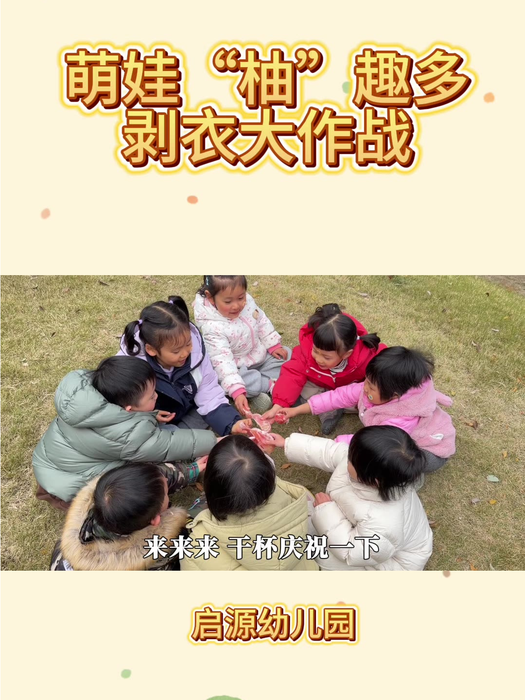 “柚”趣来袭!启源幼儿园里一场热闹的剥柚子大赛欢乐开启!小班的萌娃们围坐成圈,小手使劲揉搓柚子皮,有的抠、有的掰,忙得热火朝天。当厚厚的“外衣”被成功脱下,露出饱满的果肉,孩子们迫不及待塞进嘴里,酸甜的汁水在舌尖散开,一张张笑脸都洋溢着劳动与分享的快乐!