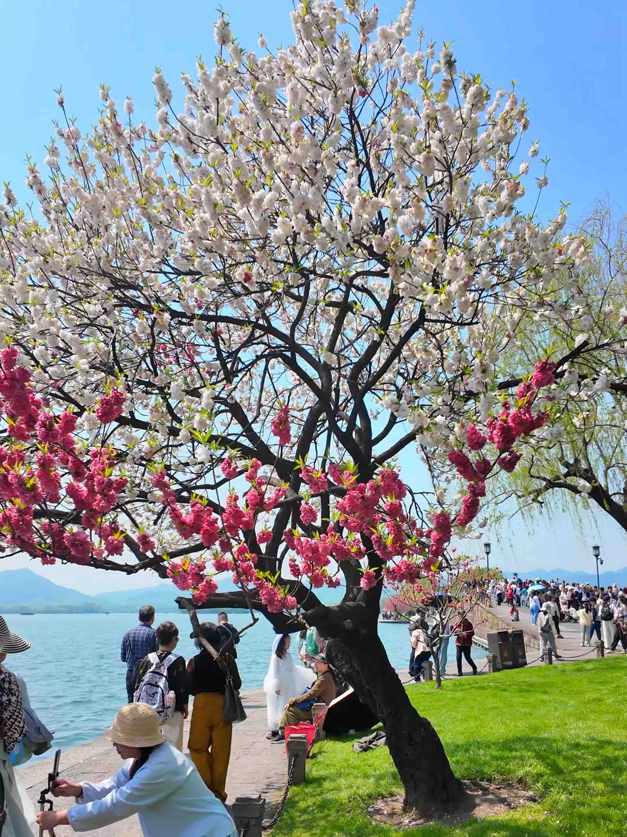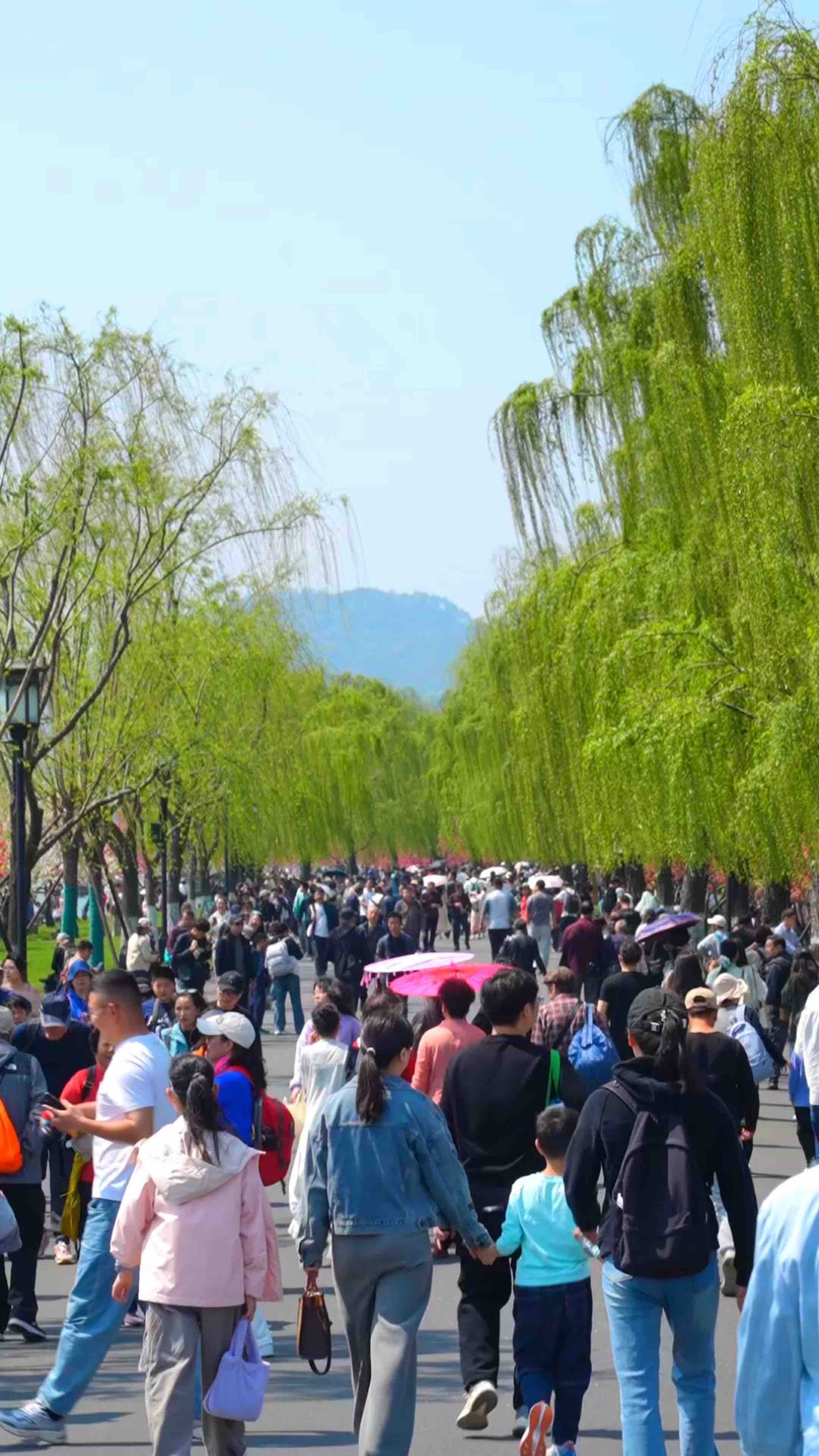 西湖白堤四月天,桃红柳绿碧波连。#杭州西湖#治愈系风景 #镜头里的春日美景 #感受春的气息