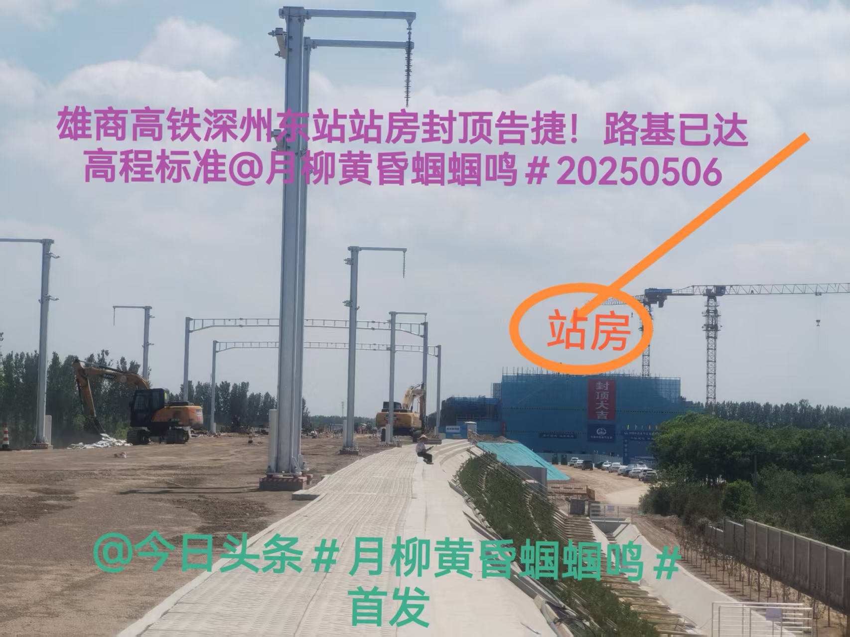 雄商高铁河北衡水市域深州东站站房封顶啦!路基及箱梁铺架进入扫尾,护坡作业加紧进行,线上项目全力推进!蓝色围挡内机械轰鸣。期待2026年10月的复兴号高铁首发日,给历史刻录下河北省深州市交通大基建这一具有地标里程碑意义的大事件!📸🚅