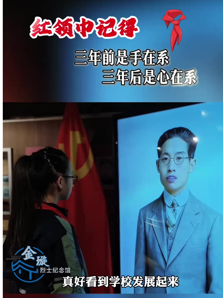 三年前为您系上红领巾,我还是个一年级的孩子;三年后再次为您系上红领巾,我已长成少年的模样。 当年的誓言随风飘过操场;今天回响在纪念馆广场落地。 三年前我学着系好红领巾,那是向您学习的第一步;今天我挺直胸膛站在这里,那是您种在我心里的样子。 一寸红领巾,三载成长路;一句我来看您,满腔未变的情。我与您通过AI 时空对话。