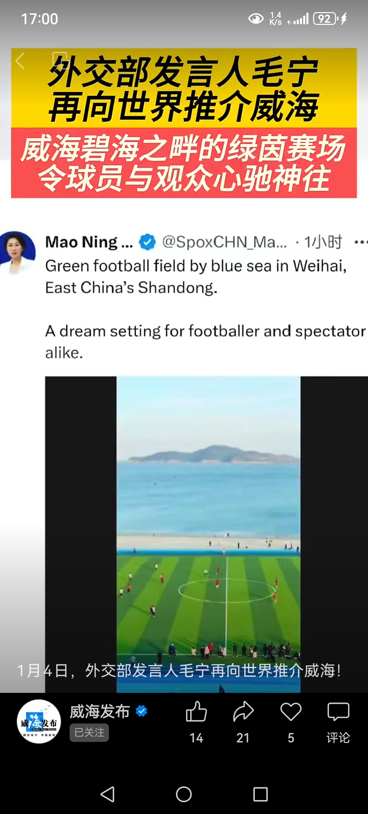 1月4日,外交部发言人毛宁在海外社交平台发文:中国山东威海,碧海之畔的绿茵赛场,令球员与观众心驰神往。 毛宁所提到的绿茵赛场位于我市至海港湾。其自2025年6月28日启用以来,受到社会各界的广泛关注和点赞,先后荣获《威海手册:全球社区可持续发展报告·2025》优秀案例、2025(第八届)城市更新大资管论坛最佳城市更新表率案例等荣誉。