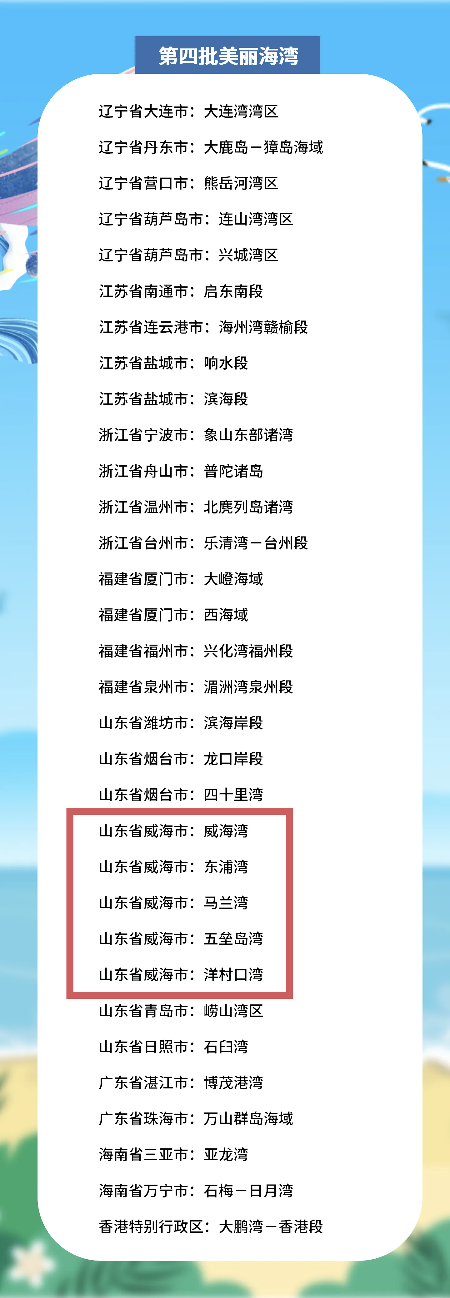 碧海银滩,生态画卷徐徐铺展;人海和谐,美丽海湾再谱新篇。为深入推进美丽中国建设,全面落实全国生态环境保护大会部署,生动展现海洋生态环境保护的最新成果,2025年,生态环境部组织开展了第四批美丽海湾优秀案例征集活动,近日,正式公布第四批美丽海湾优秀案例名单。这些案例在“一湾一策”协同推进近岸海域污染防治、生态保护修复和岸滩环境整治等方面成效显著,是“水清滩净、鱼鸥翔集、人海和谐”美丽海湾的生动样板。