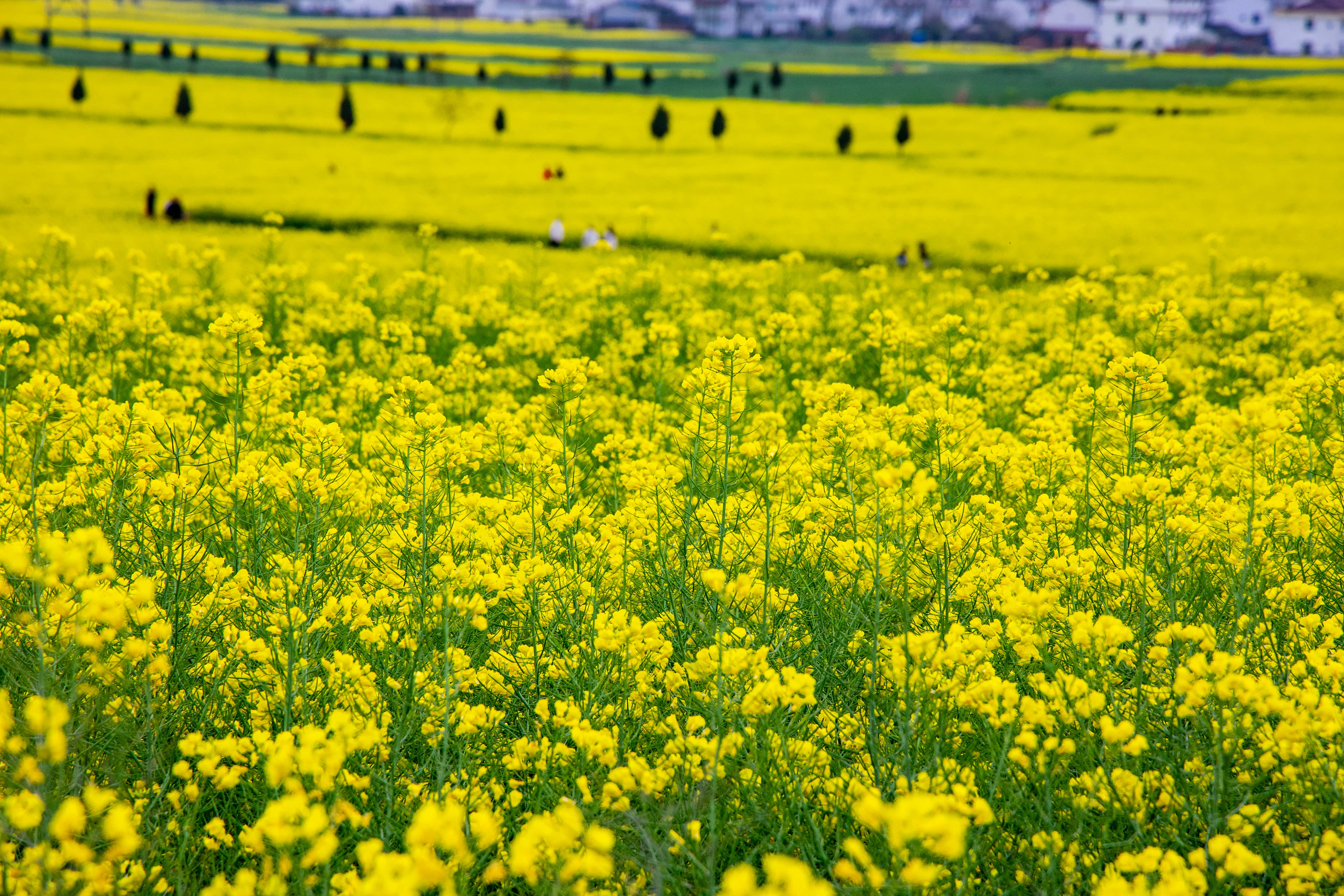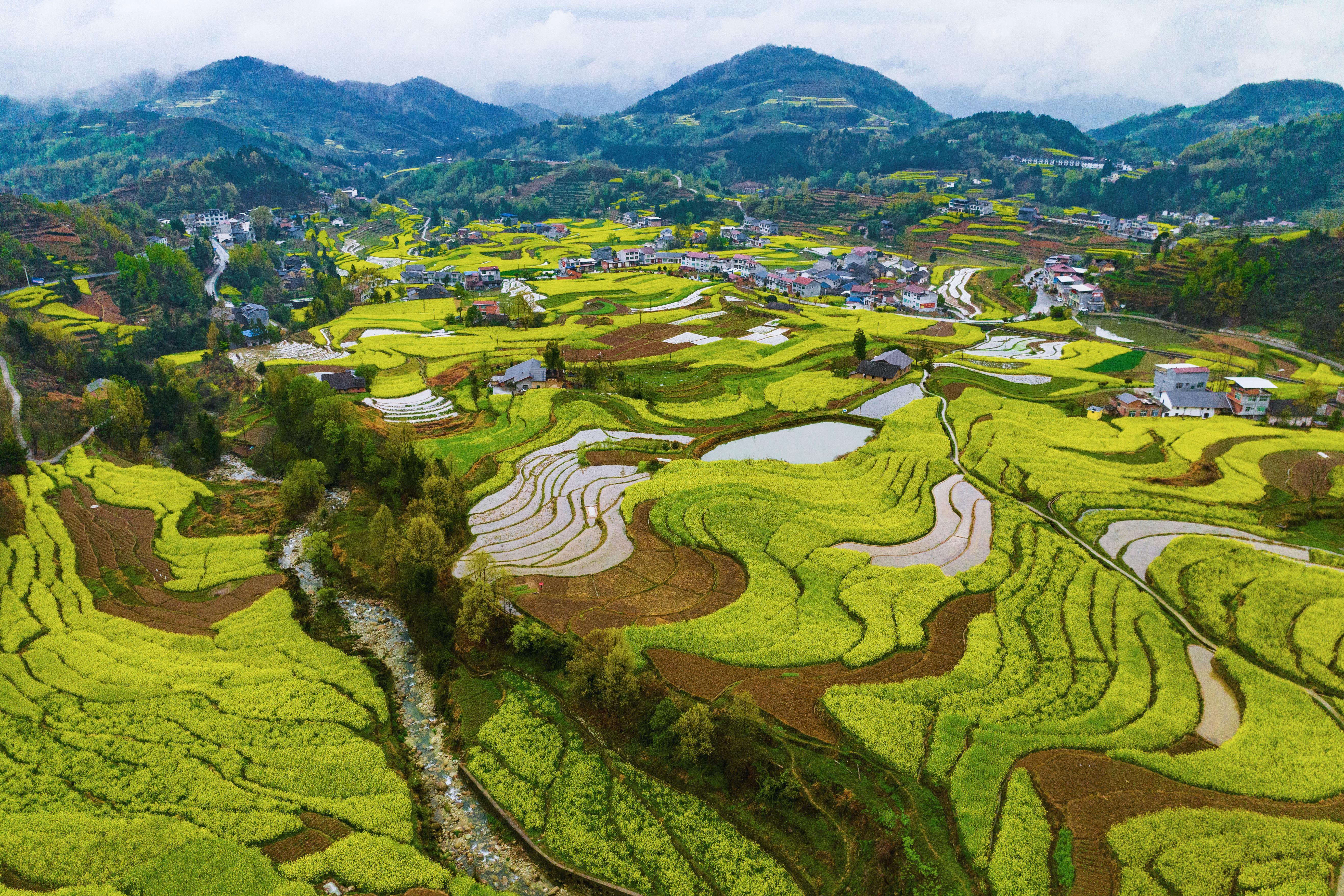 🌼秦巴腹地,邂逅春日金色梦境 阳春三月一定要来汉中秦巴腹地看看!这里百万亩油菜花竞相绽放,直接美到我心巴上😍 连绵起伏的金色花海,就像给大地铺上了一层金色绒毯。微风拂过,花朵轻轻摇曳,泛起层层金色波浪,那叫一个壮观!远处的青山连绵,与这金色花海相互映衬,仿佛一幅天然的山水画卷。而错落其间的村落,又为这幅画卷增添了几分人间烟火气。 漫步在花海中,淡淡的花香萦绕身旁,让人仿佛置身于童话世界。随手一拍都是绝美大片,根本不用加滤镜!无论是和朋友还是家人一起来,都能在这里留下美好的回忆。