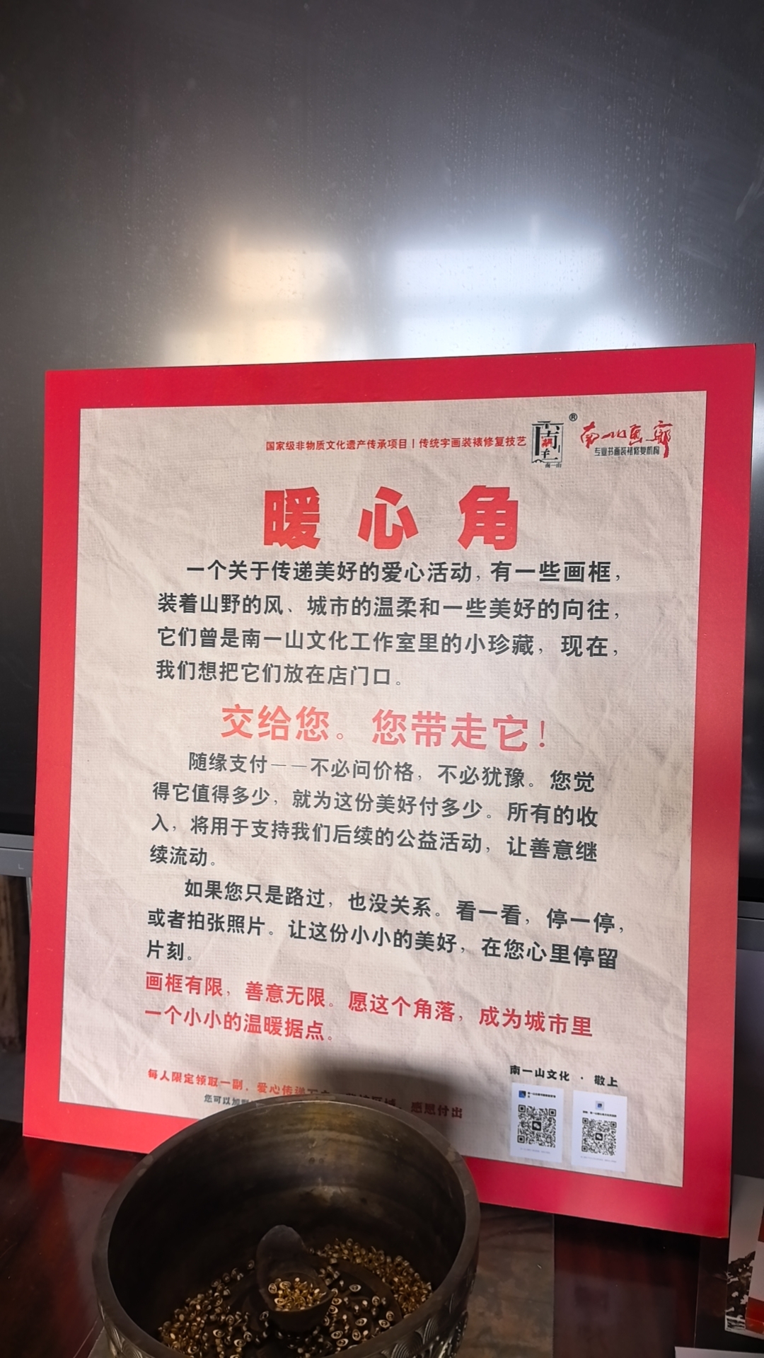暖心角 一个关于馋美好的爱心活动, 芸看山野的风 城市的温柔和一世美好的同往 它们量是南一山文化工作室易的小珍藏,住我们思把它们放在店门口 交给您您带走 请缘支 : 不必同价,不必豫,您觉 得它值得多少,较为这份美好付多少,所有的我人:共用于支持我们后维的公益活动,让组裱装畫書 杭州南一山文化古画修复技艺培训招生了春古老师国家级文物修复技艺培训招生了 修复文物,让历史与我们再次相遇,好想学