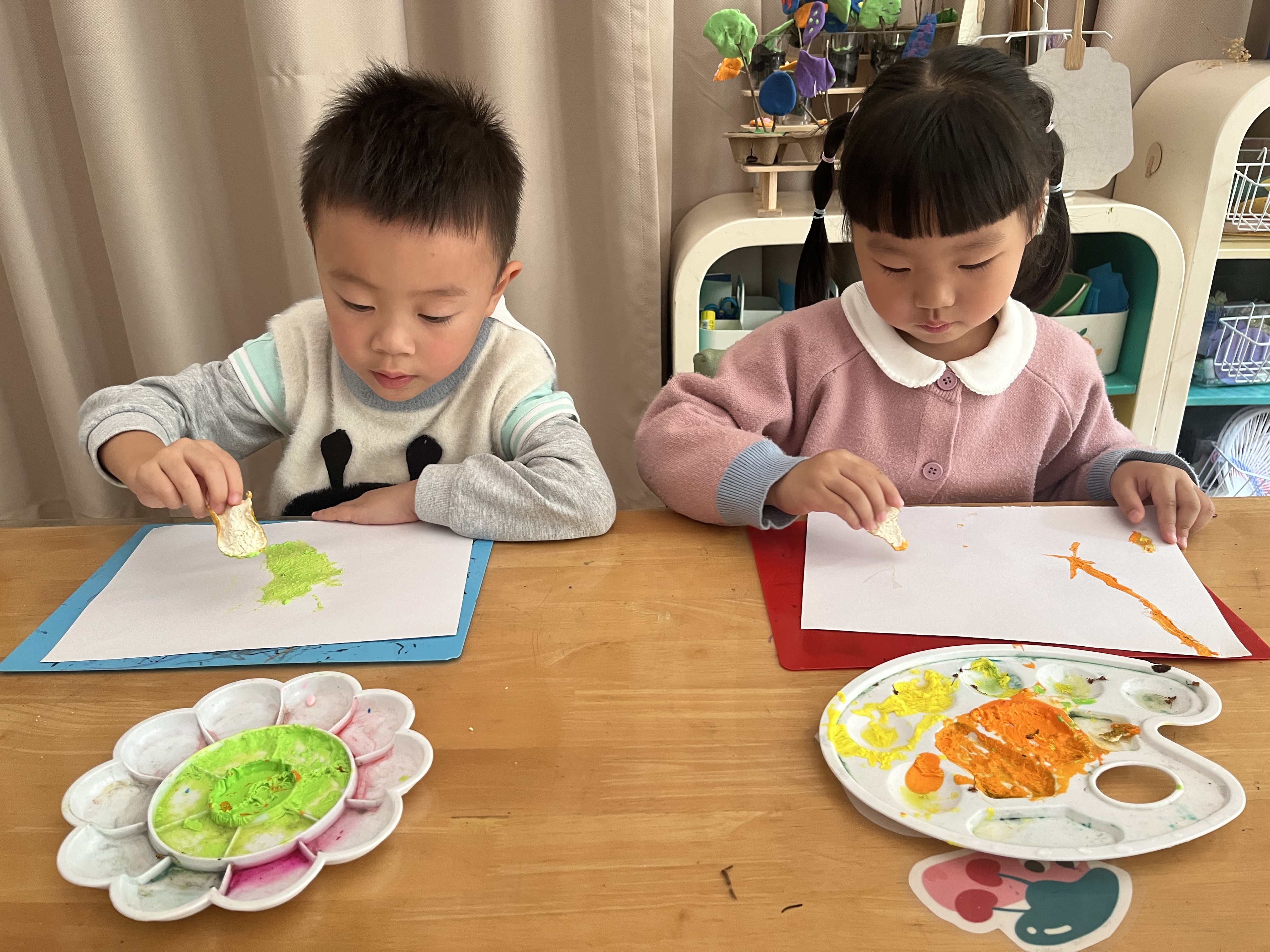 晒好的橘子皮摇身成了画笔!小朋友捏着干皱的陈皮,蘸上鲜亮颜料,在纸上抹出绿意与橙黄。脆韧的陈皮纹理裹着色彩,晕开的痕迹像藏着柑橘的清香,把“废物”玩成独一无二的创作,每一笔都是自然的小惊喜。