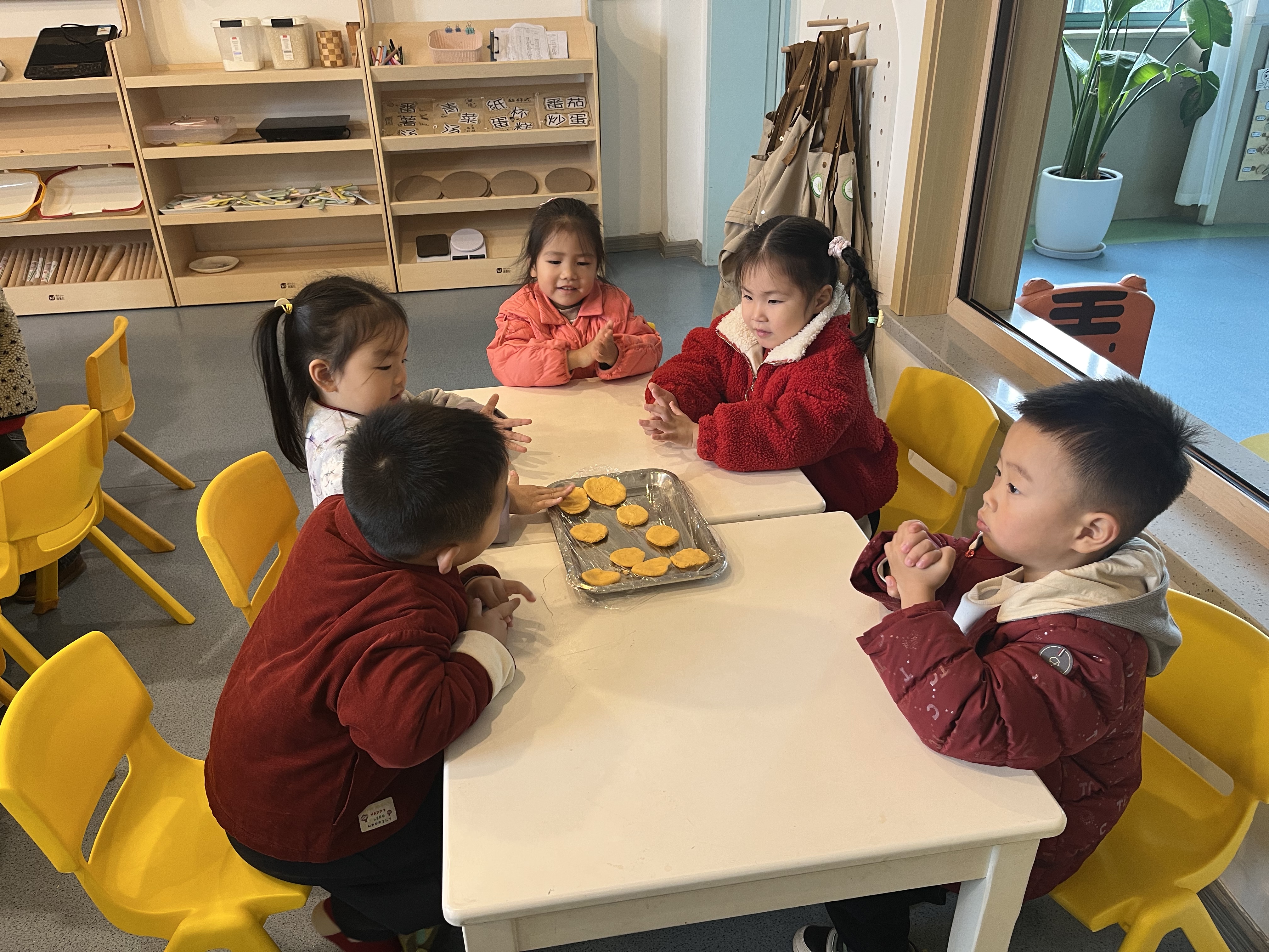 小小的生活空间里,托盘盛着刚出炉的南瓜饼,金黄圆软裹着甜香。几个小朋友围坐桌边,眼神黏在饼上,小手要么轻拍要么攥着,连空气都浸满了暖乎乎的期待——这是藏不住的烟火甜意呀。