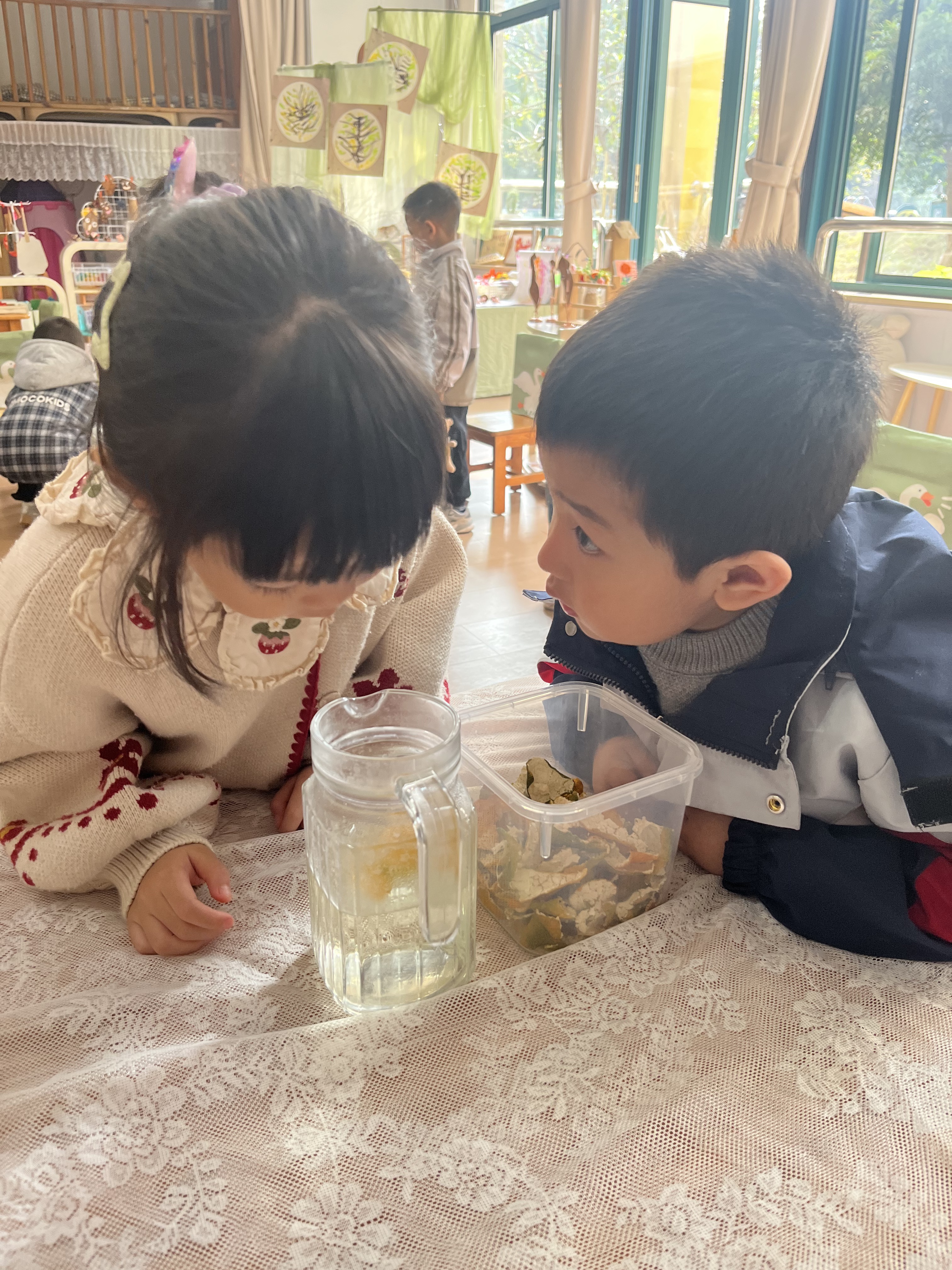 晒好的干陈皮遇上清水,正悄悄施展“魔法”:原本皱缩的果皮在水中舒展变软,清透的水渐渐染上浅黄,柑橘的陈香也跟着在空气里散开。两个小朋友凑着头观察,连呼吸都轻了——这是把秋天的味道泡进了杯子里呀。