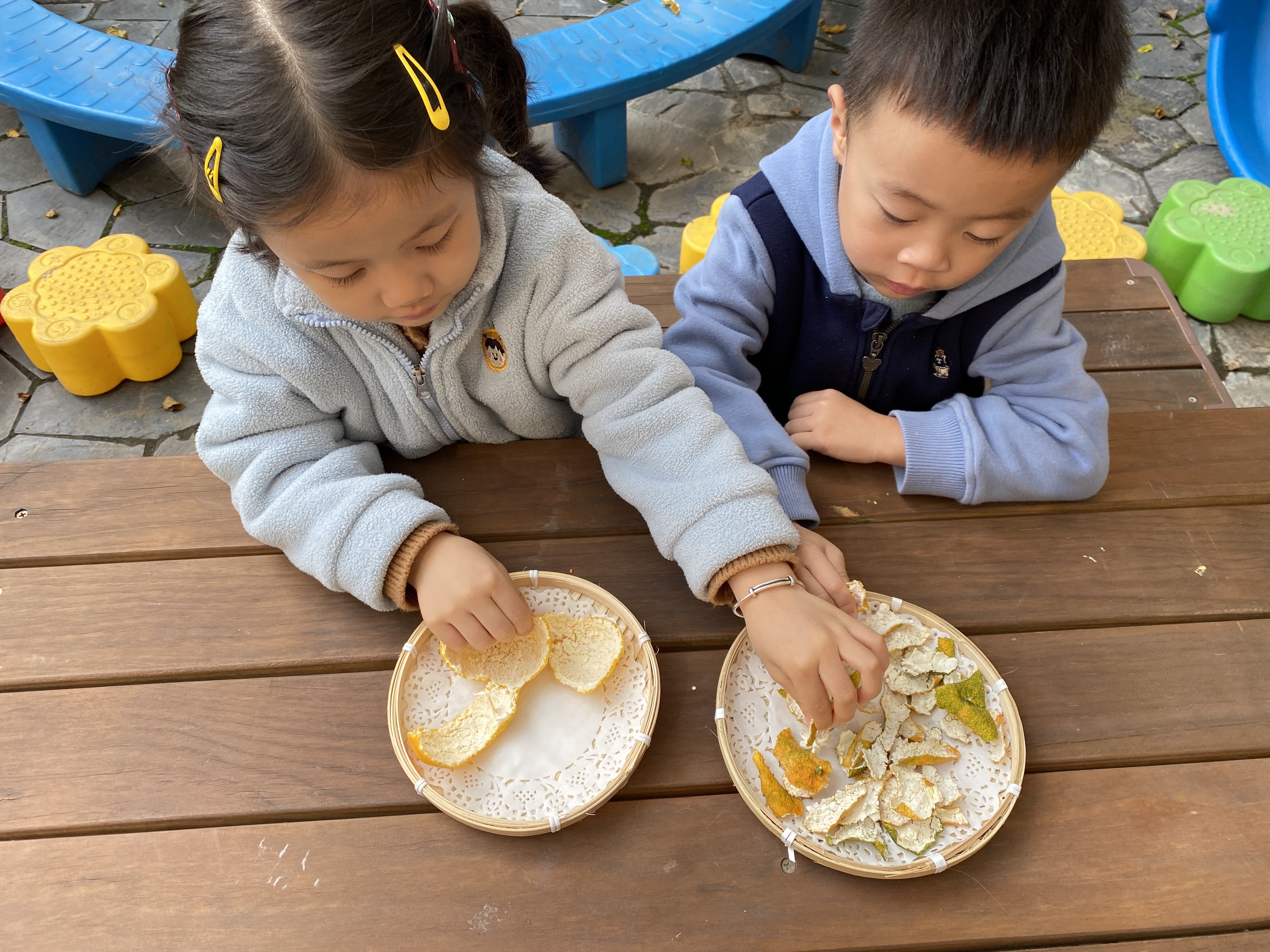 桌上俩小盘子藏着陈皮的“变身术”:左边是刚剥下的湿陈皮,软润鲜亮,裹着柑橘的清甜;右边是晒干的干陈皮,皱巴巴脆生生,气味沉郁醇厚。这是从新鲜果皮到陈香药材的第一步,兰亭中心幼儿园小三班的宝贝们正帮它们完成“干燥蜕变”呢。